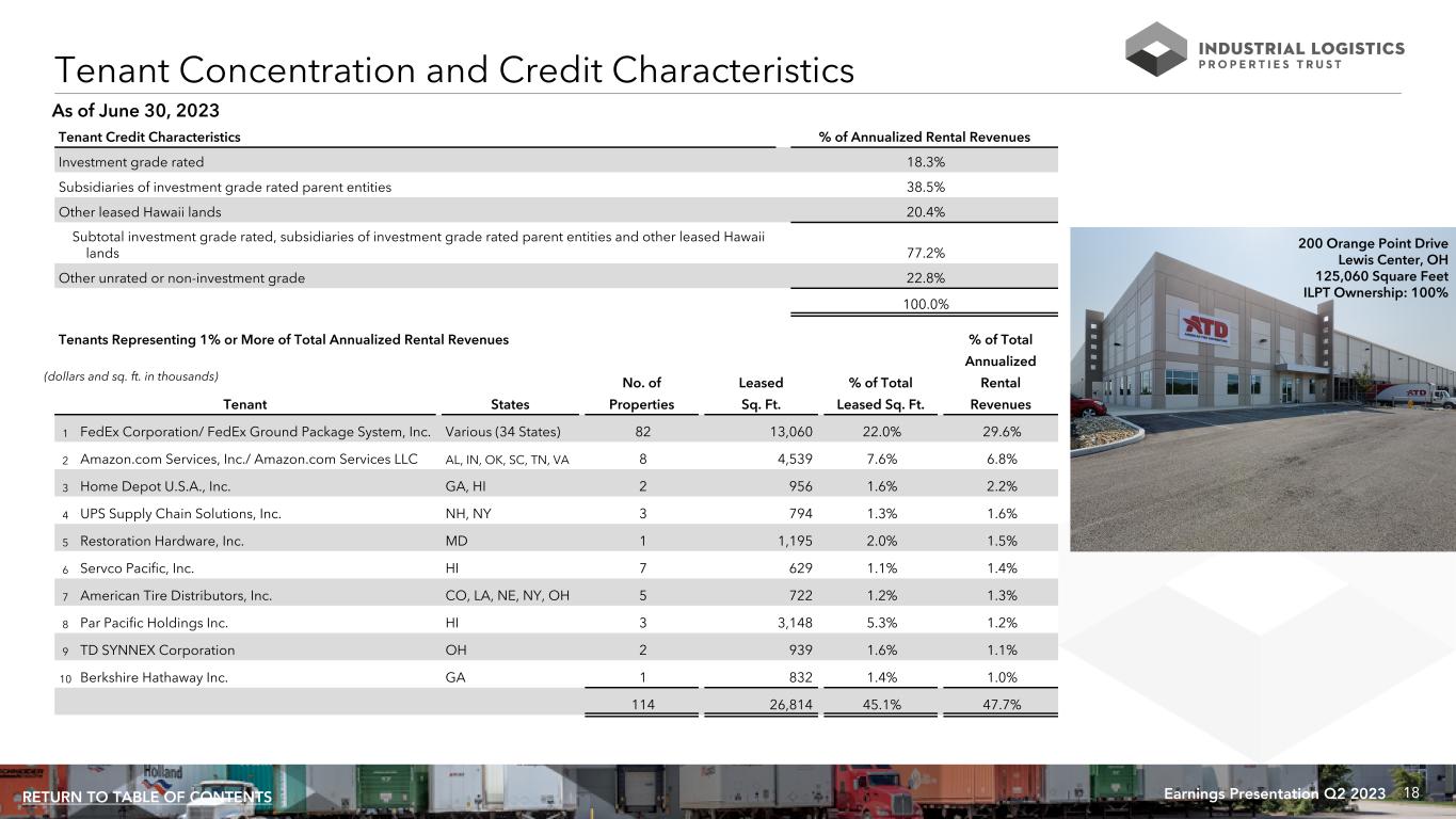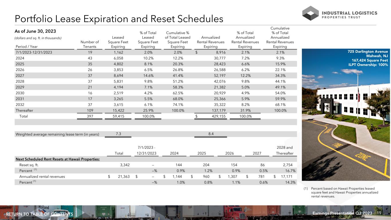 18Earnings Presentation Q2 2023RETURN TO TABLE OF CONTENTS As of June 30, 2023 Tenant Credit Characteristics % of Annualized Rental Revenues Investment grade rated 18.3% Subsidiaries of investment grade rated parent entities 38.5% Other leased Hawaii lands 20.4% Subtotal investment grade rated, subsidiaries of investment grade rated parent entities and other leased Hawaii lands 77.2% Other unrated or non-investment grade 22.8% 100.0% Tenant Concentration and Credit Characteristics 200 Orange Point Drive Lewis Center, OH 125,060 Square Feet ILPT Ownership: 100% Tenants Representing 1% or More of Total Annualized Rental Revenues % of Total Annualized No. of Leased % of Total Rental Tenant States Properties Sq. Ft. Leased Sq. Ft. Revenues 1 FedEx Corporation/ FedEx Ground Package System, Inc. Various (34 States) 82 13,060 22.0% 29.6% 2 Amazon.com Services, Inc./ Amazon.com Services LLC AL, IN, OK, SC, TN, VA 8 4,539 7.6% 6.8% 3 Home Depot U.S.A., Inc. GA, HI 2 956 1.6% 2.2% 4 UPS Supply Chain Solutions, Inc. NH, NY 3 794 1.3% 1.6% 5 Restoration Hardware, Inc. MD 1 1,195 2.0% 1.5% 6 Servco Pacific, Inc. HI 7 629 1.1% 1.4% 7 American Tire Distributors, Inc. CO, LA, NE, NY, OH 5 722 1.2% 1.3% 8 Par Pacific Holdings Inc. HI 3 3,148 5.3% 1.2% 9 TD SYNNEX Corporation OH 2 939 1.6% 1.1% 10 Berkshire Hathaway Inc. GA 1 832 1.4% 1.0% 114 26,814 45.1% 47.7% (dollars and sq. ft. in thousands)
