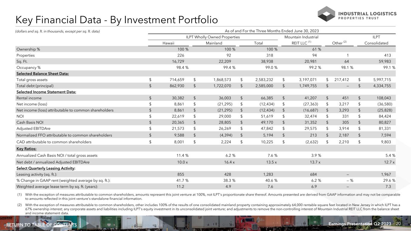 20Earnings Presentation Q2 2023RETURN TO TABLE OF CONTENTS (dollars and sq. ft. in thousands, except per sq. ft. data) Key Financial Data - By Investment Portfolio As of and For the Three Months Ended June 30, 2023 ILPT Wholly Owned Properties Mountain Industrial ILPT Hawaii Mainland Total REIT LLC (1) Other (2) Consolidated Ownership % 100 % 100 % 100 % 61 % Properties 226 92 318 94 1 413 Sq. Ft. 16,729 22,209 38,938 20,981 64 59,983 Occupancy % 98.4 % 99.4 % 99.0 % 99.2 % 98.1 % 99.1 % Selected Balance Sheet Data: Total gross assets $ 714,659 $ 1,868,573 $ 2,583,232 $ 3,197,071 $ 217,412 $ 5,997,715 Total debt (principal) $ 862,930 $ 1,722,070 $ 2,585,000 $ 1,749,755 $ — $ 4,334,755 Selected Income Statement Data: Rental income $ 30,382 $ 36,003 $ 66,385 $ 41,207 $ 451 $ 108,043 Net income (loss) $ 8,861 $ (21,295) $ (12,434) $ (27,363) $ 3,217 $ (36,580) Net income (loss) attributable to common shareholders $ 8,861 $ (21,295) $ (12,434) $ (16,687) $ 3,293 $ (25,828) NOI $ 22,619 $ 29,000 $ 51,619 $ 32,474 $ 331 $ 84,424 Cash Basis NOI $ 20,365 $ 28,805 $ 49,170 $ 31,352 $ 305 $ 80,827 Adjusted EBITDAre $ 21,573 $ 26,269 $ 47,842 $ 29,575 $ 3,914 $ 81,331 Normalized FFO attributable to common shareholders $ 9,588 $ (4,394) $ 5,194 $ 213 $ 2,187 $ 7,594 CAD attributable to common shareholders $ 8,001 $ 2,224 $ 10,225 $ (2,632) $ 2,210 $ 9,803 Key Ratios: Annualized Cash Basis NOI / total gross assets 11.4 % 6.2 % 7.6 % 3.9 % 5.4 % Net debt / annualized Adjusted EBITDAre 10.0 x 16.4 x 13.5 x 13.7 x 12.7 x Select Quarterly Leasing Activity: Leasing activity (sq. ft.): 855 428 1,283 684 — 1,967 % Change in GAAP rent (weighted average by sq. ft.): 41.7 % 38.3 % 40.6 % 6.2 % — % 29.6 % Weighted average lease term by sq. ft. (years): 11.2 4.9 7.6 6.9 — 7.3 (1) With the exception of measures attributable to common shareholders, amounts represent this joint venture at 100%, not ILPT's proportionate share thereof. Amounts presented are derived from GAAP information and may not be comparable to amounts reflected in this joint venture's standalone financial information. (2) With the exception of measures attributable to common shareholders, other includes 100% of the results of one consolidated mainland property containing approximately 64,000 rentable square feet located in New Jersey in which ILPT has a 67% ownership interest; any corporate assets and liabilities including ILPT's equity investment in its unconsolidated joint venture; and adjustments to remove the non-controlling interest of Mountain Industrial REIT LLC from the balance sheet and income statement data.