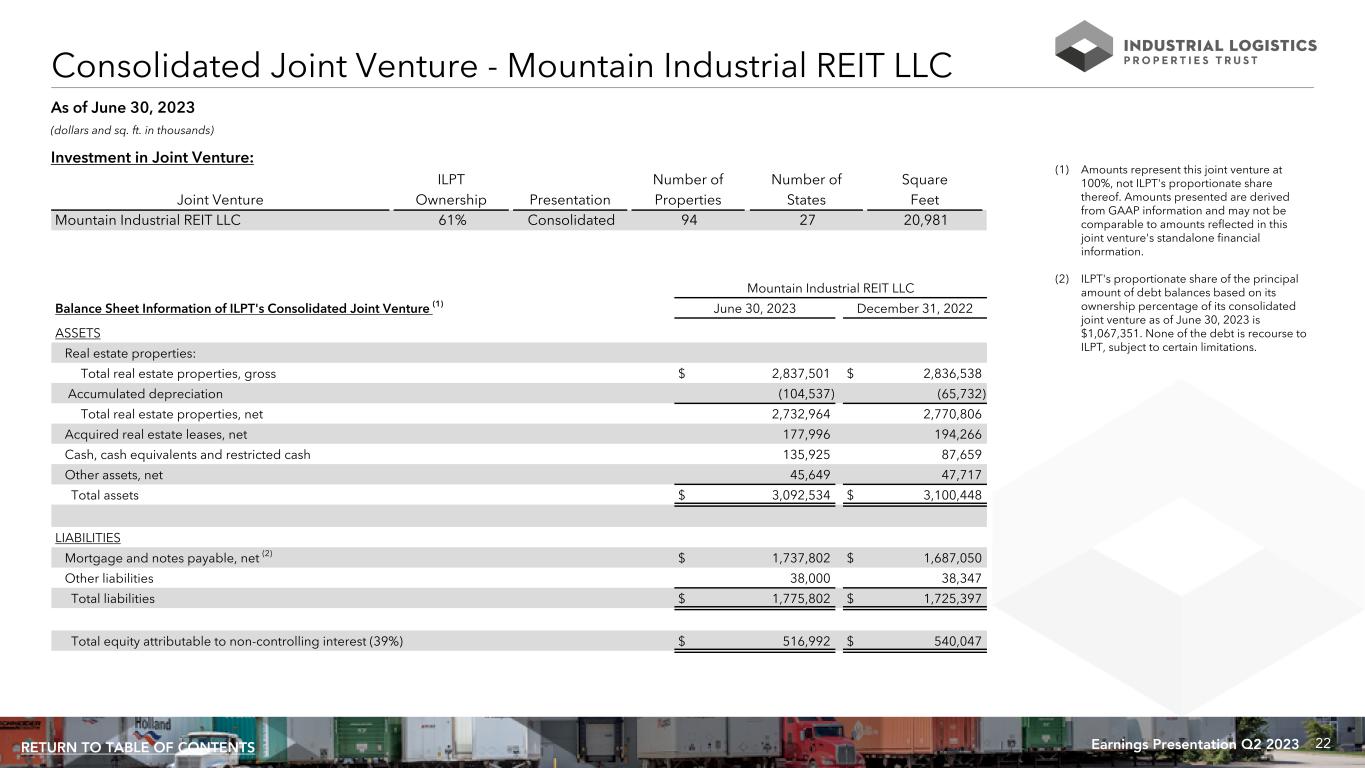 22Earnings Presentation Q2 2023RETURN TO TABLE OF CONTENTS Consolidated Joint Venture - Mountain Industrial REIT LLC (dollars and sq. ft. in thousands) Investment in Joint Venture: ILPT Number of Number of Square Joint Venture Ownership Presentation Properties States Feet Mountain Industrial REIT LLC 61% Consolidated 94 27 20,981 (1) Amounts represent this joint venture at 100%, not ILPT's proportionate share thereof. Amounts presented are derived from GAAP information and may not be comparable to amounts reflected in this joint venture's standalone financial information. (2) ILPT's proportionate share of the principal amount of debt balances based on its ownership percentage of its consolidated joint venture as of June 30, 2023 is $1,067,351. None of the debt is recourse to ILPT, subject to certain limitations. As of June 30, 2023 Mountain Industrial REIT LLC Balance Sheet Information of ILPT's Consolidated Joint Venture (1) June 30, 2023 December 31, 2022 ASSETS Real estate properties: Total real estate properties, gross $ 2,837,501 $ 2,836,538 Accumulated depreciation (104,537) (65,732) Total real estate properties, net 2,732,964 2,770,806 Acquired real estate leases, net 177,996 194,266 Cash, cash equivalents and restricted cash 135,925 87,659 Other assets, net 45,649 47,717 Total assets $ 3,092,534 $ 3,100,448 LIABILITIES Mortgage and notes payable, net (2) $ 1,737,802 $ 1,687,050 Other liabilities 38,000 38,347 Total liabilities $ 1,775,802 $ 1,725,397 Total equity attributable to non-controlling interest (39%) $ 516,992 $ 540,047