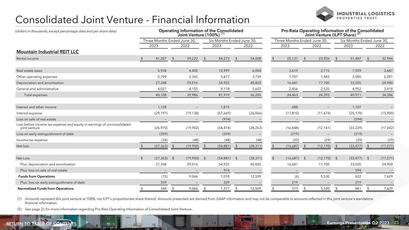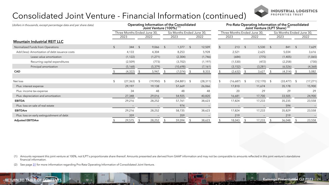 23Earnings Presentation Q2 2023RETURN TO TABLE OF CONTENTS Consolidated Joint Venture - Financial Information Operating Information of the Consolidated Joint Venture (100%) (1) Pro-Rata Operating Information of the Consolidated Joint Venture (ILPT Share) (2) Three Months Ended June 30, Six Months Ended June 30, Three Months Ended June 30, Six Months Ended June 30, 2023 2022 2023 2022 2023 2022 2023 2022 Mountain Industrial REIT LLC Rental income $ 41,207 $ 39,222 $ 84,273 $ 54,008 $ 25,137 $ 23,926 $ 51,407 $ 32,944 Real estate taxes 5,934 4,450 12,999 6,044 3,619 2,715 7,929 3,687 Other operating expenses 2,799 2,365 5,877 3,739 1,707 1,443 3,585 2,281 Depreciation and amortization 27,348 29,016 54,925 40,820 16,681 17,700 33,505 24,900 General and administrative 4,027 4,155 8,118 5,602 2,456 2,535 4,952 3,418 Total expenses 40,108 39,986 81,919 56,205 24,463 24,393 49,971 34,286 Interest and other income 1,128 — 1,815 — 688 — 1,107 — Interest expense (29,197) (19,138) (57,669) (26,066) (17,810) (11,674) (35,178) (15,900) Loss on sale of real estate — — (974) — — — (594) — Loss before income tax expense and equity in earnings of unconsolidated joint venture (26,970) (19,902) (54,474) (28,263) (16,448) (12,141) (33,229) (17,242) Loss on early extinguishment of debt (359) — (359) — (219) — (219) — Income tax expense (34) (48) (48) (48) (20) (29) (29) (29) Net loss $ (27,363) $ (19,950) $ (54,881) $ (28,311) $ (16,687) $ (12,170) $ (33,477) $ (17,271) Net Loss $ (27,363) $ (19,950) $ (54,881) $ (28,311) $ (16,687) $ (12,170) $ (33,477) $ (17,271) Plus: depreciation and amortization 27,348 29,016 54,925 40,820 16,681 17,700 33,505 24,900 Plus: loss on sale of real estate — — 974 — — — 594 — Funds from Operations (15) 9,066 1,018 12,509 (6) 5,530 622 7,629 Plus: loss on early extinguishment of debt 359 — 359 — 219 — 219 — Normalized Funds from Operations $ 344 $ 9,066 $ 1,377 $ 12,509 $ 213 $ 5,530 $ 841 $ 7,629 (dollars in thousands, except percentage data and per share data) (1) Amounts represent this joint venture at 100%, not ILPT's proportionate share thereof. Amounts presented are derived from GAAP information and may not be comparable to amounts reflected in this joint venture's standalone financial information. (2) See page 31 for more information regarding Pro-Rata Operating Information of Consolidated Joint Venture.