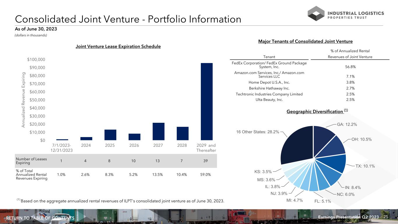 24Earnings Presentation Q2 2023RETURN TO TABLE OF CONTENTS Consolidated Joint Venture - Financial Information (continued) Operating Information of the Consolidated Joint Venture (100%) (1) Pro-Rata Operating Information of the Consolidated Joint Venture (ILPT Share) (2) Three Months Ended June 30, Six Months Ended June 30, Three Months Ended June 30, Six Months Ended June 30, 2023 2022 2023 2022 2023 2022 2023 2022 Mountain Industrial REIT LLC Normalized Funds from Operations $ 344 $ 9,066 $ 1,377 $ 12,509 $ 213 $ 5,530 $ 841 $ 7,629 Add (less): Amortization of debt issuance costs 4,133 4,304 8,253 5,928 2,521 2,625 5,034 3,616 Lease value amortization (1,122) (1,271) (2,304) (1,746) (684) (775) (1,405) (1,065) Recurring capital expenditures (2,509) (773) (3,702) (1,197) (1,530) (472) (2,258) (730) Principal amortization (5,168) (5,379) (10,698) (7,161) (3,152) (3,281) (6,526) (4,368) CAD $ (4,322) $ 5,947 $ (7,074) $ 8,333 $ (2,632) $ 3,627 $ (4,314) $ 5,082 Net loss $ (27,363) $ (19,950) $ (54,881) $ (28,311) $ (16,687) $ (12,170) $ (33,477) $ (17,271) Plus: interest expense 29,197 19,138 57,669 26,066 17,810 11,674 35,178 15,900 Plus: income tax expense 34 48 48 48 20 29 29 29 Plus: depreciation and amortization 27,348 29,016 54,925 40,820 16,681 17,700 33,505 24,900 EBITDA 29,216 28,252 57,761 38,623 17,824 17,233 35,235 23,558 Plus: loss on sale of real estate — — 974 — — — 594 — EBITDAre 29,216 28,252 58,735 38,623 17,824 17,233 35,829 23,558 Plus: loss on early extinguishment of debt 359 — 359 — 219 — 219 — Adjusted EBITDAre $ 29,575 $ 28,252 $ 59,094 $ 38,623 $ 18,043 $ 17,233 $ 36,048 $ 23,558 (dollars in thousands, except percentage data and per share data) (1) Amounts represent this joint venture at 100%, not ILPT's proportionate share thereof. Amounts presented are derived from GAAP information and may not be comparable to amounts reflected in this joint venture's standalone financial information. (2) See page 31 for more information regarding Pro-Rata Operating Information of Consolidated Joint Venture.