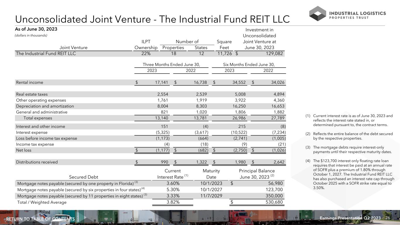 25Earnings Presentation Q2 2023RETURN TO TABLE OF CONTENTS GA: 12.2% OH: 10.5% TX: 10.1% IN: 8.4% NC: 6.0% FL: 5.1%MI: 4.7% NJ: 3.9% IL: 3.8% MS: 3.6% KS: 3.5% 16 Other States: 28.2% Consolidated Joint Venture - Portfolio Information (dollars in thousands) Number of Leases Expiring 1 4 8 10 13 7 39 % of Total Annualized Rental Revenues Expiring 1.0% 2.6% 8.3% 5.2% 13.5% 10.4% 59.0% A nn ua liz ed R ev en ue E xp ir in g 7/1/2023- 12/31/2023 2024 2025 2026 2027 2028 2029 and Thereafter $0 $10,000 $20,000 $30,000 $40,000 $50,000 $60,000 $70,000 $80,000 $90,000 $100,000 Joint Venture Lease Expiration Schedule As of June 30, 2023 Major Tenants of Consolidated Joint Venture % of Annualized Rental Tenant Revenues of Joint Venture FedEx Corporation/ FedEx Ground Package System, Inc. 56.8% Amazon.com Services, Inc./ Amazon.com Services LLC 7.1% Home Depot U.S.A., Inc. 3.8% Berkshire Hathaway Inc. 2.7% Techtronic Industries Company Limited 2.5% Ulta Beauty, Inc. 2.5% Geographic Diversification (1) (1) Based on the aggregate annualized rental revenues of ILPT's consolidated joint venture as of June 30, 2023.