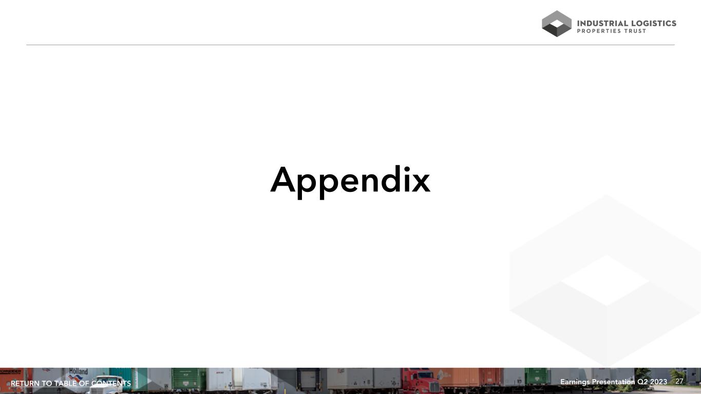 26Earnings Presentation Q2 2023RETURN TO TABLE OF CONTENTS Unconsolidated Joint Venture - The Industrial Fund REIT LLC (dollars in thousands) As of June 30, 2023 Investment in Unconsolidated ILPT Number of Square Joint Venture at Joint Venture Ownership Properties States Feet June 30, 2023 The Industrial Fund REIT LLC 22% 18 12 11,726 $ 129,082 Three Months Ended June 30, Six Months Ended June 30, 2023 2022 2023 2022 Rental income $ 17,141 $ 16,738 $ 34,552 $ 34,026 Real estate taxes 2,554 2,539 5,008 4,894 Other operating expenses 1,761 1,919 3,922 4,360 Depreciation and amortization 8,004 8,303 16,250 16,653 General and administrative 821 1,020 1,806 1,882 Total expenses 13,140 13,781 26,986 27,789 Interest and other income 151 (4) 215 (8) Interest expense (5,325) (3,617) (10,522) (7,234) Loss before income tax expense (1,173) (664) (2,741) (1,005) Income tax expense (4) (18) (9) (21) Net loss $ (1,177) $ (682) $ (2,750) $ (1,026) Distributions received $ 990 $ 1,322 $ 1,980 $ 2,642 Current Maturity Principal Balance Secured Debt Interest Rate (1) Date June 30, 2023 (2) Mortgage notes payable (secured by one property in Florida) (3) 3.60% 10/1/2023 $ 56,980 Mortgage notes payable (secured by six properties in four states) (4) 5.30% 10/1/2027 123,700 Mortgage notes payable (secured by 11 properties in eight states) (3) 3.33% 11/7/2029 350,000 Total / Weighted Average 3.82% $ 530,680 (1) Current interest rate is as of June 30, 2023 and reflects the interest rate stated in, or determined pursuant to, the contract terms. (2) Reflects the entire balance of the debt secured by the respective properties. (3) The mortgage debts require interest-only payments until their respective maturity dates. (4) The $123,700 interest only floating rate loan requires that interest be paid at an annual rate of SOFR plus a premium of 1.80% through October 1, 2027. The Industrial Fund REIT LLC has also purchased an interest rate cap through October 2025 with a SOFR strike rate equal to 3.50%.