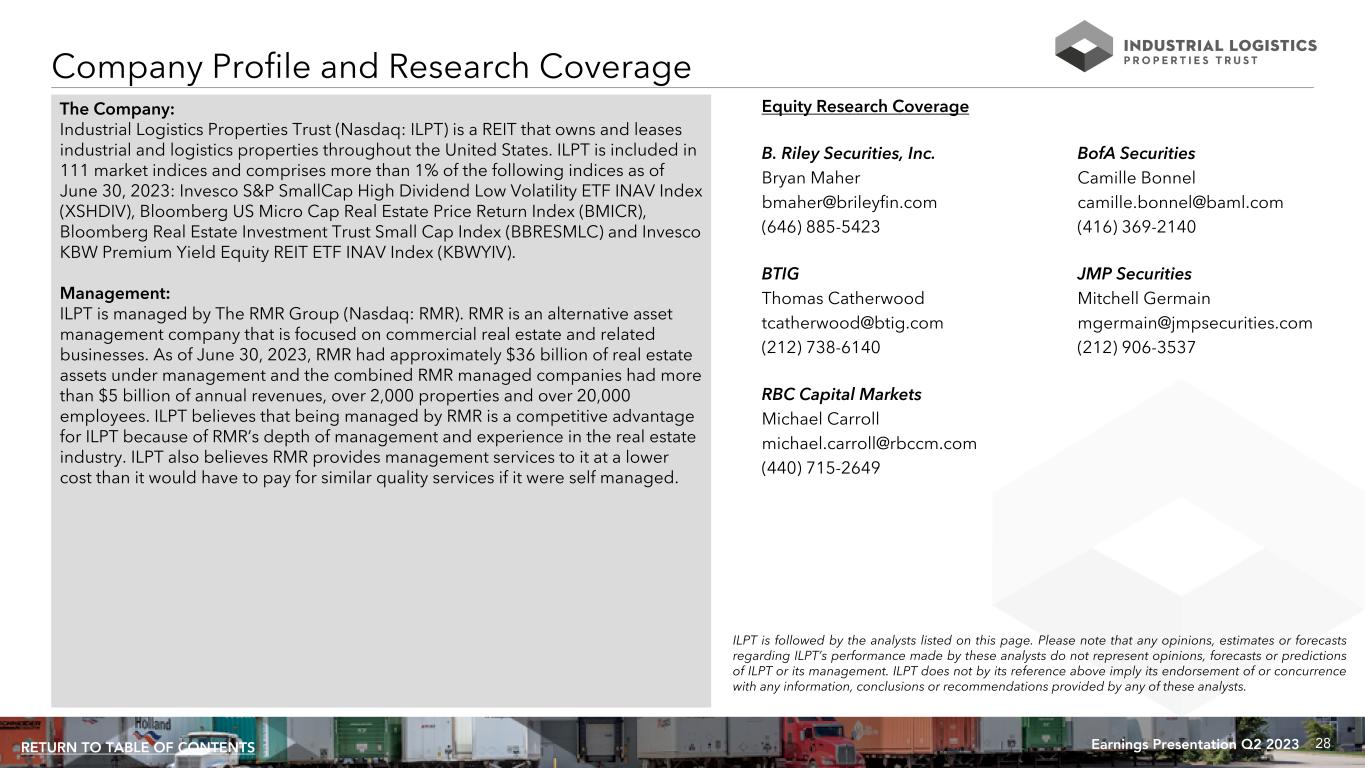 28Earnings Presentation Q2 2023RETURN TO TABLE OF CONTENTS Company Profile and Research Coverage The Company: Industrial Logistics Properties Trust (Nasdaq: ILPT) is a REIT that owns and leases industrial and logistics properties throughout the United States. ILPT is included in 111 market indices and comprises more than 1% of the following indices as of June 30, 2023: Invesco S&P SmallCap High Dividend Low Volatility ETF INAV Index (XSHDIV), Bloomberg US Micro Cap Real Estate Price Return Index (BMICR), Bloomberg Real Estate Investment Trust Small Cap Index (BBRESMLC) and Invesco KBW Premium Yield Equity REIT ETF INAV Index (KBWYIV). Management: ILPT is managed by The RMR Group (Nasdaq: RMR). RMR is an alternative asset management company that is focused on commercial real estate and related businesses. As of June 30, 2023, RMR had approximately $36 billion of real estate assets under management and the combined RMR managed companies had more than $5 billion of annual revenues, over 2,000 properties and over 20,000 employees. ILPT believes that being managed by RMR is a competitive advantage for ILPT because of RMR’s depth of management and experience in the real estate industry. ILPT also believes RMR provides management services to it at a lower cost than it would have to pay for similar quality services if it were self managed. Equity Research Coverage B. Riley Securities, Inc. BofA Securities Bryan Maher Camille Bonnel bmaher@brileyfin.com camille.bonnel@baml.com (646) 885-5423 (416) 369-2140 BTIG JMP Securities Thomas Catherwood Mitchell Germain tcatherwood@btig.com mgermain@jmpsecurities.com (212) 738-6140 (212) 906-3537 RBC Capital Markets Michael Carroll michael.carroll@rbccm.com (440) 715-2649 ILPT is followed by the analysts listed on this page. Please note that any opinions, estimates or forecasts regarding ILPT’s performance made by these analysts do not represent opinions, forecasts or predictions of ILPT or its management. ILPT does not by its reference above imply its endorsement of or concurrence with any information, conclusions or recommendations provided by any of these analysts.