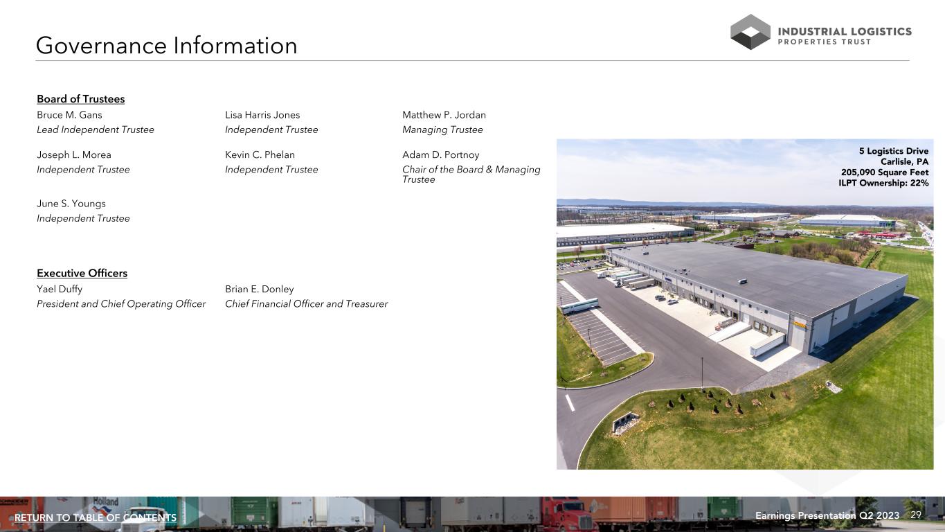 29Earnings Presentation Q2 2023RETURN TO TABLE OF CONTENTS Governance Information Board of Trustees Bruce M. Gans Lisa Harris Jones Matthew P. Jordan Lead Independent Trustee Independent Trustee Managing Trustee Joseph L. Morea Kevin C. Phelan Adam D. Portnoy Independent Trustee Independent Trustee Chair of the Board & Managing Trustee June S. Youngs Independent Trustee Executive Officers Yael Duffy Brian E. Donley President and Chief Operating Officer Chief Financial Officer and Treasurer 5 Logistics Drive Carlisle, PA 205,090 Square Feet ILPT Ownership: 22%