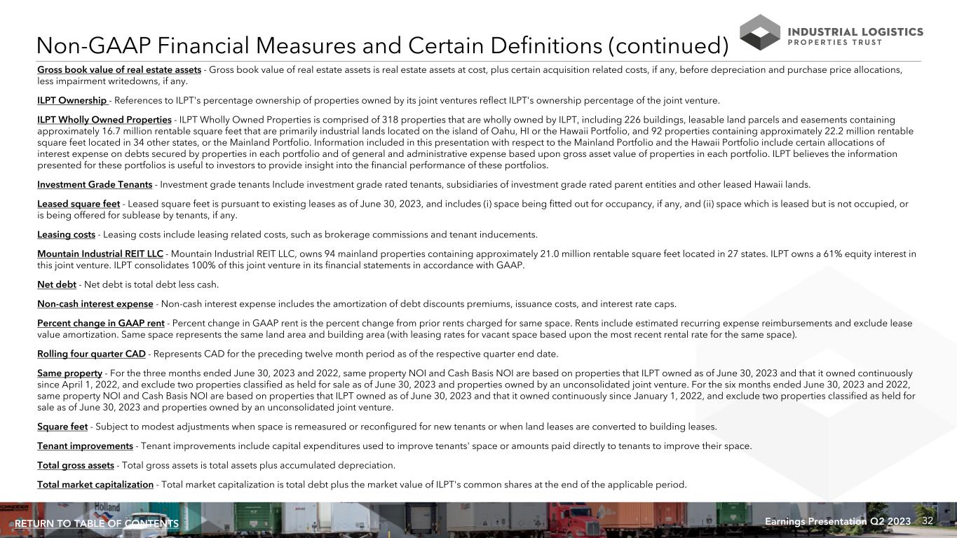 31Earnings Presentation Q2 2023RETURN TO TABLE OF CONTENTS Non-GAAP Financial Measures and Certain Definitions (continued) Cash Available for Distribution: ILPT calculates cash available for distribution, or CAD, as shown on page 37. ILPT defines CAD as Normalized FFO minus ILPT's proportionate share of Normalized FFO of unconsolidated joint venture properties, plus operating cash flow distributions received from ILPT's unconsolidated joint venture, recurring real estate related capital expenditures, adjustments for other non-cash and nonrecurring items, certain amounts excluded from Normalized FFO but settled in cash, less CAD adjustments attributable to noncontrolling interest, as well as certain other adjustments currently not applicable to ILPT. CAD is among the factors considered by ILPT's Board of Trustees when determining the amount of distributions to ILPT's shareholders. Other real estate companies and REITs may calculate CAD differently than ILPT does. EBITDA, EBITDAre and Adjusted EBITDAre: ILPT calculates earnings before interest, taxes, depreciation and amortization, or EBITDA, EBITDA for real estate, or EBITDAre, and Adjusted EBITDAre as shown on page 35. EBITDAre is calculated on the basis defined by Nareit, which is EBITDA, including ILPT's proportionate share of EBITDAre from unconsolidated joint venture properties, and excluding gains and losses on the sale of real estate, equity in earnings of unconsolidated joint venture, loss on impairment of real estate, any realized and unrealized gains or losses on equity securities, as well as certain other adjustments currently not applicable to ILPT. In calculating Adjusted EBITDAre, ILPT adjusts for the items shown on page 35. Other real estate companies and REITs may calculate EBITDA, EBITDAre and Adjusted EBITDAre differently than ILPT does. Pro-Rata Operating Information of Consolidated Joint Venture: ILPT believes this financial presentation of its joint venture information provides useful information to investors by providing additional insight into the financial performance of its consolidated joint venture, in which ILPT owns a 61% equity interest. This information may not accurately depict the impact of these investments in accordance with GAAP. Pro-rata information should not be considered in isolation or as a substitute for ILPT's condensed consolidated financial statements in accordance with GAAP. Certain Definitions: Annualized dividend yield - Annualized dividend yield is the annualized dividend paid during the applicable period divided by the closing price of ILPT's common shares at the end of the relevant period. Annualized rental revenues - Annualized rental revenues is the annualized contractual rents, as of June 30, 2023, including straight line rent adjustments and excluding lease value amortization, adjusted for tenant concessions including free rent and amounts reimbursed to tenants, plus estimated recurring expense reimbursements from tenants. Building improvements - Building improvements generally include (i) expenditures to replace obsolete building components and (ii) expenditures that extend the useful life of existing assets. Development, redevelopment and other activities - Development, redevelopment and other activities generally include capital expenditures projects that (i) reposition a property or (ii) result in new sources of revenue. Equity Research Coverage - ILPT is followed by the analysts listed on page 28. Please note that any opinions, estimates or forecasts regarding ILPT’s performance made by these analysts do not represent opinions, forecasts or predictions of ILPT or its management. ILPT does not by its reference above imply its endorsement of or concurrence with any information, conclusions or recommendations provided by any of these analysts.