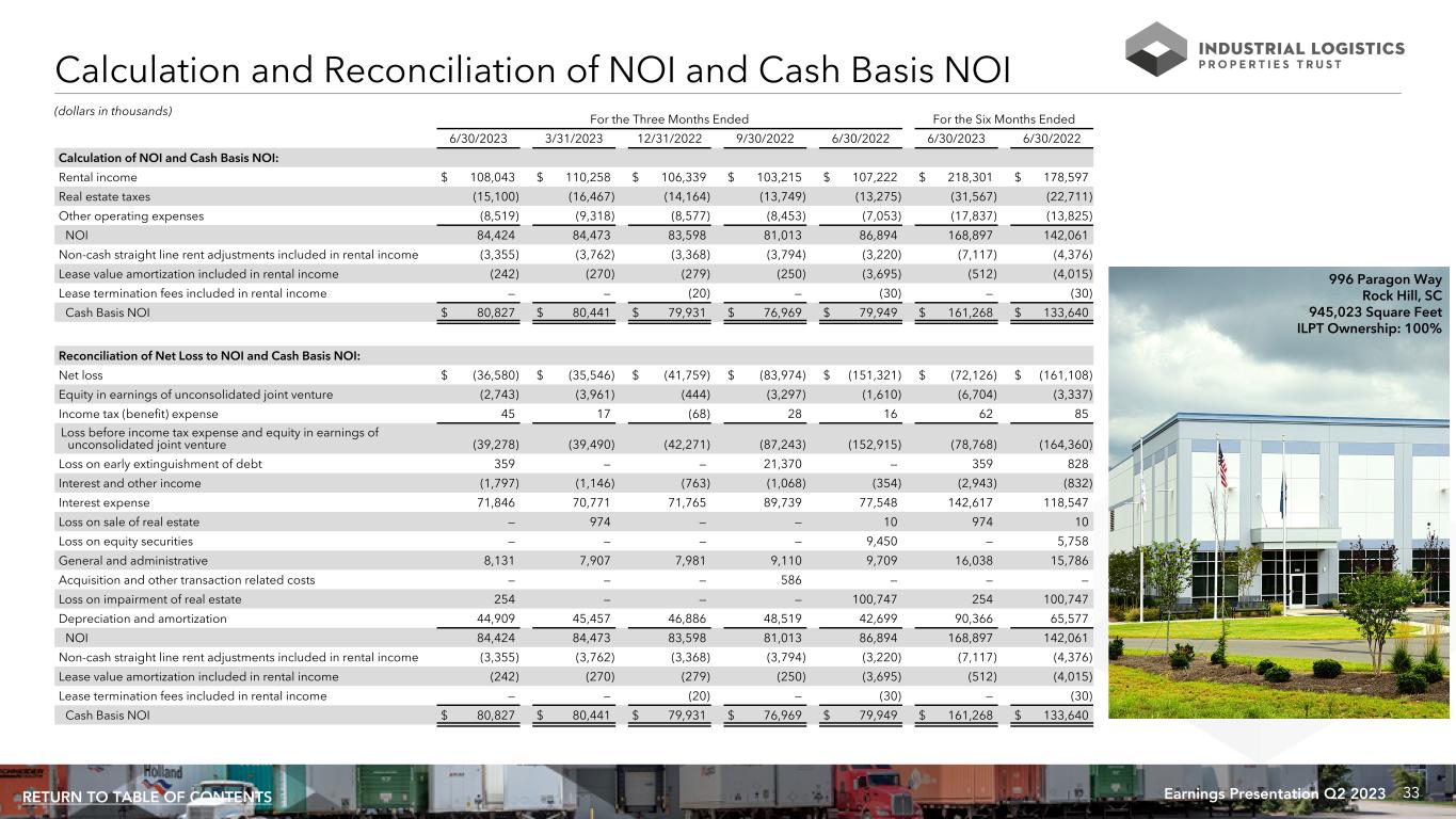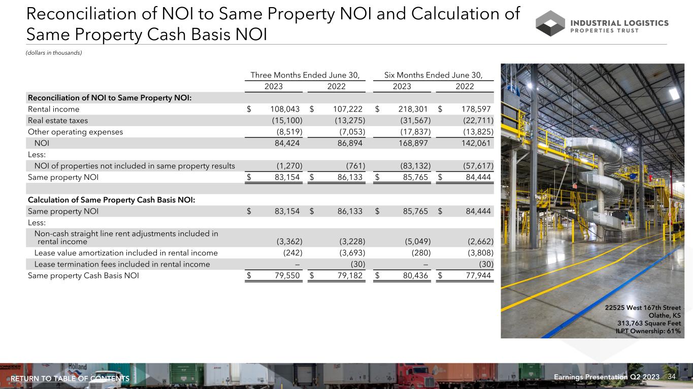 33Earnings Presentation Q2 2023RETURN TO TABLE OF CONTENTS Calculation and Reconciliation of NOI and Cash Basis NOI (dollars in thousands) For the Three Months Ended For the Six Months Ended 6/30/2023 3/31/2023 12/31/2022 9/30/2022 6/30/2022 6/30/2023 6/30/2022 Calculation of NOI and Cash Basis NOI: Rental income $ 108,043 $ 110,258 $ 106,339 $ 103,215 $ 107,222 $ 218,301 $ 178,597 Real estate taxes (15,100) (16,467) (14,164) (13,749) (13,275) (31,567) (22,711) Other operating expenses (8,519) (9,318) (8,577) (8,453) (7,053) (17,837) (13,825) NOI 84,424 84,473 83,598 81,013 86,894 168,897 142,061 Non-cash straight line rent adjustments included in rental income (3,355) (3,762) (3,368) (3,794) (3,220) (7,117) (4,376) Lease value amortization included in rental income (242) (270) (279) (250) (3,695) (512) (4,015) Lease termination fees included in rental income — — (20) — (30) — (30) Cash Basis NOI $ 80,827 $ 80,441 $ 79,931 $ 76,969 $ 79,949 $ 161,268 $ 133,640 Reconciliation of Net Loss to NOI and Cash Basis NOI: Net loss $ (36,580) $ (35,546) $ (41,759) $ (83,974) $ (151,321) $ (72,126) $ (161,108) Equity in earnings of unconsolidated joint venture (2,743) (3,961) (444) (3,297) (1,610) (6,704) (3,337) Income tax (benefit) expense 45 17 (68) 28 16 62 85 Loss before income tax expense and equity in earnings of unconsolidated joint venture (39,278) (39,490) (42,271) (87,243) (152,915) (78,768) (164,360) Loss on early extinguishment of debt 359 — — 21,370 — 359 828 Interest and other income (1,797) (1,146) (763) (1,068) (354) (2,943) (832) Interest expense 71,846 70,771 71,765 89,739 77,548 142,617 118,547 Loss on sale of real estate — 974 — — 10 974 10 Loss on equity securities — — — — 9,450 — 5,758 General and administrative 8,131 7,907 7,981 9,110 9,709 16,038 15,786 Acquisition and other transaction related costs — — — 586 — — — Loss on impairment of real estate 254 — — — 100,747 254 100,747 Depreciation and amortization 44,909 45,457 46,886 48,519 42,699 90,366 65,577 NOI 84,424 84,473 83,598 81,013 86,894 168,897 142,061 Non-cash straight line rent adjustments included in rental income (3,355) (3,762) (3,368) (3,794) (3,220) (7,117) (4,376) Lease value amortization included in rental income (242) (270) (279) (250) (3,695) (512) (4,015) Lease termination fees included in rental income — — (20) — (30) — (30) Cash Basis NOI $ 80,827 $ 80,441 $ 79,931 $ 76,969 $ 79,949 $ 161,268 $ 133,640 996 Paragon Way Rock Hill, SC 945,023 Square Feet ILPT Ownership: 100%