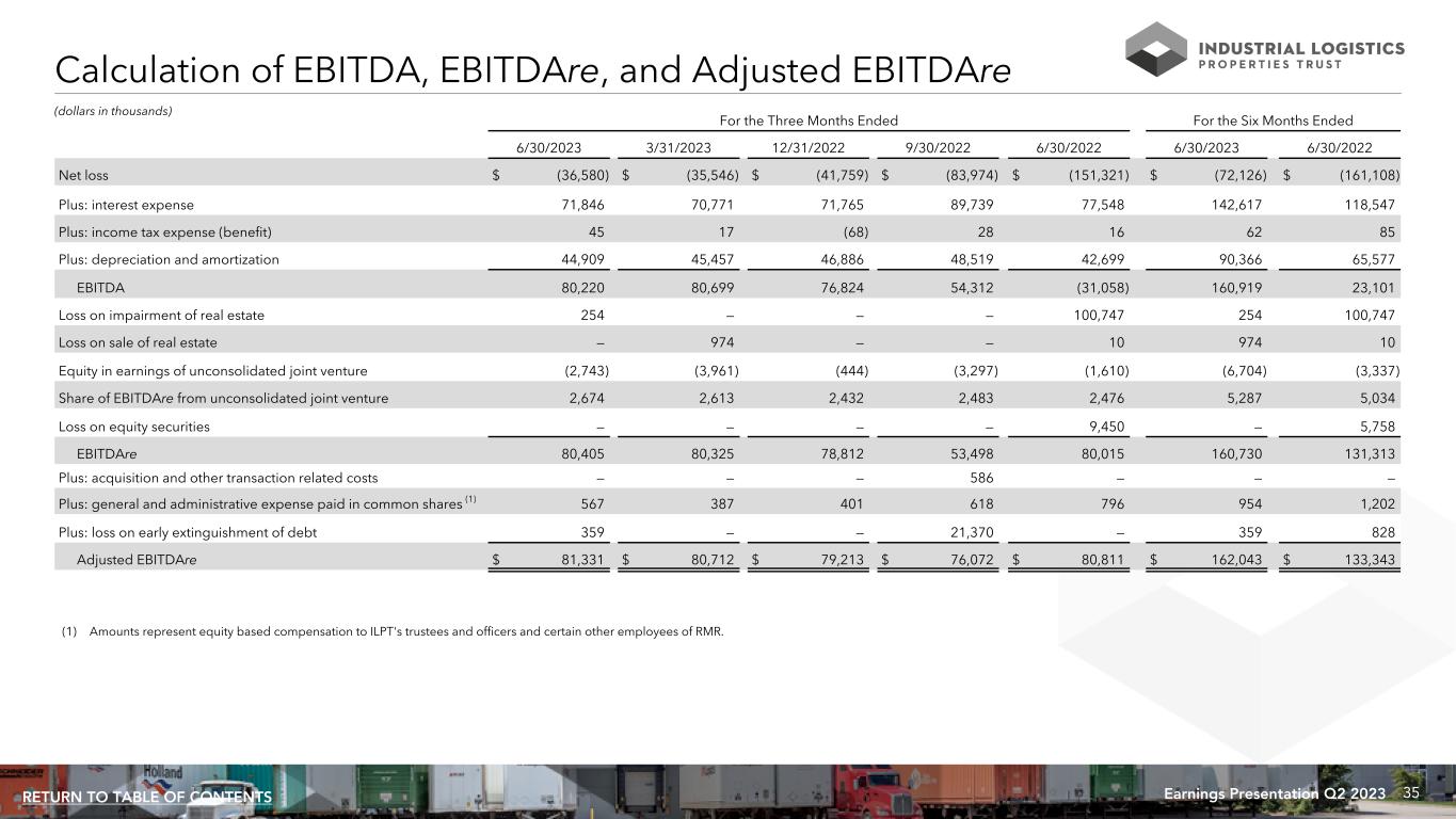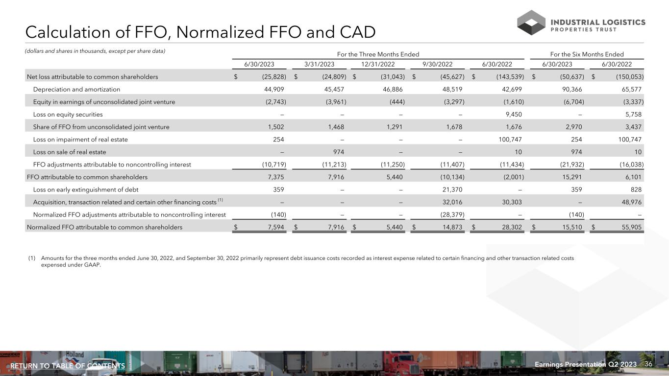35Earnings Presentation Q2 2023RETURN TO TABLE OF CONTENTS Calculation of EBITDA, EBITDAre, and Adjusted EBITDAre (dollars in thousands) For the Three Months Ended For the Six Months Ended 6/30/2023 3/31/2023 12/31/2022 9/30/2022 6/30/2022 6/30/2023 6/30/2022 Net loss $ (36,580) $ (35,546) $ (41,759) $ (83,974) $ (151,321) $ (72,126) $ (161,108) Plus: interest expense 71,846 70,771 71,765 89,739 77,548 142,617 118,547 Plus: income tax expense (benefit) 45 17 (68) 28 16 62 85 Plus: depreciation and amortization 44,909 45,457 46,886 48,519 42,699 90,366 65,577 EBITDA 80,220 80,699 76,824 54,312 (31,058) 160,919 23,101 Loss on impairment of real estate 254 — — — 100,747 254 100,747 Loss on sale of real estate — 974 — — 10 974 10 Equity in earnings of unconsolidated joint venture (2,743) (3,961) (444) (3,297) (1,610) (6,704) (3,337) Share of EBITDAre from unconsolidated joint venture 2,674 2,613 2,432 2,483 2,476 5,287 5,034 Loss on equity securities — — — — 9,450 — 5,758 EBITDAre 80,405 80,325 78,812 53,498 80,015 160,730 131,313 Plus: acquisition and other transaction related costs — — — 586 — — — Plus: general and administrative expense paid in common shares (1) 567 387 401 618 796 954 1,202 Plus: loss on early extinguishment of debt 359 — — 21,370 — 359 828 Adjusted EBITDAre $ 81,331 $ 80,712 $ 79,213 $ 76,072 $ 80,811 $ 162,043 $ 133,343 (1) Amounts represent equity based compensation to ILPT's trustees and officers and certain other employees of RMR.