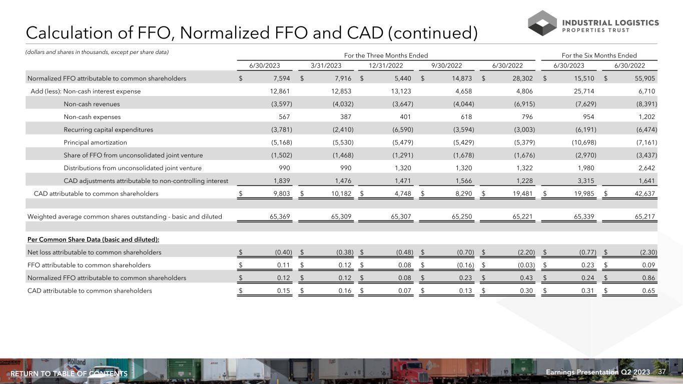 36Earnings Presentation Q2 2023RETURN TO TABLE OF CONTENTS Calculation of FFO, Normalized FFO and CAD (dollars and shares in thousands, except per share data) For the Three Months Ended For the Six Months Ended 6/30/2023 3/31/2023 12/31/2022 9/30/2022 6/30/2022 6/30/2023 6/30/2022 Net loss attributable to common shareholders $ (25,828) $ (24,809) $ (31,043) $ (45,627) $ (143,539) $ (50,637) $ (150,053) Depreciation and amortization 44,909 45,457 46,886 48,519 42,699 90,366 65,577 Equity in earnings of unconsolidated joint venture (2,743) (3,961) (444) (3,297) (1,610) (6,704) (3,337) Loss on equity securities — — — — 9,450 — 5,758 Share of FFO from unconsolidated joint venture 1,502 1,468 1,291 1,678 1,676 2,970 3,437 Loss on impairment of real estate 254 — — — 100,747 254 100,747 Loss on sale of real estate — 974 — — 10 974 10 FFO adjustments attributable to noncontrolling interest (10,719) (11,213) (11,250) (11,407) (11,434) (21,932) (16,038) FFO attributable to common shareholders 7,375 7,916 5,440 (10,134) (2,001) 15,291 6,101 Loss on early extinguishment of debt 359 — — 21,370 — 359 828 Acquisition, transaction related and certain other financing costs (1) — — — 32,016 30,303 — 48,976 Normalized FFO adjustments attributable to noncontrolling interest (140) — — (28,379) — (140) — Normalized FFO attributable to common shareholders $ 7,594 $ 7,916 $ 5,440 $ 14,873 $ 28,302 $ 15,510 $ 55,905 (1) Amounts for the three months ended June 30, 2022, and September 30, 2022 primarily represent debt issuance costs recorded as interest expense related to certain financing and other transaction related costs expensed under GAAP.