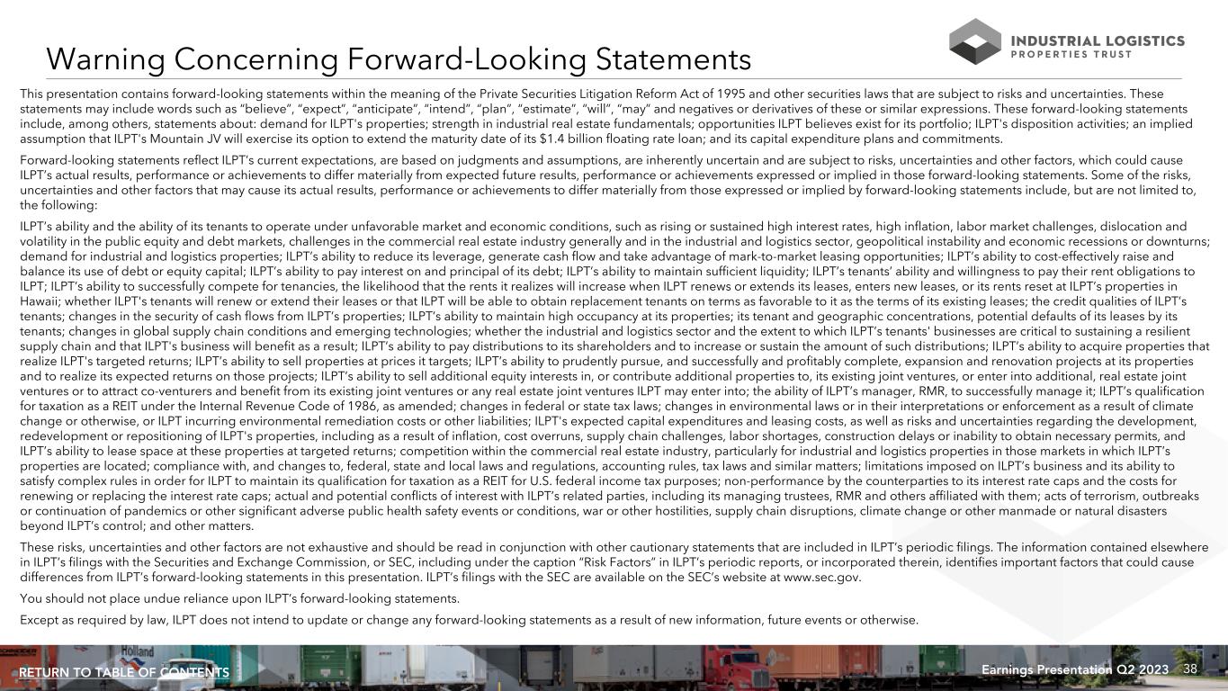 38Earnings Presentation Q2 2023RETURN TO TABLE OF CONTENTS Warning Concerning Forward-Looking Statements This presentation contains forward-looking statements within the meaning of the Private Securities Litigation Reform Act of 1995 and other securities laws that are subject to risks and uncertainties. These statements may include words such as “believe”, “expect”, “anticipate”, “intend”, “plan”, “estimate”, “will”, “may” and negatives or derivatives of these or similar expressions. These forward-looking statements include, among others, statements about: demand for ILPT's properties; strength in industrial real estate fundamentals; opportunities ILPT believes exist for its portfolio; ILPT's disposition activities; an implied assumption that ILPT's Mountain JV will exercise its option to extend the maturity date of its $1.4 billion floating rate loan; and its capital expenditure plans and commitments. Forward-looking statements reflect ILPT’s current expectations, are based on judgments and assumptions, are inherently uncertain and are subject to risks, uncertainties and other factors, which could cause ILPT’s actual results, performance or achievements to differ materially from expected future results, performance or achievements expressed or implied in those forward-looking statements. Some of the risks, uncertainties and other factors that may cause its actual results, performance or achievements to differ materially from those expressed or implied by forward-looking statements include, but are not limited to, the following: ILPT’s ability and the ability of its tenants to operate under unfavorable market and economic conditions, such as rising or sustained high interest rates, high inflation, labor market challenges, dislocation and volatility in the public equity and debt markets, challenges in the commercial real estate industry generally and in the industrial and logistics sector, geopolitical instability and economic recessions or downturns; demand for industrial and logistics properties; ILPT’s ability to reduce its leverage, generate cash flow and take advantage of mark-to-market leasing opportunities; ILPT’s ability to cost-effectively raise and balance its use of debt or equity capital; ILPT’s ability to pay interest on and principal of its debt; ILPT’s ability to maintain sufficient liquidity; ILPT’s tenants’ ability and willingness to pay their rent obligations to ILPT; ILPT’s ability to successfully compete for tenancies, the likelihood that the rents it realizes will increase when ILPT renews or extends its leases, enters new leases, or its rents reset at ILPT’s properties in Hawaii; whether ILPT's tenants will renew or extend their leases or that ILPT will be able to obtain replacement tenants on terms as favorable to it as the terms of its existing leases; the credit qualities of ILPT’s tenants; changes in the security of cash flows from ILPT’s properties; ILPT’s ability to maintain high occupancy at its properties; its tenant and geographic concentrations, potential defaults of its leases by its tenants; changes in global supply chain conditions and emerging technologies; whether the industrial and logistics sector and the extent to which ILPT’s tenants' businesses are critical to sustaining a resilient supply chain and that ILPT's business will benefit as a result; ILPT’s ability to pay distributions to its shareholders and to increase or sustain the amount of such distributions; ILPT’s ability to acquire properties that realize ILPT's targeted returns; ILPT’s ability to sell properties at prices it targets; ILPT’s ability to prudently pursue, and successfully and profitably complete, expansion and renovation projects at its properties and to realize its expected returns on those projects; ILPT’s ability to sell additional equity interests in, or contribute additional properties to, its existing joint ventures, or enter into additional, real estate joint ventures or to attract co-venturers and benefit from its existing joint ventures or any real estate joint ventures ILPT may enter into; the ability of ILPT’s manager, RMR, to successfully manage it; ILPT’s qualification for taxation as a REIT under the Internal Revenue Code of 1986, as amended; changes in federal or state tax laws; changes in environmental laws or in their interpretations or enforcement as a result of climate change or otherwise, or ILPT incurring environmental remediation costs or other liabilities; ILPT's expected capital expenditures and leasing costs, as well as risks and uncertainties regarding the development, redevelopment or repositioning of ILPT's properties, including as a result of inflation, cost overruns, supply chain challenges, labor shortages, construction delays or inability to obtain necessary permits, and ILPT’s ability to lease space at these properties at targeted returns; competition within the commercial real estate industry, particularly for industrial and logistics properties in those markets in which ILPT’s properties are located; compliance with, and changes to, federal, state and local laws and regulations, accounting rules, tax laws and similar matters; limitations imposed on ILPT’s business and its ability to satisfy complex rules in order for ILPT to maintain its qualification for taxation as a REIT for U.S. federal income tax purposes; non-performance by the counterparties to its interest rate caps and the costs for renewing or replacing the interest rate caps; actual and potential conflicts of interest with ILPT’s related parties, including its managing trustees, RMR and others affiliated with them; acts of terrorism, outbreaks or continuation of pandemics or other significant adverse public health safety events or conditions, war or other hostilities, supply chain disruptions, climate change or other manmade or natural disasters beyond ILPT’s control; and other matters. These risks,