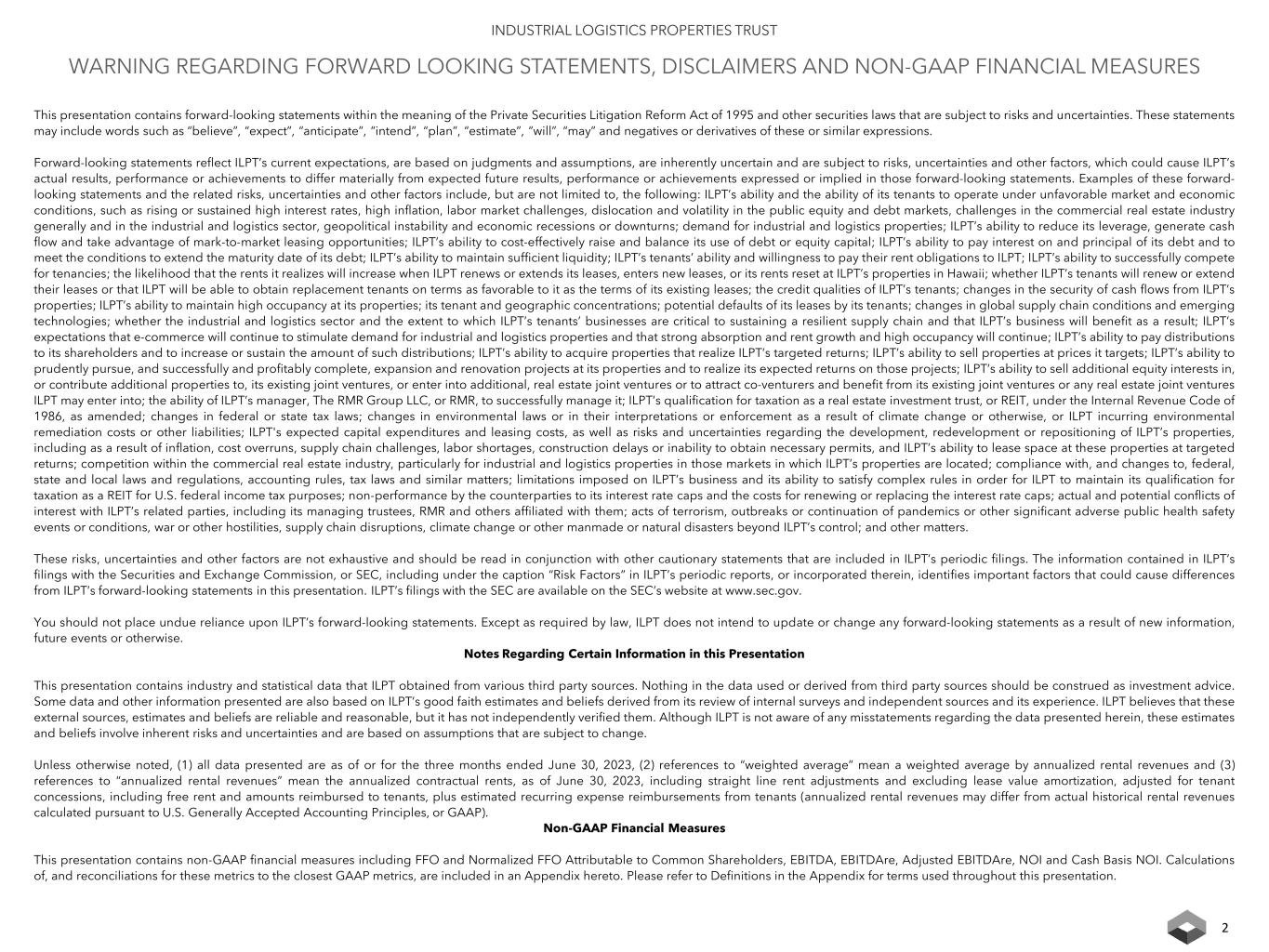2 INDUSTRIAL LOGISTICS PROPERTIES TRUST This presentation contains forward-looking statements within the meaning of the Private Securities Litigation Reform Act of 1995 and other securities laws that are subject to risks and uncertainties. These statements may include words such as “believe”, “expect”, “anticipate”, “intend”, “plan”, “estimate”, “will”, “may” and negatives or derivatives of these or similar expressions. Forward-looking statements reflect ILPT’s current expectations, are based on judgments and assumptions, are inherently uncertain and are subject to risks, uncertainties and other factors, which could cause ILPT’s actual results, performance or achievements to differ materially from expected future results, performance or achievements expressed or implied in those forward-looking statements. Examples of these forward- looking statements and the related risks, uncertainties and other factors include, but are not limited to, the following: ILPT’s ability and the ability of its tenants to operate under unfavorable market and economic conditions, such as rising or sustained high interest rates, high inflation, labor market challenges, dislocation and volatility in the public equity and debt markets, challenges in the commercial real estate industry generally and in the industrial and logistics sector, geopolitical instability and economic recessions or downturns; demand for industrial and logistics properties; ILPT’s ability to reduce its leverage, generate cash flow and take advantage of mark-to-market leasing opportunities; ILPT’s ability to cost-effectively raise and balance its use of debt or equity capital; ILPT’s ability to pay interest on and principal of its debt and to meet the conditions to extend the maturity date of its debt; ILPT’s ability to maintain sufficient liquidity; ILPT’s tenants’ ability and willingness to pay their rent obligations to ILPT; ILPT’s ability to successfully compete for tenancies; the likelihood that the rents it realizes will increase when ILPT renews or extends its leases, enters new leases, or its rents reset at ILPT’s properties in Hawaii; whether ILPT’s tenants will renew or extend their leases or that ILPT will be able to obtain replacement tenants on terms as favorable to it as the terms of its existing leases; the credit qualities of ILPT’s tenants; changes in the security of cash flows from ILPT’s properties; ILPT’s ability to maintain high occupancy at its properties; its tenant and geographic concentrations; potential defaults of its leases by its tenants; changes in global supply chain conditions and emerging technologies; whether the industrial and logistics sector and the extent to which ILPT’s tenants’ businesses are critical to sustaining a resilient supply chain and that ILPT’s business will benefit as a result; ILPT’s expectations that e-commerce will continue to stimulate demand for industrial and logistics properties and that strong absorption and rent growth and high occupancy will continue; ILPT’s ability to pay distributions to its shareholders and to increase or sustain the amount of such distributions; ILPT’s ability to acquire properties that realize ILPT’s targeted returns; ILPT’s ability to sell properties at prices it targets; ILPT’s ability to prudently pursue, and successfully and profitably complete, expansion and renovation projects at its properties and to realize its expected returns on those projects; ILPT’s ability to sell additional equity interests in, or contribute additional properties to, its existing joint ventures, or enter into additional, real estate joint ventures or to attract co-venturers and benefit from its existing joint ventures or any real estate joint ventures ILPT may enter into; the ability of ILPT’s manager, The RMR Group LLC, or RMR, to successfully manage it; ILPT’s qualification for taxation as a real estate investment trust, or REIT, under the Internal Revenue Code of 1986, as amended; changes in federal or state tax laws; changes in environmental laws or in their interpretations or enforcement as a result of climate change or otherwise, or ILPT incurring environmental remediation costs or other liabilities; ILPT's expected capital expenditures and leasing costs, as well as risks and uncertainties regarding the development, redevelopment or repositioning of ILPT’s properties, including as a result of inflation, cost overruns, supply chain challenges, labor shortages, construction delays or inability to obtain necessary permits, and ILPT’s ability to lease space at these properties at targeted returns; competition within the commercial real estate industry, particularly for industrial and logistics properties in those markets in which ILPT’s properties are located; compliance with, and changes to, federal, state and local laws and regulations, accounting rules, tax laws and similar matters; limitations imposed on ILPT’s business and its ability to satisfy complex rules in order for ILPT to maintain its qualification for taxation as a REIT for U.S. federal income tax purposes; non-performance by the counterparties to its interest rate caps and the costs for renewing or replacing the interest rate caps; actual and potential conflicts of interest with ILPT’s related parties, including its managing trustees, RMR and others affiliated with them; acts of terrorism, outbreaks or continuation of pandemics or other significant adverse public health safety events or conditions, war or other hostilities, supply chain disruptions, climate change or other manmade or natural disasters beyond ILPT’s control; and other matters. These risks, uncertainties and other factors are not exhaustive and should be read in conjunction with other cautionary statements that are included in ILPT’s periodic filings. The information contained in ILPT’s filings with the Securities and Exchange Commission, or SEC, 