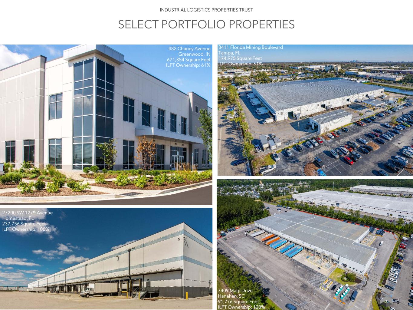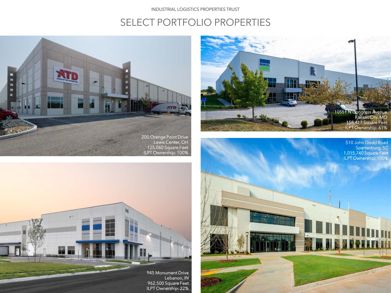 INDUSTRIAL LOGISTICS PROPERTIES TRUST SELECT PORTFOLIO PROPERTIES 10551 N Congress Avenue Kansas City, MO 158,417 Square Feet ILPT Ownership: 61% 200 Orange Point Drive Lewis Center, OH 125,060 Square Feet ILPT Ownership: 100% 945 Monument Drive Lebanon, IN 962,500 Square Feet ILPT Ownership: 22% 510 John Dodd Road Spartanburg, SC 1,015,740 Square Feet ILPT Ownership: 100%