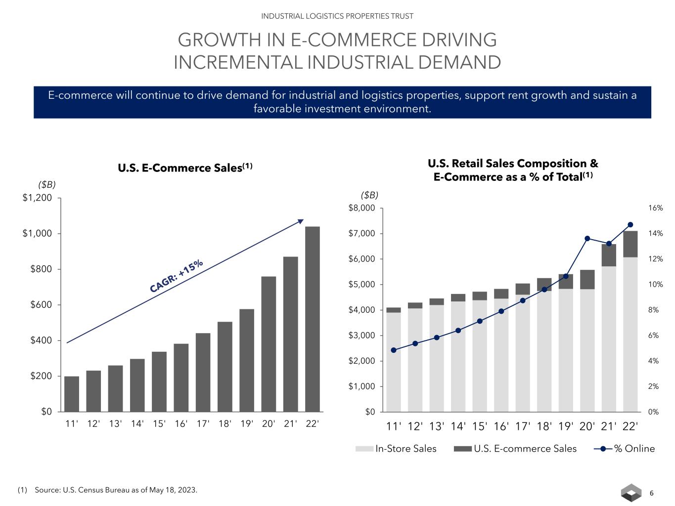6 INDUSTRIAL LOGISTICS PROPERTIES TRUST 0% 2% 4% 6% 8% 10% 12% 14% 16% $0 $1,000 $2,000 $3,000 $4,000 $5,000 $6,000 $7,000 $8,000 11' 12' 13' 14' 15' 16' 17' 18' 19' 20' 21' 22' In-Store Sales U.S. E-commerce Sales % Online $0 $200 $400 $600 $800 $1,000 $1,200 11' 12' 13' 14' 15' 16' 17' 18' 19' 20' 21' 22' GROWTH IN E-COMMERCE DRIVING INCREMENTAL INDUSTRIAL DEMAND E-commerce will continue to drive demand for industrial and logistics properties, support rent growth and sustain a favorable investment environment. (1) Source: U.S. Census Bureau as of May 18, 2023. ($B) ($B) U.S. E-Commerce Sales(1) U.S. Retail Sales Composition & E-Commerce as a % of Total(1)