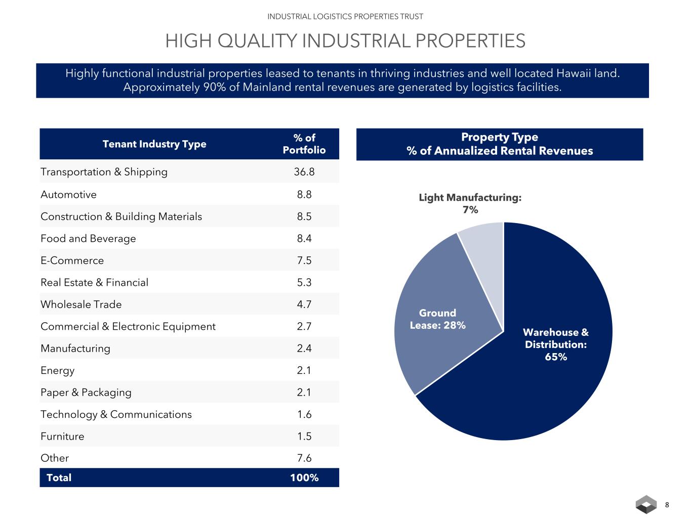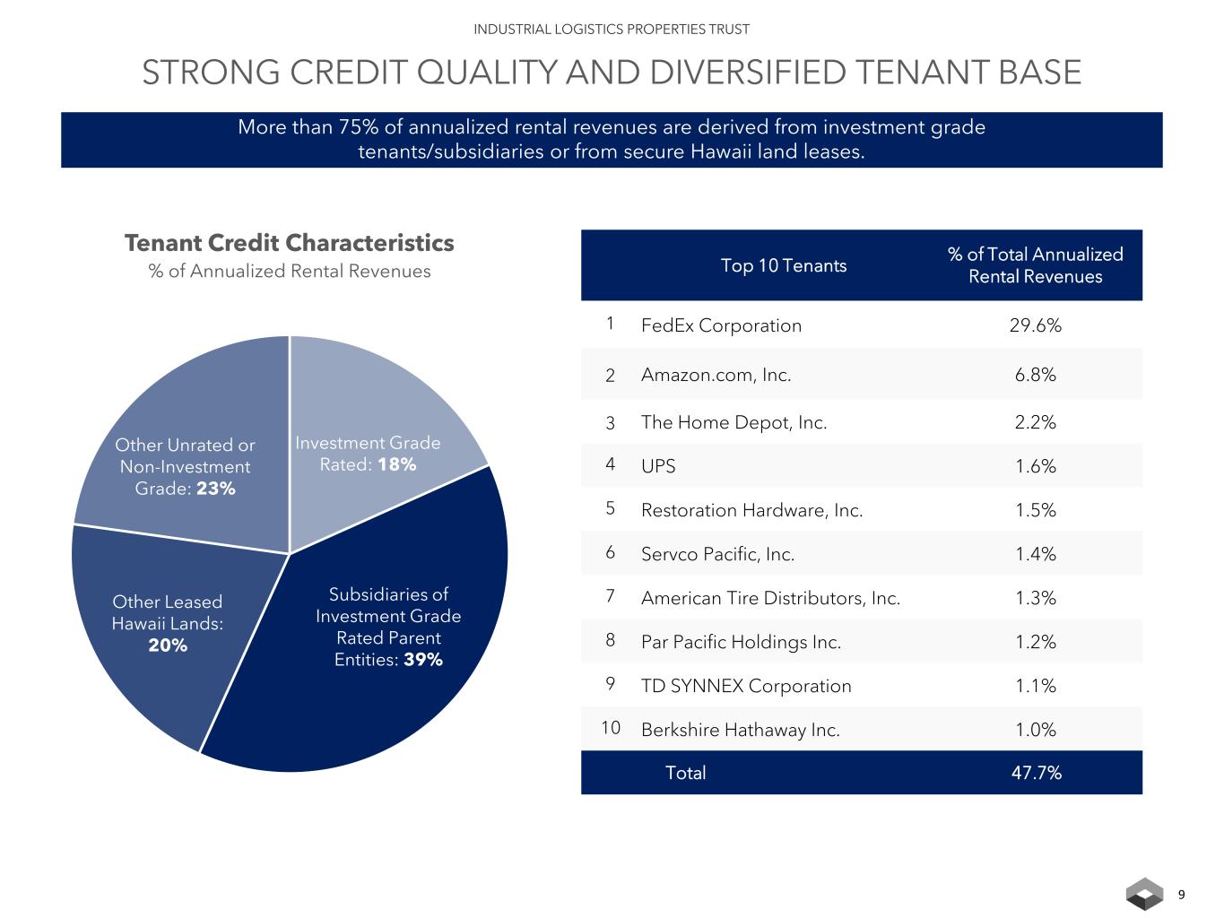 8 INDUSTRIAL LOGISTICS PROPERTIES TRUST Warehouse & Distribution: 65% Ground Lease: 28% Light Manufacturing: 7% HIGH QUALITY INDUSTRIAL PROPERTIES Property Type % of Annualized Rental Revenues Tenant Industry Type % of Portfolio Transportation & Shipping 36.8 Automotive 8.8 Construction & Building Materials 8.5 Food and Beverage 8.4 E-Commerce 7.5 Real Estate & Financial 5.3 Wholesale Trade 4.7 Commercial & Electronic Equipment 2.7 Manufacturing 2.4 Energy 2.1 Paper & Packaging 2.1 Technology & Communications 1.6 Furniture 1.5 Other 7.6 Total 100% Highly functional industrial properties leased to tenants in thriving industries and well located Hawaii land. Approximately 90% of Mainland rental revenues are generated by logistics facilities.