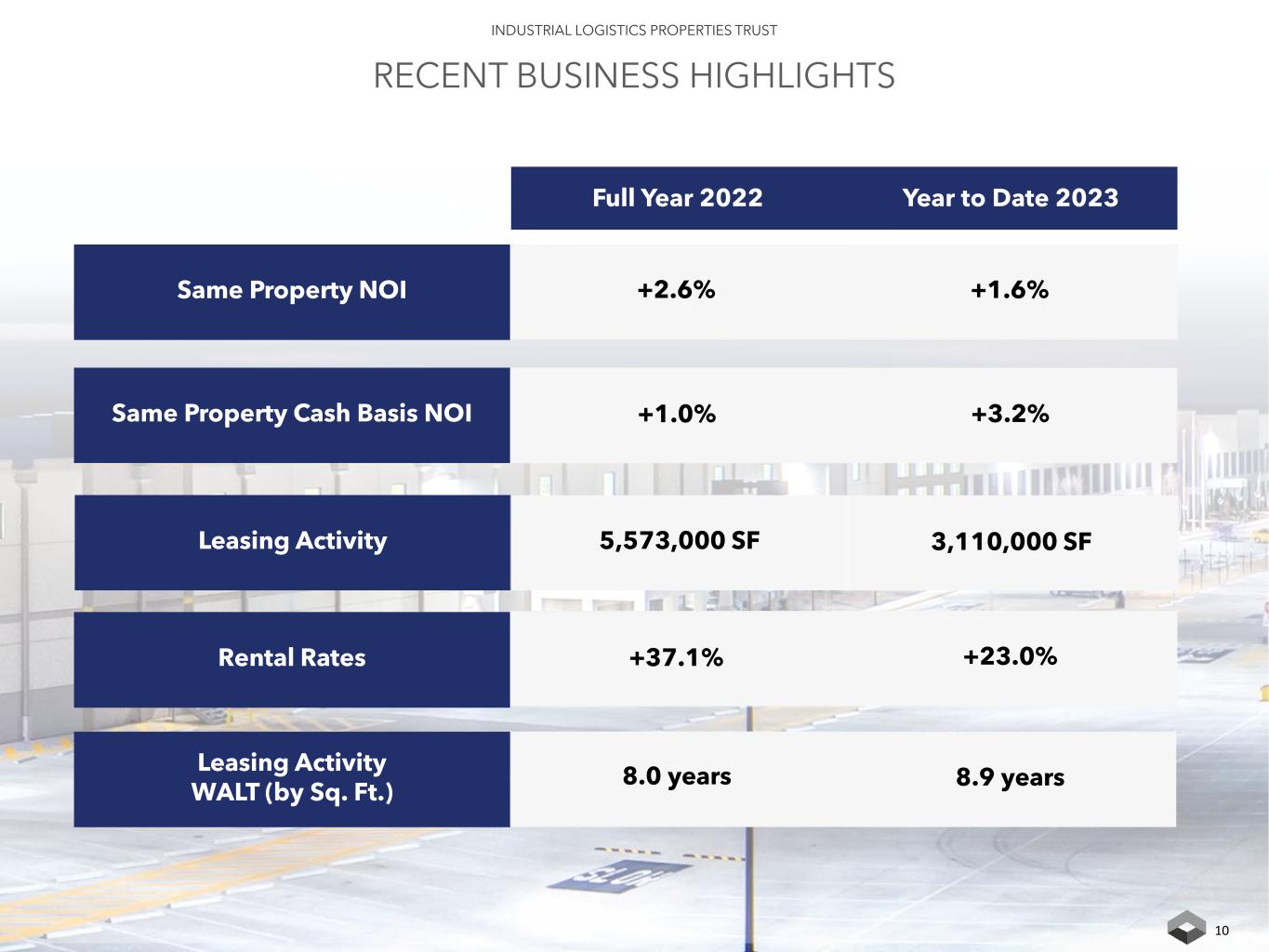 2 INDUSTRIAL LOGISTICS PROPERTIES TRUST This presentation contains forward-looking statements within the meaning of the Private Securities Litigation Reform Act of 1995 and other securities laws that are subject to risks and uncertainties. These statements may include words such as “believe”, “expect”, “anticipate”, “intend”, “plan”, “estimate”, “will”, “may” and negatives or derivatives of these or similar expressions. Forward-looking statements reflect ILPT’s current expectations, are based on judgments and assumptions, are inherently uncertain and are subject to risks, uncertainties and other factors, which could cause ILPT’s actual results, performance or achievements to differ materially from expected future results, performance or achievements expressed or implied in those forward-looking statements. Examples of these forward- looking statements and the related risks, uncertainties and other factors include, but are not limited to, the following: ILPT’s ability and the ability of its tenants to operate under unfavorable market and economic conditions, such as rising or sustained high interest rates, high inflation, labor market challenges, dislocation and volatility in the public equity and debt markets, challenges in the commercial real estate industry generally and in the industrial and logistics sector, geopolitical instability and economic recessions or downturns; demand for industrial and logistics properties; ILPT’s ability to reduce its leverage, generate cash flow and take advantage of mark-to-market leasing opportunities; ILPT’s ability to cost-effectively raise and balance its use of debt or equity capital; ILPT’s ability to pay interest on and principal of its debt and to meet the conditions to extend the maturity date of its debt; ILPT’s ability to maintain sufficient liquidity; ILPT’s tenants’ ability and willingness to pay their rent obligations to ILPT; ILPT’s ability to successfully compete for tenancies; the likelihood that the rents it realizes will increase when ILPT renews or extends its leases, enters new leases, or its rents reset at ILPT’s properties in Hawaii; whether ILPT’s tenants will renew or extend their leases or that ILPT will be able to obtain replacement tenants on terms as favorable to it as the terms of its existing leases; the credit qualities of ILPT’s tenants; changes in the security of cash flows from ILPT’s properties; ILPT’s ability to maintain high occupancy at its properties; its tenant and geographic concentrations; potential defaults of its leases by its tenants; changes in global supply chain conditions and emerging technologies; whether the industrial and logistics sector and the extent to which ILPT’s tenants’ businesses are critical to sustaining a resilient supply chain and that ILPT’s business will benefit as a result; ILPT’s expectations that e-commerce will continue to stimulate demand for industrial and logistics properties and that strong absorption and rent growth and high occupancy will continue; ILPT’s ability to pay distributions to its shareholders and to increase or sustain the amount of such distributions; ILPT’s ability to acquire properties that realize ILPT’s targeted returns; ILPT’s ability to sell properties at prices it targets; ILPT’s ability to prudently pursue, and successfully and profitably complete, expansion and renovation projects at its properties and to realize its expected returns on those projects; ILPT’s ability to sell additional equity interests in, or contribute additional properties to, its existing joint ventures, or enter into additional, real estate joint ventures or to attract co-venturers and benefit from its existing joint ventures or any real estate joint ventures ILPT may enter into; the ability of ILPT’s manager, The RMR Group LLC, or RMR, to successfully manage it; ILPT’s qualification for taxation as a real estate investment trust, or REIT, under the Internal Revenue Code of 1986, as amended; changes in federal or state tax laws; changes in environmental laws or in their interpretations or enforcement as a result of climate change or otherwise, or ILPT incurring environmental remediation costs or other liabilities; ILPT's expected capital expenditures and leasing costs, as well as risks and uncertainties regarding the development, redevelopment or repositioning of ILPT’s properties, including as a result of inflation, cost overruns, supply chain challenges, labor shortages, construction delays or inability to obtain necessary permits, and ILPT’s ability to lease space at these properties at targeted returns; competition within the commercial real estate industry, particularly for industrial and logistics properties in those markets in which ILPT’s properties are located; compliance with, and changes to, federal, state and local laws and regulations, accounting rules, tax laws and similar matters; limitations imposed on ILPT’s business and its ability to satisfy complex rules in order for ILPT to maintain its qualification for taxation as a REIT for U.S. federal income tax purposes; non-performance by the counterparties to its interest rate caps and the costs for renewing or replacing the interest rate caps; actual and potential conflicts of interest with ILPT’s related parties, including its managing trustees, RMR and others affiliated with them; acts of terrorism, outbreaks or continuation of pandemics or other significant adverse public health safety events or conditions, war or other hostilities, supply chain disruptions, climate change or other manmade or natural disasters beyond ILPT’s control; and other matters. These risks, uncertainties and other factors are not exhaustive and should be read in conjunction with other cautionary statements that are included in ILPT’s periodic filings. The information contained in ILPT’s filings with the Securities and Exchange Commission, or SEC, 