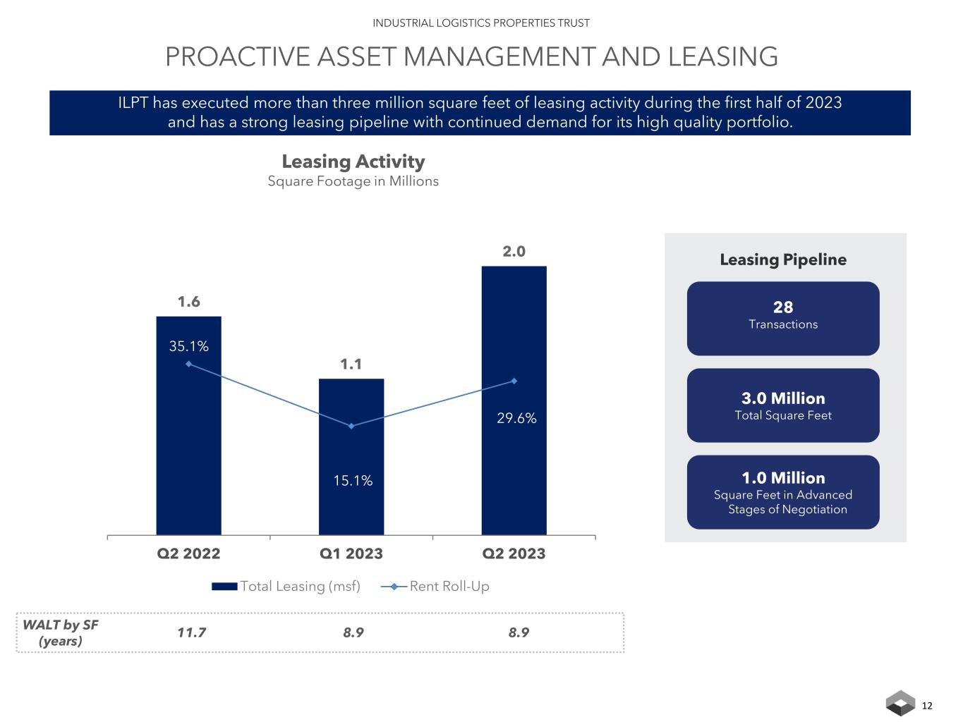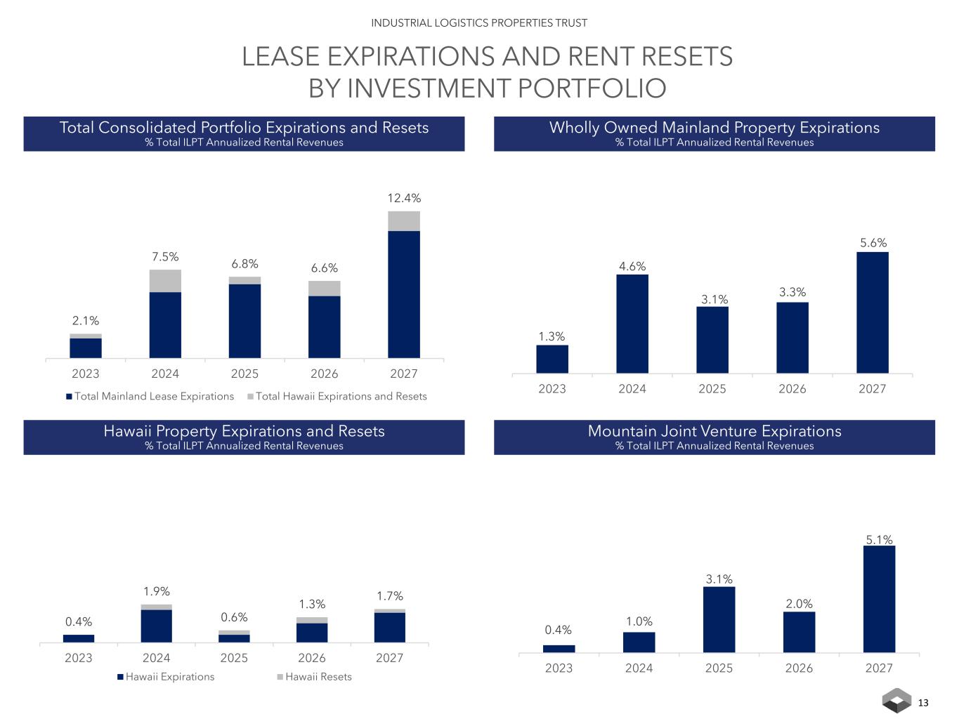 11 INDUSTRIAL LOGISTICS PROPERTIES TRUST Mountain Industrial JV(1) Consolidated ILPT 61% Ownership 94 Properties 99.2% Occupancy $32.5M NOI $31.4M Cash Basis NOI $29.6M Adjusted EBITDAre $3.2B Total Gross Assets (1) Amounts represent this joint venture at 100%, not ILPT’s proportionate share thereof. INVESTMENT PORTFOLIO Q2 2023 RESULTS $1.7B Total Debt (Principal) Mainland Properties 92 Properties 99.4% Occupancy $29.0M NOI $28.8M Cash Basis NOI $26.3M Adjusted EBITDAre $1.9B Total Gross Assets $1.7B Total Debt (Principal) Hawaii Properties 226 Properties 98.4% Occupancy $22.6M NOI $20.4M Cash Basis NOI $21.6M Adjusted EBITDAre $714.7M Total Gross Assets $862.9M Total Debt (Principal) 100% Ownership $9.6M Normalized FFO -$4.4M Normalized FFO $0.3M Normalized FFO 855,000 SF Leasing Activity +41.7% Rental Rates 428,000 SF Leasing Activity +38.3% Rental Rates 684,000 SF Leasing Activity +6.2% Rental Rates 11