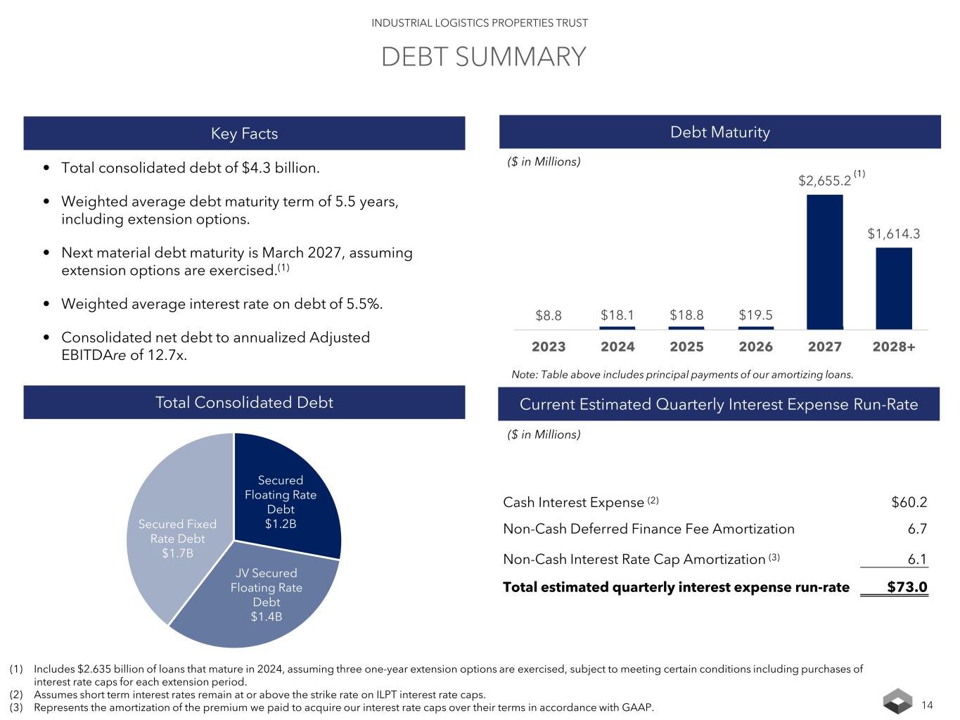 2 INDUSTRIAL LOGISTICS PROPERTIES TRUST This presentation contains forward-looking statements within the meaning of the Private Securities Litigation Reform Act of 1995 and other securities laws that are subject to risks and uncertainties. These statements may include words such as “believe”, “expect”, “anticipate”, “intend”, “plan”, “estimate”, “will”, “may” and negatives or derivatives of these or similar expressions. Forward-looking statements reflect ILPT’s current expectations, are based on judgments and assumptions, are inherently uncertain and are subject to risks, uncertainties and other factors, which could cause ILPT’s actual results, performance or achievements to differ materially from expected future results, performance or achievements expressed or implied in those forward-looking statements. Examples of these forward- looking statements and the related risks, uncertainties and other factors include, but are not limited to, the following: ILPT’s ability and the ability of its tenants to operate under unfavorable market and economic conditions, such as rising or sustained high interest rates, high inflation, labor market challenges, dislocation and volatility in the public equity and debt markets, challenges in the commercial real estate industry generally and in the industrial and logistics sector, geopolitical instability and economic recessions or downturns; demand for industrial and logistics properties; ILPT’s ability to reduce its leverage, generate cash flow and take advantage of mark-to-market leasing opportunities; ILPT’s ability to cost-effectively raise and balance its use of debt or equity capital; ILPT’s ability to pay interest on and principal of its debt and to meet the conditions to extend the maturity date of its debt; ILPT’s ability to maintain sufficient liquidity; ILPT’s tenants’ ability and willingness to pay their rent obligations to ILPT; ILPT’s ability to successfully compete for tenancies; the likelihood that the rents it realizes will increase when ILPT renews or extends its leases, enters new leases, or its rents reset at ILPT’s properties in Hawaii; whether ILPT’s tenants will renew or extend their leases or that ILPT will be able to obtain replacement tenants on terms as favorable to it as the terms of its existing leases; the credit qualities of ILPT’s tenants; changes in the security of cash flows from ILPT’s properties; ILPT’s ability to maintain high occupancy at its properties; its tenant and geographic concentrations; potential defaults of its leases by its tenants; changes in global supply chain conditions and emerging technologies; whether the industrial and logistics sector and the extent to which ILPT’s tenants’ businesses are critical to sustaining a resilient supply chain and that ILPT’s business will benefit as a result; ILPT’s expectations that e-commerce will continue to stimulate demand for industrial and logistics properties and that strong absorption and rent growth and high occupancy will continue; ILPT’s ability to pay distributions to its shareholders and to increase or sustain the amount of such distributions; ILPT’s ability to acquire properties that realize ILPT’s targeted returns; ILPT’s ability to sell properties at prices it targets; ILPT’s ability to prudently pursue, and successfully and profitably complete, expansion and renovation projects at its properties and to realize its expected returns on those projects; ILPT’s ability to sell additional equity interests in, or contribute additional properties to, its existing joint ventures, or enter into additional, real estate joint ventures or to attract co-venturers and benefit from its existing joint ventures or any real estate joint ventures ILPT may enter into; the ability of ILPT’s manager, The RMR Group LLC, or RMR, to successfully manage it; ILPT’s qualification for taxation as a real estate investment trust, or REIT, under the Internal Revenue Code of 1986, as amended; changes in federal or state tax laws; changes in environmental laws or in their interpretations or enforcement as a result of climate change or otherwise, or ILPT incurring environmental remediation costs or other liabilities; ILPT's expected capital expenditures and leasing costs, as well as risks and uncertainties regarding the development, redevelopment or repositioning of ILPT’s properties, including as a result of inflation, cost overruns, supply chain challenges, labor shortages, construction delays or inability to obtain necessary permits, and ILPT’s ability to lease space at these properties at targeted returns; competition within the commercial real estate industry, particularly for industrial and logistics properties in those markets in which ILPT’s properties are located; compliance with, and changes to, federal, state and local laws and regulations, accounting rules, tax laws and similar matters; limitations imposed on ILPT’s business and its ability to satisfy complex rules in order for ILPT to maintain its qualification for taxation as a REIT for U.S. federal income tax purposes; non-performance by the counterparties to its interest rate caps and the costs for renewing or replacing the interest rate caps; actual and potential conflicts of interest with ILPT’s related parties, including its managing trustees, RMR and others affiliated with them; acts of terrorism, outbreaks or continuation of pandemics or other significant adverse public health safety events or conditions, war or other hostilities, supply chain disruptions, climate change or other manmade or natural disasters beyond ILPT’s control; and other matters. These risks, uncertainties and other factors are not exhaustive and should be read in conjunction with other cautionary statements that are included in ILPT’s periodic filings. The information contained in ILPT’s filings with the Securities and Exchange Commission, or SEC, 