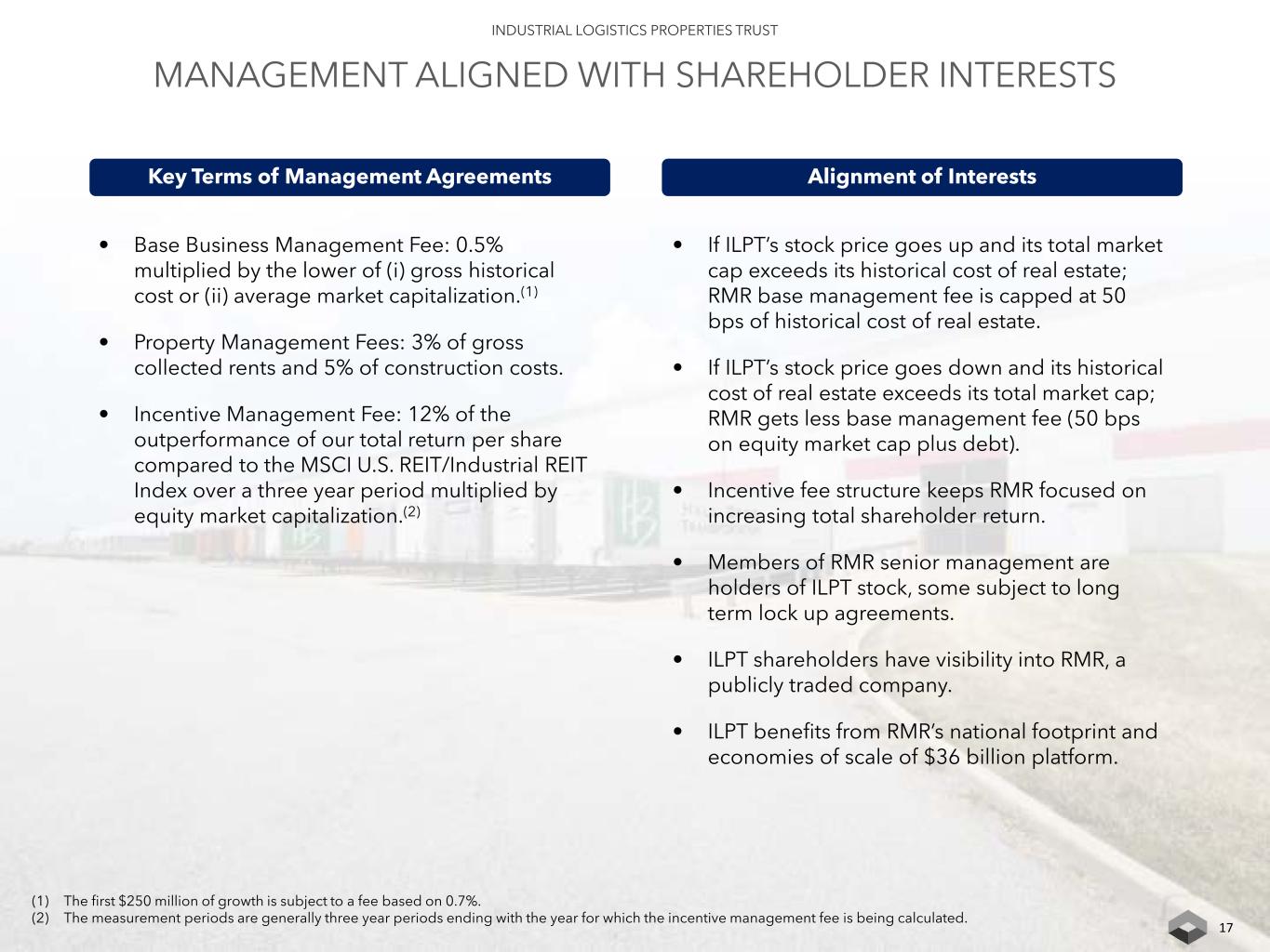 16 INDUSTRIAL LOGISTICS PROPERTIES TRUST RMR’s Operations Include: National Multi-Sector Investment Platform OFFICE INDUSTRIAL GOVERNMENT MEDICAL OFFICE LIFE SCIENCE SENIOR LIVING HOTELS SERVICE RETAIL RMR Managed Companies Over 20,000 Employees Over 2,000 Properties More than $5 billion in Annual Revenues Approximately $36 Billion in AUM Over 600 CRE Professionals More than 30 Offices Throughout the U.S. Financial Services: Real Estate Services: Business Services: Accounting Acquisitions/ Dispositions Administration Capital Markets Asset Management Human Resources Compliance/ Audit Construction/ Development Information Technology (IT) Finance/ Planning Engineering Investor Relations Treasury Leasing Marketing Tax Property Management Legal/ Risk Management MANAGED BY THE RMR GROUP LLC, AN ALTERNATIVE ASSET MANAGER The RMR Group LLC