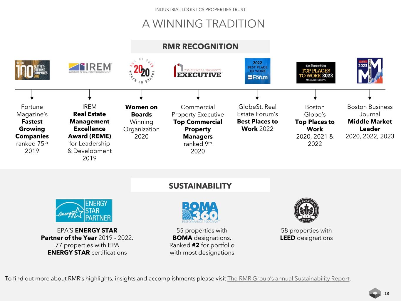18 INDUSTRIAL LOGISTICS PROPERTIES TRUST A WINNING TRADITION RMR RECOGNITION EPA’S ENERGY STAR Partner of the Year 2019 - 2022. 77 properties with EPA ENERGY STAR certifications 55 properties with BOMA designations. Ranked #2 for portfolio with most designations 58 properties with LEED designations SUSTAINABILITY Boston Globe’s Top Places to Work 2020, 2021 & 2022 Commercial Property Executive Top Commercial Property Managers ranked 9th 2020 Women on Boards Winning Organization 2020 Fortune Magazine’s Fastest Growing Companies ranked 75th 2019 GlobeSt. Real Estate Forum’s Best Places to Work 2022 Boston Business Journal Middle Market Leader 2020, 2022, 2023 IREM Real Estate Management Excellence Award (REME) for Leadership & Development 2019 To find out more about RMR’s highlights, insights and accomplishments please visit The RMR Group’s annual Sustainability Report. 2022 2023