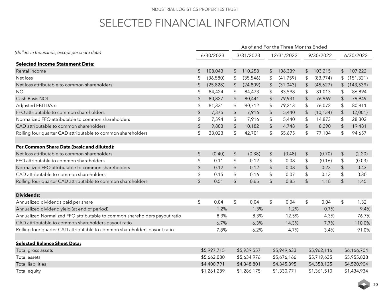 20 INDUSTRIAL LOGISTICS PROPERTIES TRUST SELECTED FINANCIAL INFORMATION As of and For the Three Months Ended 6/30/2023 3/31/2023 12/31/2022 9/30/2022 6/30/2022 Selected Income Statement Data: Rental income $ 108,043 $ 110,258 $ 106,339 $ 103,215 $ 107,222 Net loss $ (36,580) $ (35,546) $ (41,759) $ (83,974) $ (151,321) Net loss attributable to common shareholders $ (25,828) $ (24,809) $ (31,043) $ (45,627) $ (143,539) NOI $ 84,424 $ 84,473 $ 83,598 $ 81,013 $ 86,894 Cash Basis NOI $ 80,827 $ 80,441 $ 79,931 $ 76,969 $ 79,949 Adjusted EBITDAre $ 81,331 $ 80,712 $ 79,213 $ 76,072 $ 80,811 FFO attributable to common shareholders $ 7,375 $ 7,916 $ 5,440 $ (10,134) $ (2,001) Normalized FFO attributable to common shareholders $ 7,594 $ 7,916 $ 5,440 $ 14,873 $ 28,302 CAD attributable to common shareholders $ 9,803 $ 10,182 $ 4,748 $ 8,290 $ 19,481 Rolling four quarter CAD attributable to common shareholders $ 33,023 $ 42,701 $ 55,675 $ 77,104 $ 94,657 Per Common Share Data (basic and diluted): Net loss attributable to common shareholders $ (0.40) $ (0.38) $ (0.48) $ (0.70) $ (2.20) FFO attributable to common shareholders $ 0.11 $ 0.12 $ 0.08 $ (0.16) $ (0.03) Normalized FFO attributable to common shareholders $ 0.12 $ 0.12 $ 0.08 $ 0.23 $ 0.43 CAD attributable to common shareholders $ 0.15 $ 0.16 $ 0.07 $ 0.13 $ 0.30 Rolling four quarter CAD attributable to common shareholders $ 0.51 $ 0.65 $ 0.85 $ 1.18 $ 1.45 Dividends: Annualized dividends paid per share $ 0.04 $ 0.04 $ 0.04 $ 0.04 $ 1.32 Annualized dividend yield (at end of period) 1.2% 1.3% 1.2% 0.7% 9.4% Annualized Normalized FFO attributable to common shareholders payout ratio 8.3% 8.3% 12.5% 4.3% 76.7% CAD attributable to common shareholders payout ratio 6.7% 6.3% 14.3% 7.7% 110.0% Rolling four quarter CAD attributable to common shareholders payout ratio 7.8% 6.2% 4.7% 3.4% 91.0% Selected Balance Sheet Data: Total gross assets $5,997,715 $5,939,557 $5,949,633 $5,962,116 $6,166,704 Total assets $5,662,080 $5,634,976 $5,676,166 $5,719,635 $5,955,838 Total liabilities $4,400,791 $4,348,801 $4,345,395 $4,358,125 $4,520,904 Total equity $1,261,289 $1,286,175 $1,330,771 $1,361,510 $1,434,934 (dollars in thousands, except per share data)