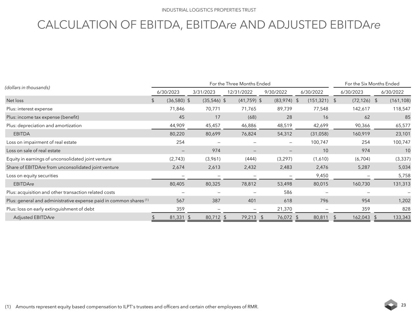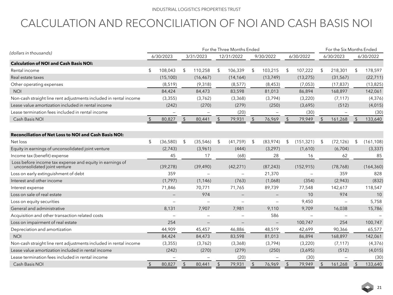 21 INDUSTRIAL LOGISTICS PROPERTIES TRUST CALCULATION AND RECONCILIATION OF NOI AND CASH BASIS NOI For the Three Months Ended For the Six Months Ended 6/30/2023 3/31/2023 12/31/2022 9/30/2022 6/30/2022 6/30/2023 6/30/2022 Calculation of NOI and Cash Basis NOI: Rental income $ 108,043 $ 110,258 $ 106,339 $ 103,215 $ 107,222 $ 218,301 $ 178,597 Real estate taxes (15,100) (16,467) (14,164) (13,749) (13,275) (31,567) (22,711) Other operating expenses (8,519) (9,318) (8,577) (8,453) (7,053) (17,837) (13,825) NOI 84,424 84,473 83,598 81,013 86,894 168,897 142,061 Non-cash straight line rent adjustments included in rental income (3,355) (3,762) (3,368) (3,794) (3,220) (7,117) (4,376) Lease value amortization included in rental income (242) (270) (279) (250) (3,695) (512) (4,015) Lease termination fees included in rental income — — (20) — (30) — (30) Cash Basis NOI $ 80,827 $ 80,441 $ 79,931 $ 76,969 $ 79,949 $ 161,268 $ 133,640 Reconciliation of Net Loss to NOI and Cash Basis NOI: Net loss $ (36,580) $ (35,546) $ (41,759) $ (83,974) $ (151,321) $ (72,126) $ (161,108) Equity in earnings of unconsolidated joint venture (2,743) (3,961) (444) (3,297) (1,610) (6,704) (3,337) Income tax (benefit) expense 45 17 (68) 28 16 62 85 Loss before income tax expense and equity in earnings of unconsolidated joint venture (39,278) (39,490) (42,271) (87,243) (152,915) (78,768) (164,360) Loss on early extinguishment of debt 359 — — 21,370 — 359 828 Interest and other income (1,797) (1,146) (763) (1,068) (354) (2,943) (832) Interest expense 71,846 70,771 71,765 89,739 77,548 142,617 118,547 Loss on sale of real estate — 974 — — 10 974 10 Loss on equity securities — — — — 9,450 — 5,758 General and administrative 8,131 7,907 7,981 9,110 9,709 16,038 15,786 Acquisition and other transaction related costs — — — 586 — — — Loss on impairment of real estate 254 — — — 100,747 254 100,747 Depreciation and amortization 44,909 45,457 46,886 48,519 42,699 90,366 65,577 NOI 84,424 84,473 83,598 81,013 86,894 168,897 142,061 Non-cash straight line rent adjustments included in rental income (3,355) (3,762) (3,368) (3,794) (3,220) (7,117) (4,376) Lease value amortization included in rental income (242) (270) (279) (250) (3,695) (512) (4,015) Lease termination fees included in rental income — — (20) — (30) — (30) Cash Basis NOI $ 80,827 $ 80,441 $ 79,931 $ 76,969 $ 79,949 $ 161,268 $ 133,640 (dollars in thousands)