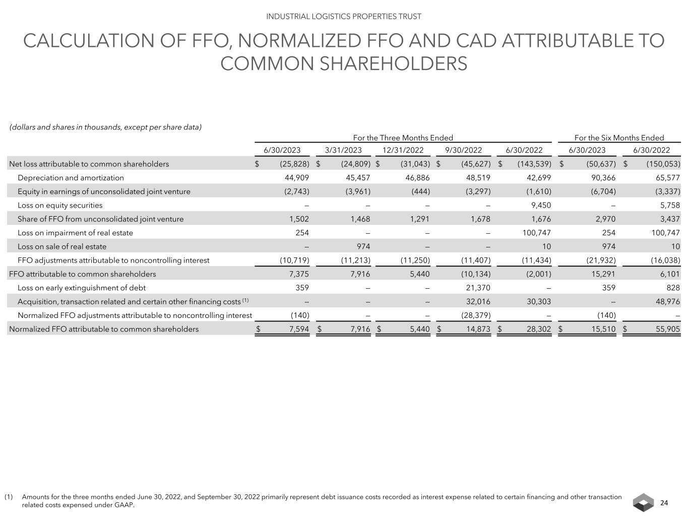 23 INDUSTRIAL LOGISTICS PROPERTIES TRUST CALCULATION OF EBITDA, EBITDAre AND ADJUSTED EBITDAre (1) Amounts represent equity based compensation to ILPT's trustees and officers and certain other employees of RMR. (dollars in thousands) For the Three Months Ended For the Six Months Ended 6/30/2023 3/31/2023 12/31/2022 9/30/2022 6/30/2022 6/30/2023 6/30/2022 Net loss $ (36,580) $ (35,546) $ (41,759) $ (83,974) $ (151,321) $ (72,126) $ (161,108) Plus: interest expense 71,846 70,771 71,765 89,739 77,548 142,617 118,547 Plus: income tax expense (benefit) 45 17 (68) 28 16 62 85 Plus: depreciation and amortization 44,909 45,457 46,886 48,519 42,699 90,366 65,577 EBITDA 80,220 80,699 76,824 54,312 (31,058) 160,919 23,101 Loss on impairment of real estate 254 — — — 100,747 254 100,747 Loss on sale of real estate — 974 — — 10 974 10 Equity in earnings of unconsolidated joint venture (2,743) (3,961) (444) (3,297) (1,610) (6,704) (3,337) Share of EBITDAre from unconsolidated joint venture 2,674 2,613 2,432 2,483 2,476 5,287 5,034 Loss on equity securities — — — — 9,450 — 5,758 EBITDAre 80,405 80,325 78,812 53,498 80,015 160,730 131,313 Plus: acquisition and other transaction related costs — — — 586 — — — Plus: general and administrative expense paid in common shares (1) 567 387 401 618 796 954 1,202 Plus: loss on early extinguishment of debt 359 — — 21,370 — 359 828 Adjusted EBITDAre $ 81,331 $ 80,712 $ 79,213 $ 76,072 $ 80,811 $ 162,043 $ 133,343
