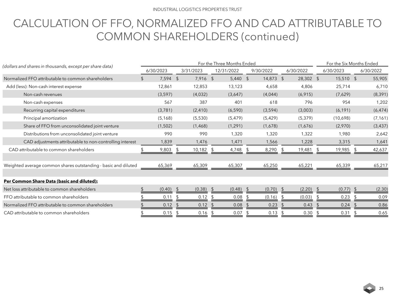 24 INDUSTRIAL LOGISTICS PROPERTIES TRUST CALCULATION OF FFO, NORMALIZED FFO AND CAD ATTRIBUTABLE TO COMMON SHAREHOLDERS For the Three Months Ended For the Six Months Ended 6/30/2023 3/31/2023 12/31/2022 9/30/2022 6/30/2022 6/30/2023 6/30/2022 Net loss attributable to common shareholders $ (25,828) $ (24,809) $ (31,043) $ (45,627) $ (143,539) $ (50,637) $ (150,053) Depreciation and amortization 44,909 45,457 46,886 48,519 42,699 90,366 65,577 Equity in earnings of unconsolidated joint venture (2,743) (3,961) (444) (3,297) (1,610) (6,704) (3,337) Loss on equity securities — — — — 9,450 — 5,758 Share of FFO from unconsolidated joint venture 1,502 1,468 1,291 1,678 1,676 2,970 3,437 Loss on impairment of real estate 254 — — — 100,747 254 100,747 Loss on sale of real estate — 974 — — 10 974 10 FFO adjustments attributable to noncontrolling interest (10,719) (11,213) (11,250) (11,407) (11,434) (21,932) (16,038) FFO attributable to common shareholders 7,375 7,916 5,440 (10,134) (2,001) 15,291 6,101 Loss on early extinguishment of debt 359 — — 21,370 — 359 828 Acquisition, transaction related and certain other financing costs (1) — — — 32,016 30,303 — 48,976 Normalized FFO adjustments attributable to noncontrolling interest (140) — — (28,379) — (140) — Normalized FFO attributable to common shareholders $ 7,594 $ 7,916 $ 5,440 $ 14,873 $ 28,302 $ 15,510 $ 55,905 (dollars and shares in thousands, except per share data) (1) Amounts for the three months ended June 30, 2022, and September 30, 2022 primarily represent debt issuance costs recorded as interest expense related to certain financing and other transaction related costs expensed under GAAP.