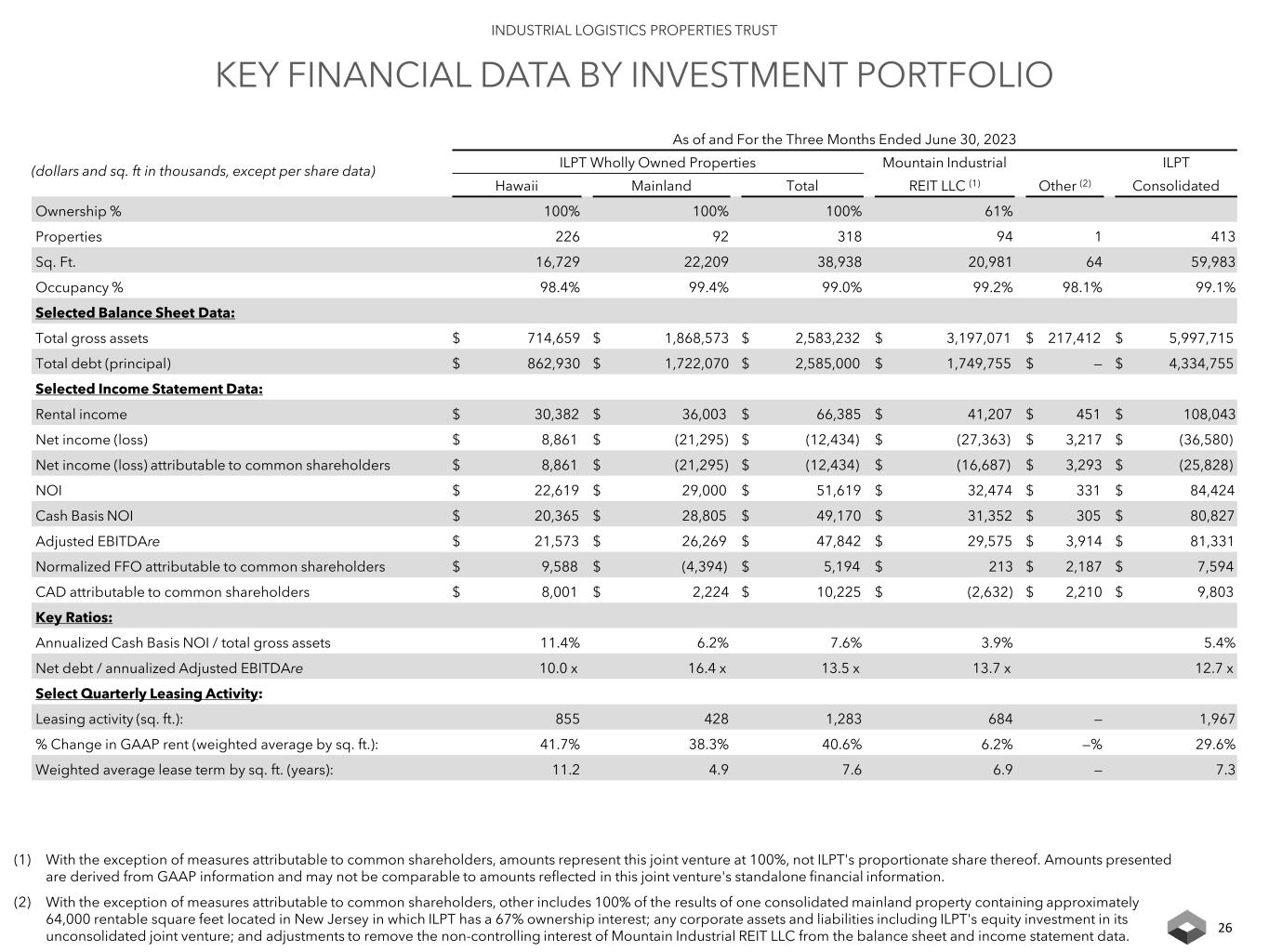 25 INDUSTRIAL LOGISTICS PROPERTIES TRUST CALCULATION OF FFO, NORMALIZED FFO AND CAD ATTRIBUTABLE TO COMMON SHAREHOLDERS (continued) For the Three Months Ended For the Six Months Ended 6/30/2023 3/31/2023 12/31/2022 9/30/2022 6/30/2022 6/30/2023 6/30/2022 Normalized FFO attributable to common shareholders $ 7,594 $ 7,916 $ 5,440 $ 14,873 $ 28,302 $ 15,510 $ 55,905 Add (less): Non-cash interest expense 12,861 12,853 13,123 4,658 4,806 25,714 6,710 Non-cash revenues (3,597) (4,032) (3,647) (4,044) (6,915) (7,629) (8,391) Non-cash expenses 567 387 401 618 796 954 1,202 Recurring capital expenditures (3,781) (2,410) (6,590) (3,594) (3,003) (6,191) (6,474) Principal amortization (5,168) (5,530) (5,479) (5,429) (5,379) (10,698) (7,161) Share of FFO from unconsolidated joint venture (1,502) (1,468) (1,291) (1,678) (1,676) (2,970) (3,437) Distributions from unconsolidated joint venture 990 990 1,320 1,320 1,322 1,980 2,642 CAD adjustments attributable to non-controlling interest 1,839 1,476 1,471 1,566 1,228 3,315 1,641 CAD attributable to common shareholders $ 9,803 $ 10,182 $ 4,748 $ 8,290 $ 19,481 $ 19,985 $ 42,637 Weighted average common shares outstanding - basic and diluted 65,369 65,309 65,307 65,250 65,221 65,339 65,217 Per Common Share Data (basic and diluted): Net loss attributable to common shareholders $ (0.40) $ (0.38) $ (0.48) $ (0.70) $ (2.20) $ (0.77) $ (2.30) FFO attributable to common shareholders $ 0.11 $ 0.12 $ 0.08 $ (0.16) $ (0.03) $ 0.23 $ 0.09 Normalized FFO attributable to common shareholders $ 0.12 $ 0.12 $ 0.08 $ 0.23 $ 0.43 $ 0.24 $ 0.86 CAD attributable to common shareholders $ 0.15 $ 0.16 $ 0.07 $ 0.13 $ 0.30 $ 0.31 $ 0.65 (dollars and shares in thousands, except per share data)