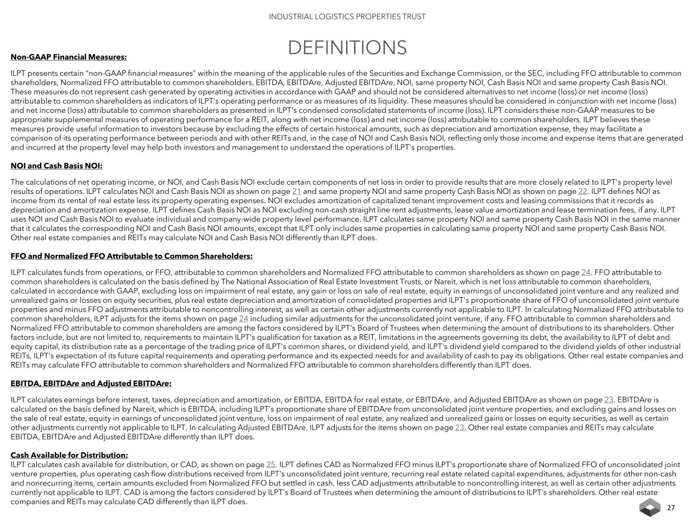 27 INDUSTRIAL LOGISTICS PROPERTIES TRUST DEFINITIONS Non-GAAP Financial Measures: ILPT presents certain “non-GAAP financial measures” within the meaning of the applicable rules of the Securities and Exchange Commission, or the SEC, including FFO attributable to common shareholders, Normalized FFO attributable to common shareholders, EBITDA, EBITDAre, Adjusted EBITDAre, NOI, same property NOI, Cash Basis NOI and same property Cash Basis NOI. These measures do not represent cash generated by operating activities in accordance with GAAP and should not be considered alternatives to net income (loss) or net income (loss) attributable to common shareholders as indicators of ILPT's operating performance or as measures of its liquidity. These measures should be considered in conjunction with net income (loss) and net income (loss) attributable to common shareholders as presented in ILPT's condensed consolidated statements of income (loss). ILPT considers these non-GAAP measures to be appropriate supplemental measures of operating performance for a REIT, along with net income (loss) and net income (loss) attributable to common shareholders. ILPT believes these measures provide useful information to investors because by excluding the effects of certain historical amounts, such as depreciation and amortization expense, they may facilitate a comparison of its operating performance between periods and with other REITs and, in the case of NOI and Cash Basis NOI, reflecting only those income and expense items that are generated and incurred at the property level may help both investors and management to understand the operations of ILPT's properties. NOI and Cash Basis NOI: The calculations of net operating income, or NOI, and Cash Basis NOI exclude certain components of net loss in order to provide results that are more closely related to ILPT's property level results of operations. ILPT calculates NOI and Cash Basis NOI as shown on page 21 and same property NOI and same property Cash Basis NOI as shown on page 22. ILPT defines NOI as income from its rental of real estate less its property operating expenses. NOI excludes amortization of capitalized tenant improvement costs and leasing commissions that it records as depreciation and amortization expense. ILPT defines Cash Basis NOI as NOI excluding non-cash straight line rent adjustments, lease value amortization and lease termination fees, if any. ILPT uses NOI and Cash Basis NOI to evaluate individual and company-wide property level performance. ILPT calculates same property NOI and same property Cash Basis NOI in the same manner that it calculates the corresponding NOI and Cash Basis NOI amounts, except that ILPT only includes same properties in calculating same property NOI and same property Cash Basis NOI. Other real estate companies and REITs may calculate NOI and Cash Basis NOI differently than ILPT does. FFO and Normalized FFO Attributable to Common Shareholders: ILPT calculates funds from operations, or FFO, attributable to common shareholders and Normalized FFO attributable to common shareholders as shown on page 24. FFO attributable to common shareholders is calculated on the basis defined by The National Association of Real Estate Investment Trusts, or Nareit, which is net loss attributable to common shareholders, calculated in accordance with GAAP, excluding loss on impairment of real estate, any gain or loss on sale of real estate, equity in earnings of unconsolidated joint venture and any realized and unrealized gains or losses on equity securities, plus real estate depreciation and amortization of consolidated properties and ILPT's proportionate share of FFO of unconsolidated joint venture properties and minus FFO adjustments attributable to noncontrolling interest, as well as certain other adjustments currently not applicable to ILPT. In calculating Normalized FFO attributable to common shareholders, ILPT adjusts for the items shown on page 24 including similar adjustments for the unconsolidated joint venture, if any. FFO attributable to common shareholders and Normalized FFO attributable to common shareholders are among the factors considered by ILPT's Board of Trustees when determining the amount of distributions to its shareholders. Other factors include, but are not limited to, requirements to maintain ILPT's qualification for taxation as a REIT, limitations in the agreements governing its debt, the availability to ILPT of debt and equity capital, its distribution rate as a percentage of the trading price of ILPT's common shares, or dividend yield, and ILPT's dividend yield compared to the dividend yields of other industrial REITs, ILPT's expectation of its future capital requirements and operating performance and its expected needs for and availability of cash to pay its obligations. Other real estate companies and REITs may calculate FFO attributable to common shareholders and Normalized FFO attributable to common shareholders differently than ILPT does. EBITDA, EBITDAre and Adjusted EBITDAre: ILPT calculates earnings before interest, taxes, depreciation and amortization, or EBITDA, EBITDA for real estate, or EBITDAre, and Adjusted EBITDAre as shown on page 23. EBITDAre is calculated on the basis defined by Nareit, which is EBITDA, including ILPT's proportionate share of EBITDAre from unconsolidated joint venture properties, and excluding gains and losses on the sale of real estate, equity in earnings of unconsolidated joint venture, loss on impairment of real estate, any realized and unrealized gains or losses on equity securities, as well as certain other adjustments currently not applicable to ILPT. In calculating Adjusted EBITDAre, ILPT adjusts for the items shown on page 23. Other real estate companies and REITs may calculate EBITDA, EBITDAre and Adjusted EBITDAre differently than ILPT does. Cash Available for Distribution: ILPT calculates cash available for distribution, or CAD, as shown on page 25. ILPT defines CAD as