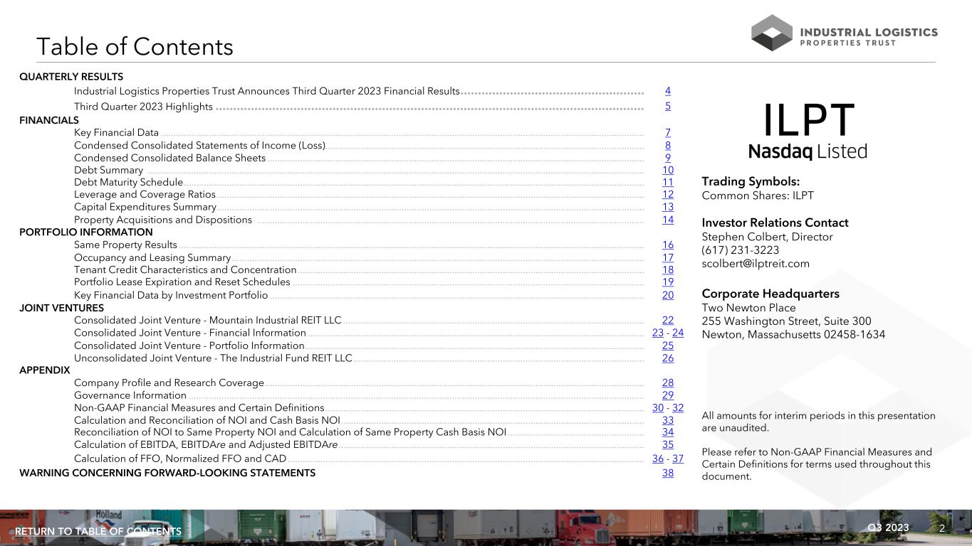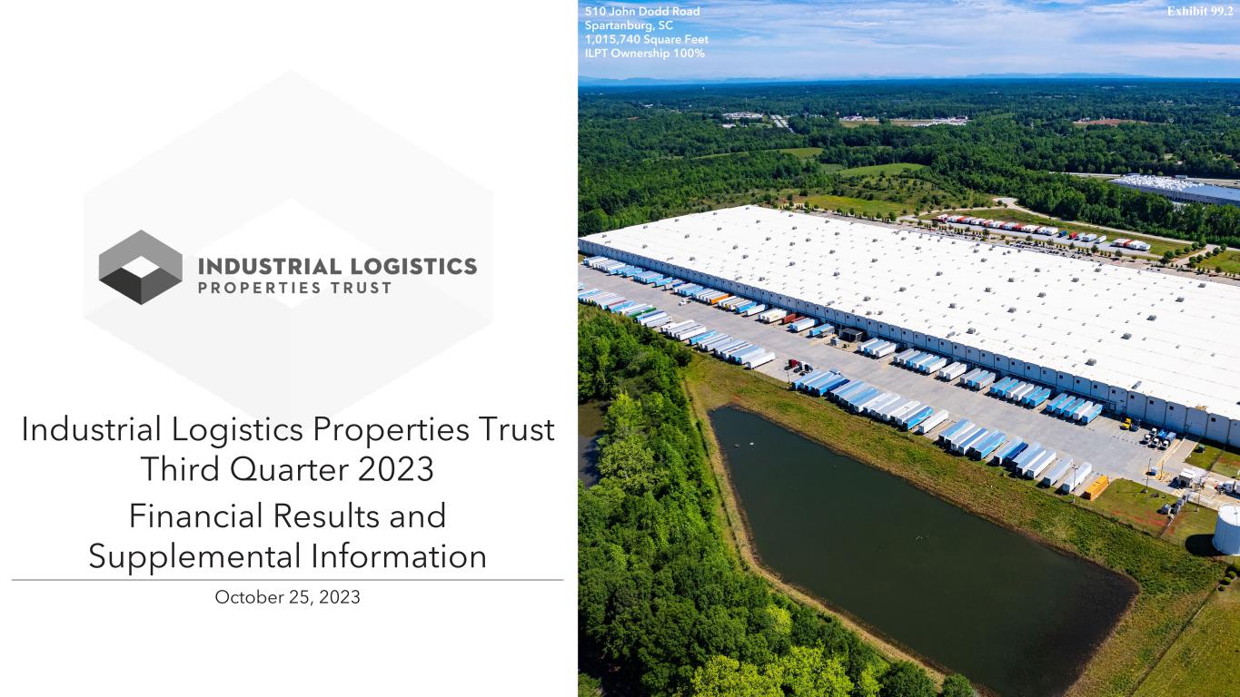 2Q3 2023RETURN TO TABLE OF CONTENTS QUARTERLY RESULTS Industrial Logistics Properties Trust Announces Third Quarter 2023 Financial Results .................................................... 4 Third Quarter 2023 Highlights ......................................................................................................................... 5 FINANCIALS Key Financial Data ............................................................................................................................................................................................... 7 Condensed Consolidated Statements of Income (Loss) .............................................................................................................................. 8 Condensed Consolidated Balance Sheets ..................................................................................................................................................... 9 Debt Summary .................................................................................................................................................................................................... 10 Debt Maturity Schedule ...................................................................................................................................................................................... 11 Leverage and Coverage Ratios ......................................................................................................................................................................... 12 Capital Expenditures Summary ......................................................................................................................................................................... 13 Property Acquisitions and Dispositions ......................................................................................................................................................... 14 PORTFOLIO INFORMATION Same Property Results ........................................................................................................................................................................................ 16 Occupancy and Leasing Summary ................................................................................................................................................................... 17 Tenant Credit Characteristics and Concentration ......................................................................................................................................... 18 Portfolio Lease Expiration and Reset Schedules ........................................................................................................................................... 19 Key Financial Data by Investment Portfolio .................................................................................................................................................... 20 JOINT VENTURES Consolidated Joint Venture - Mountain Industrial REIT LLC ....................................................................................................................... 22 Consolidated Joint Venture - Financial Information ..................................................................................................................................... 23 - 24 Consolidated Joint Venture - Portfolio Information ...................................................................................................................................... 25 Unconsolidated Joint Venture - The Industrial Fund REIT LLC ................................................................................................................... 26 APPENDIX Company Profile and Research Coverage ...................................................................................................................................................... 28 Governance Information .................................................................................................................................................................................... 29 Non-GAAP Financial Measures and Certain Definitions .............................................................................................................................. 30 - 32 Calculation and Reconciliation of NOI and Cash Basis NOI ........................................................................................................................ 33 Reconciliation of NOI to Same Property NOI and Calculation of Same Property Cash Basis NOI ...................................................... 34 Calculation of EBITDA, EBITDAre and Adjusted EBITDAre ......................................................................................................................... 35 Calculation of FFO, Normalized FFO and CAD ............................................................................................................................................. 36 - 37 WARNING CONCERNING FORWARD-LOOKING STATEMENTS 38 Table of Contents All amounts for interim periods in this presentation are unaudited. Please refer to Non-GAAP Financial Measures and Certain Definitions for terms used throughout this document. Trading Symbols: Common Shares: ILPT Investor Relations Contact Stephen Colbert, Director (617) 231-3223 scolbert@ilptreit.com Corporate Headquarters Two Newton Place 255 Washington Street, Suite 300 Newton, Massachusetts 02458-1634