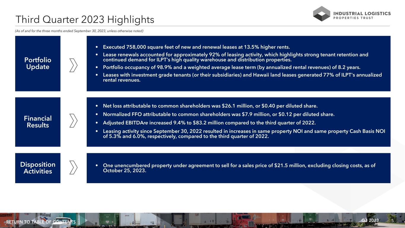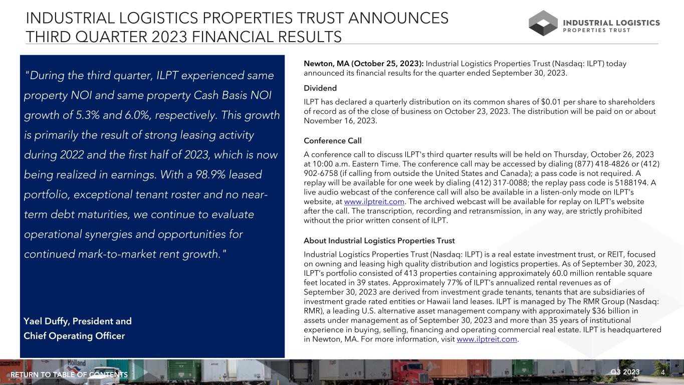 4Q3 2023RETURN TO TABLE OF CONTENTS "During the third quarter, ILPT experienced same property NOI and same property Cash Basis NOI growth of 5.3% and 6.0%, respectively. This growth is primarily the result of strong leasing activity during 2022 and the first half of 2023, which is now being realized in earnings. With a 98.9% leased portfolio, exceptional tenant roster and no near- term debt maturities, we continue to evaluate operational synergies and opportunities for continued mark-to-market rent growth." Yael Duffy, President and Chief Operating Officer INDUSTRIAL LOGISTICS PROPERTIES TRUST ANNOUNCES THIRD QUARTER 2023 FINANCIAL RESULTS Newton, MA (October 25, 2023): Industrial Logistics Properties Trust (Nasdaq: ILPT) today announced its financial results for the quarter ended September 30, 2023. Dividend ILPT has declared a quarterly distribution on its common shares of $0.01 per share to shareholders of record as of the close of business on October 23, 2023. The distribution will be paid on or about November 16, 2023. Conference Call A conference call to discuss ILPT's third quarter results will be held on Thursday, October 26, 2023 at 10:00 a.m. Eastern Time. The conference call may be accessed by dialing (877) 418-4826 or (412) 902-6758 (if calling from outside the United States and Canada); a pass code is not required. A replay will be available for one week by dialing (412) 317-0088; the replay pass code is 5188194. A live audio webcast of the conference call will also be available in a listen-only mode on ILPT’s website, at www.ilptreit.com. The archived webcast will be available for replay on ILPT’s website after the call. The transcription, recording and retransmission, in any way, are strictly prohibited without the prior written consent of ILPT. About Industrial Logistics Properties Trust Industrial Logistics Properties Trust (Nasdaq: ILPT) is a real estate investment trust, or REIT, focused on owning and leasing high quality distribution and logistics properties. As of September 30, 2023, ILPT’s portfolio consisted of 413 properties containing approximately 60.0 million rentable square feet located in 39 states. Approximately 77% of ILPT’s annualized rental revenues as of September 30, 2023 are derived from investment grade tenants, tenants that are subsidiaries of investment grade rated entities or Hawaii land leases. ILPT is managed by The RMR Group (Nasdaq: RMR), a leading U.S. alternative asset management company with approximately $36 billion in assets under management as of September 30, 2023 and more than 35 years of institutional experience in buying, selling, financing and operating commercial real estate. ILPT is headquartered in Newton, MA. For more information, visit www.ilptreit.com.