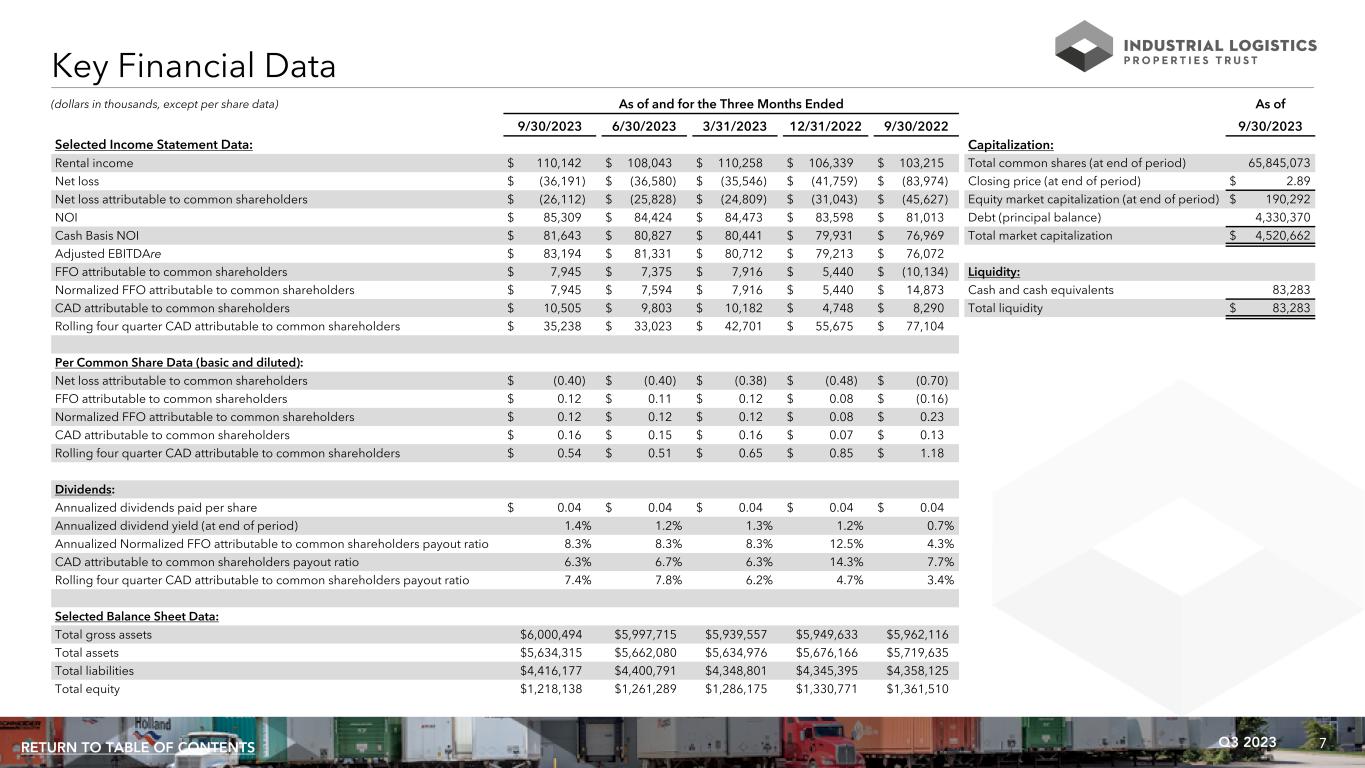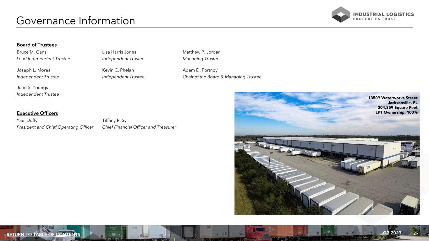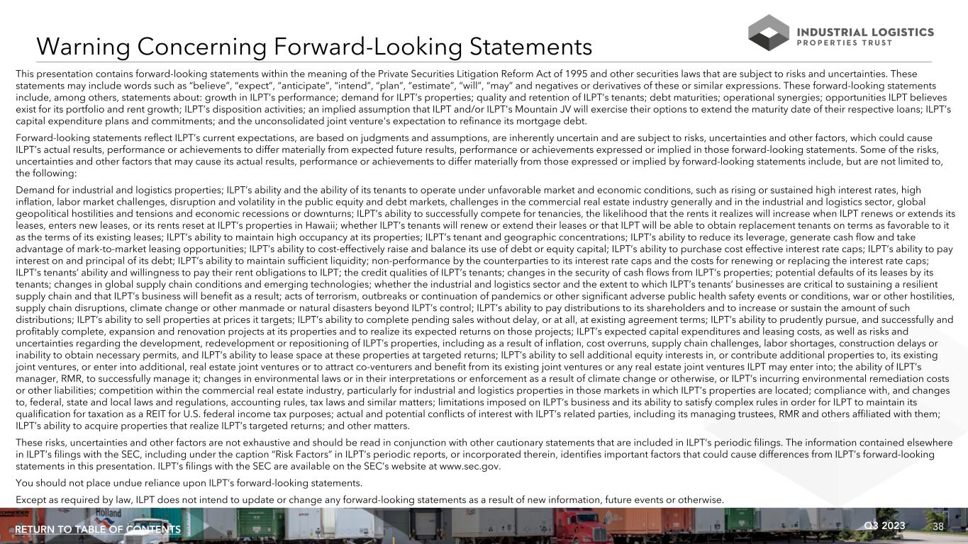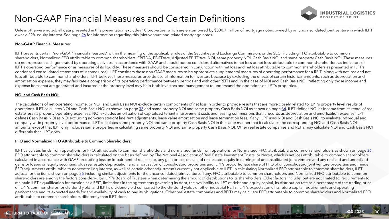 30Q3 2023RETURN TO TABLE OF CONTENTS Unless otherwise noted, all data presented in this presentation excludes 18 properties, which are encumbered by $530.7 million of mortgage notes, owned by an unconsolidated joint venture in which ILPT owns a 22% equity interest. See page 26 for information regarding this joint venture and related mortgage notes. Non-GAAP Financial Measures: ILPT presents certain “non-GAAP financial measures” within the meaning of the applicable rules of the Securities and Exchange Commission, or the SEC, including FFO attributable to common shareholders, Normalized FFO attributable to common shareholders, EBITDA, EBITDAre, Adjusted EBITDAre, NOI, same property NOI, Cash Basis NOI and same property Cash Basis NOI. These measures do not represent cash generated by operating activities in accordance with GAAP and should not be considered alternatives to net loss or net loss attributable to common shareholders as indicators of ILPT's operating performance or as measures of its liquidity. These measures should be considered in conjunction with net loss and net loss attributable to common shareholders as presented in ILPT's condensed consolidated statements of income (loss). ILPT considers these non-GAAP measures to be appropriate supplemental measures of operating performance for a REIT, along with net loss and net loss attributable to common shareholders. ILPT believes these measures provide useful information to investors because by excluding the effects of certain historical amounts, such as depreciation and amortization expense, they may facilitate a comparison of its operating performance between periods and with other REITs and, in the case of NOI and Cash Basis NOI, reflecting only those income and expense items that are generated and incurred at the property level may help both investors and management to understand the operations of ILPT's properties. NOI and Cash Basis NOI: The calculations of net operating income, or NOI, and Cash Basis NOI exclude certain components of net loss in order to provide results that are more closely related to ILPT's property level results of operations. ILPT calculates NOI and Cash Basis NOI as shown on page 33 and same property NOI and same property Cash Basis NOI as shown on page 34. ILPT defines NOI as income from its rental of real estate less its property operating expenses. NOI excludes amortization of capitalized tenant improvement costs and leasing commissions that it records as depreciation and amortization expense. ILPT defines Cash Basis NOI as NOI excluding non-cash straight line rent adjustments, lease value amortization and lease termination fees, if any. ILPT uses NOI and Cash Basis NOI to evaluate individual and company-wide property level performance. ILPT calculates same property NOI and same property Cash Basis NOI in the same manner that it calculates the corresponding NOI and Cash Basis NOI amounts, except that ILPT only includes same properties in calculating same property NOI and same property Cash Basis NOI. Other real estate companies and REITs may calculate NOI and Cash Basis NOI differently than ILPT does. FFO and Normalized FFO Attributable to Common Shareholders: ILPT calculates funds from operations, or FFO, attributable to common shareholders and normalized funds from operations, or Normalized FFO, attributable to common shareholders as shown on page 36. FFO attributable to common shareholders is calculated on the basis defined by The National Association of Real Estate Investment Trusts, or Nareit, which is net loss attributable to common shareholders, calculated in accordance with GAAP, excluding loss on impairment of real estate, any gain or loss on sale of real estate, equity in earnings of unconsolidated joint venture and any realized and unrealized gains or losses on equity securities, plus real estate depreciation and amortization of consolidated properties and ILPT's proportionate share of FFO of unconsolidated joint venture properties and minus FFO adjustments attributable to noncontrolling interest, as well as certain other adjustments currently not applicable to ILPT. In calculating Normalized FFO attributable to common shareholders, ILPT adjusts for the items shown on page 36 including similar adjustments for the unconsolidated joint venture, if any. FFO attributable to common shareholders and Normalized FFO attributable to common shareholders are among the factors considered by ILPT's Board of Trustees when determining the amount of distributions to its shareholders. Other factors include, but are not limited to, requirements to maintain ILPT's qualification for taxation as a REIT, limitations in the agreements governing its debt, the availability to ILPT of debt and equity capital, its distribution rate as a percentage of the trading price of ILPT's common shares, or dividend yield, and ILPT's dividend yield compared to the dividend yields of other industrial REITs, ILPT's expectation of its future capital requirements and operating performance and its expected needs for and availability of cash to pay its obligations. Other real estate companies and REITs may calculate FFO attributable to common shareholders and Normalized FFO attributable to common shareholders differently than ILPT does. Non-GAAP Financial Measures and Certain Definitions