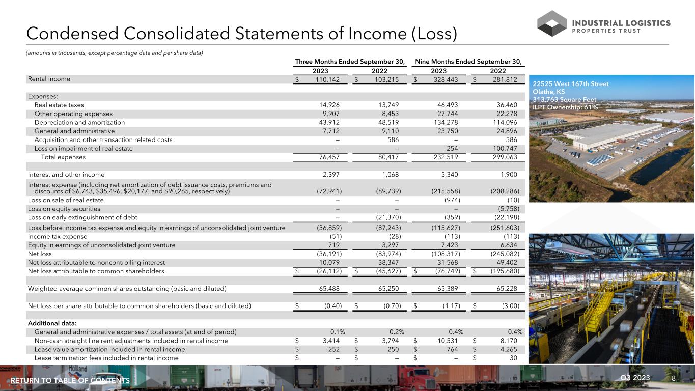 8Q3 2023RETURN TO TABLE OF CONTENTS Condensed Consolidated Statements of Income (Loss) Three Months Ended September 30, Nine Months Ended September 30, 2023 2022 2023 2022 Rental income $ 110,142 $ 103,215 $ 328,443 $ 281,812 Expenses: Real estate taxes 14,926 13,749 46,493 36,460 Other operating expenses 9,907 8,453 27,744 22,278 Depreciation and amortization 43,912 48,519 134,278 114,096 General and administrative 7,712 9,110 23,750 24,896 Acquisition and other transaction related costs — 586 — 586 Loss on impairment of real estate — — 254 100,747 Total expenses 76,457 80,417 232,519 299,063 Interest and other income 2,397 1,068 5,340 1,900 Interest expense (including net amortization of debt issuance costs, premiums and discounts of $6,743, $35,496, $20,177, and $90,265, respectively) (72,941) (89,739) (215,558) (208,286) Loss on sale of real estate — — (974) (10) Loss on equity securities — — — (5,758) Loss on early extinguishment of debt — (21,370) (359) (22,198) Loss before income tax expense and equity in earnings of unconsolidated joint venture (36,859) (87,243) (115,627) (251,603) Income tax expense (51) (28) (113) (113) Equity in earnings of unconsolidated joint venture 719 3,297 7,423 6,634 Net loss (36,191) (83,974) (108,317) (245,082) Net loss attributable to noncontrolling interest 10,079 38,347 31,568 49,402 Net loss attributable to common shareholders $ (26,112) $ (45,627) $ (76,749) $ (195,680) Weighted average common shares outstanding (basic and diluted) 65,488 65,250 65,389 65,228 Net loss per share attributable to common shareholders (basic and diluted) $ (0.40) $ (0.70) $ (1.17) $ (3.00) Additional data: General and administrative expenses / total assets (at end of period) 0.1% 0.2% 0.4% 0.4% Non-cash straight line rent adjustments included in rental income $ 3,414 $ 3,794 $ 10,531 $ 8,170 Lease value amortization included in rental income $ 252 $ 250 $ 764 $ 4,265 Lease termination fees included in rental income $ — $ — $ — $ 30 (amounts in thousands, except percentage data and per share data) 22525 West 167th Street Olathe, KS 313,763 Square Feet ILPT Ownership: 61%