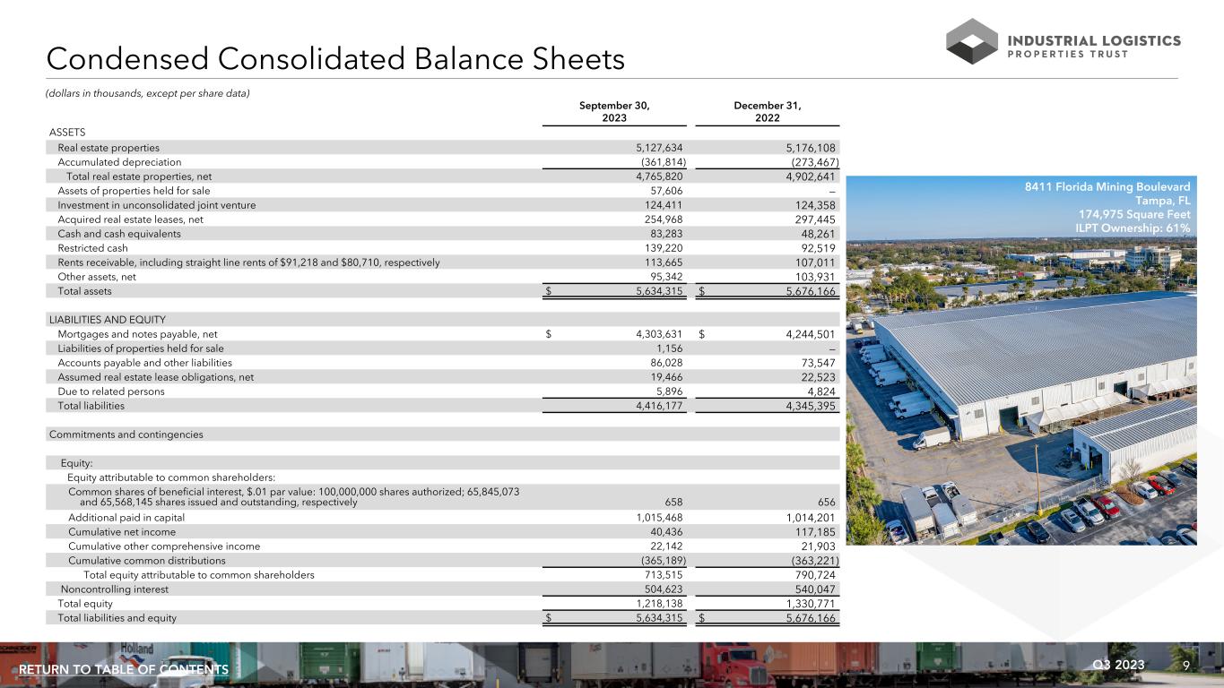 9Q3 2023RETURN TO TABLE OF CONTENTS Condensed Consolidated Balance Sheets September 30, December 31, 2023 2022 ASSETS Real estate properties 5,127,634 5,176,108 Accumulated depreciation (361,814) (273,467) Total real estate properties, net 4,765,820 4,902,641 Assets of properties held for sale 57,606 — Investment in unconsolidated joint venture 124,411 124,358 Acquired real estate leases, net 254,968 297,445 Cash and cash equivalents 83,283 48,261 Restricted cash 139,220 92,519 Rents receivable, including straight line rents of $91,218 and $80,710, respectively 113,665 107,011 Other assets, net 95,342 103,931 Total assets $ 5,634,315 $ 5,676,166 LIABILITIES AND EQUITY Mortgages and notes payable, net $ 4,303,631 $ 4,244,501 Liabilities of properties held for sale 1,156 — Accounts payable and other liabilities 86,028 73,547 Assumed real estate lease obligations, net 19,466 22,523 Due to related persons 5,896 4,824 Total liabilities 4,416,177 4,345,395 Commitments and contingencies Equity: Equity attributable to common shareholders: Common shares of beneficial interest, $.01 par value: 100,000,000 shares authorized; 65,845,073 and 65,568,145 shares issued and outstanding, respectively 658 656 Additional paid in capital 1,015,468 1,014,201 Cumulative net income 40,436 117,185 Cumulative other comprehensive income 22,142 21,903 Cumulative common distributions (365,189) (363,221) Total equity attributable to common shareholders 713,515 790,724 Noncontrolling interest 504,623 540,047 Total equity 1,218,138 1,330,771 Total liabilities and equity $ 5,634,315 $ 5,676,166 (dollars in thousands, except per share data) 8411 Florida Mining Boulevard Tampa, FL 174,975 Square Feet ILPT Ownership: 61%
