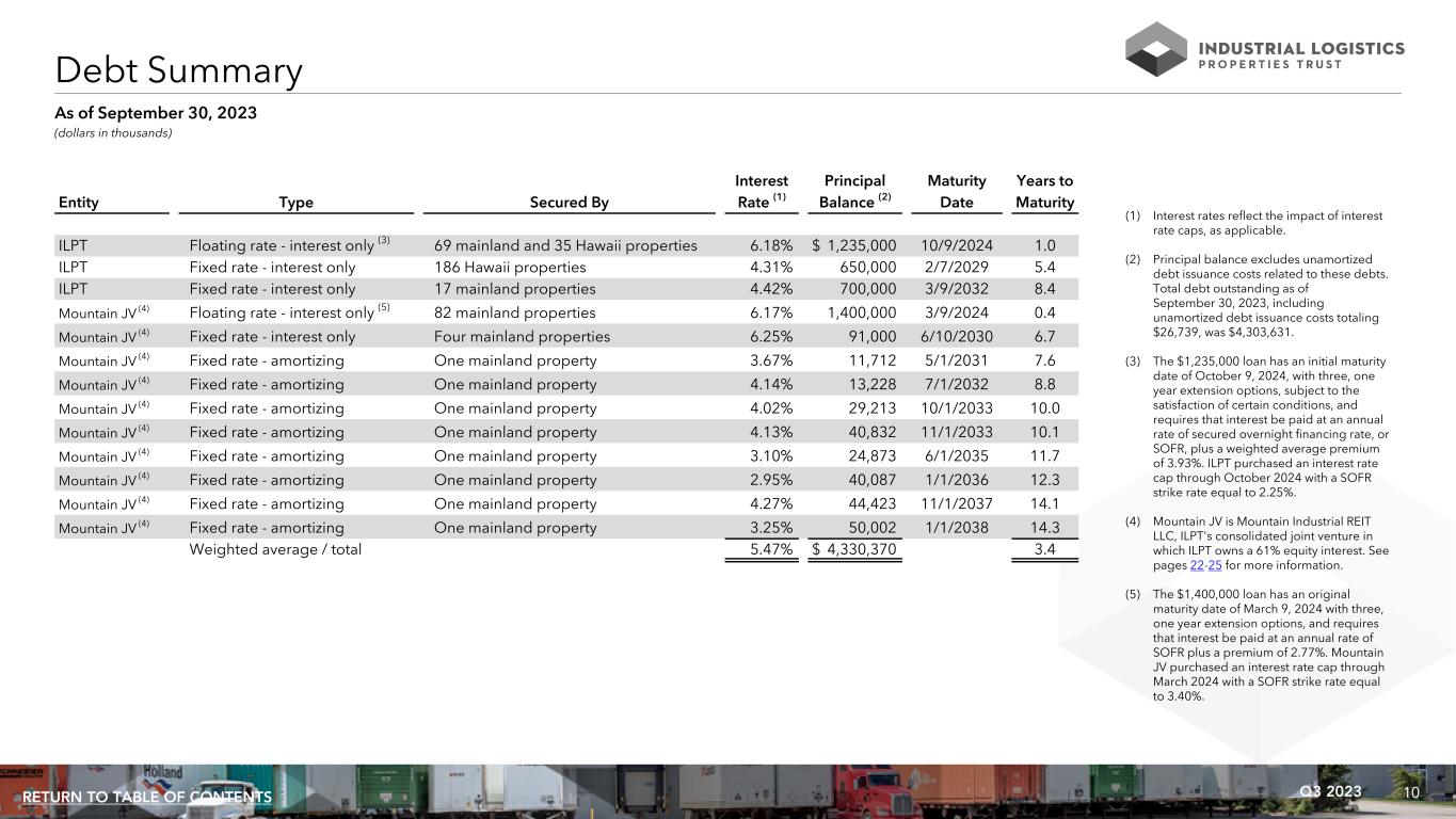 10Q3 2023RETURN TO TABLE OF CONTENTS (1) Interest rates reflect the impact of interest rate caps, as applicable. (2) Principal balance excludes unamortized debt issuance costs related to these debts. Total debt outstanding as of September 30, 2023, including unamortized debt issuance costs totaling $26,739, was $4,303,631. (3) The $1,235,000 loan has an initial maturity date of October 9, 2024, with three, one year extension options, subject to the satisfaction of certain conditions, and requires that interest be paid at an annual rate of secured overnight financing rate, or SOFR, plus a weighted average premium of 3.93%. ILPT purchased an interest rate cap through October 2024 with a SOFR strike rate equal to 2.25%. (4) Mountain JV is Mountain Industrial REIT LLC, ILPT's consolidated joint venture in which ILPT owns a 61% equity interest. See pages 22-25 for more information. (5) The $1,400,000 loan has an original maturity date of March 9, 2024 with three, one year extension options, and requires that interest be paid at an annual rate of SOFR plus a premium of 2.77%. Mountain JV purchased an interest rate cap through March 2024 with a SOFR strike rate equal to 3.40%. Interest Principal Maturity Years to Entity Type Secured By Rate (1) Balance (2) Date Maturity ILPT Floating rate - interest only (3) 69 mainland and 35 Hawaii properties 6.18% $ 1,235,000 10/9/2024 1.0 ILPT Fixed rate - interest only 186 Hawaii properties 4.31% 650,000 2/7/2029 5.4 ILPT Fixed rate - interest only 17 mainland properties 4.42% 700,000 3/9/2032 8.4 Mountain JV (4) Floating rate - interest only (5) 82 mainland properties 6.17% 1,400,000 3/9/2024 0.4 Mountain JV (4) Fixed rate - interest only Four mainland properties 6.25% 91,000 6/10/2030 6.7 Mountain JV (4) Fixed rate - amortizing One mainland property 3.67% 11,712 5/1/2031 7.6 Mountain JV (4) Fixed rate - amortizing One mainland property 4.14% 13,228 7/1/2032 8.8 Mountain JV (4) Fixed rate - amortizing One mainland property 4.02% 29,213 10/1/2033 10.0 Mountain JV (4) Fixed rate - amortizing One mainland property 4.13% 40,832 11/1/2033 10.1 Mountain JV (4) Fixed rate - amortizing One mainland property 3.10% 24,873 6/1/2035 11.7 Mountain JV (4) Fixed rate - amortizing One mainland property 2.95% 40,087 1/1/2036 12.3 Mountain JV (4) Fixed rate - amortizing One mainland property 4.27% 44,423 11/1/2037 14.1 Mountain JV (4) Fixed rate - amortizing One mainland property 3.25% 50,002 1/1/2038 14.3 Weighted average / total 5.47% $ 4,330,370 3.4 Debt Summary (dollars in thousands) As of September 30, 2023