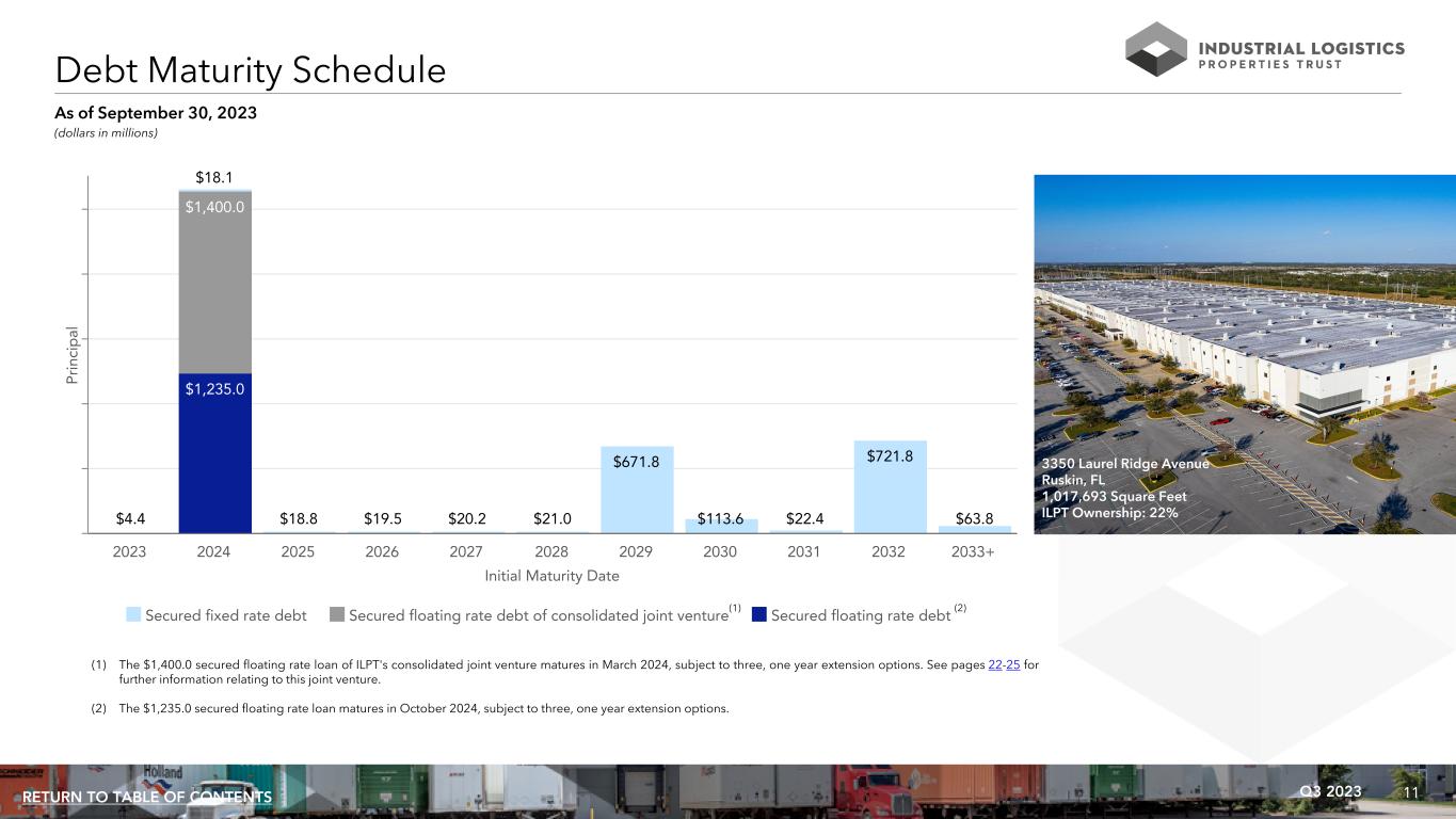 11Q3 2023RETURN TO TABLE OF CONTENTS (1) The $1,400.0 secured floating rate loan of ILPT's consolidated joint venture matures in March 2024, subject to three, one year extension options. See pages 22-25 for further information relating to this joint venture. (2) The $1,235.0 secured floating rate loan matures in October 2024, subject to three, one year extension options. Debt Maturity Schedule (dollars in millions) As of September 30, 2023 Initial Maturity Date Pr in ci p al $1,235.0 $1,400.0 $4.4 $18.1 $18.8 $19.5 $20.2 $21.0 $671.8 $113.6 $22.4 $721.8 $63.8 Secured fixed rate debt Secured floating rate debt of consolidated joint venture Secured floating rate debt 2023 2024 2025 2026 2027 2028 2029 2030 2031 2032 2033+ (2) 3350 Laurel Ridge Avenue Ruskin, FL 1,017,693 Square Feet ILPT Ownership: 22% (1)