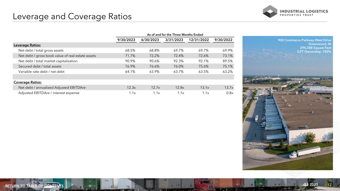 12Q3 2023RETURN TO TABLE OF CONTENTS As of and for the Three Months Ended 9/30/2023 6/30/2023 3/31/2023 12/31/2022 9/30/2022 Leverage Ratios: Net debt / total gross assets 68.5% 68.8% 69.7% 69.7% 69.9% Net debt / gross book value of real estate assets 71.7% 72.2% 72.4% 72.6% 73.1% Net debt / total market capitalization 90.9% 90.6% 92.3% 92.1% 89.5% Secured debt / total assets 76.9% 76.6% 76.0% 75.6% 75.1% Variable rate debt / net debt 64.1% 63.9% 63.7% 63.5% 63.2% Coverage Ratios: Net debt / annualized Adjusted EBITDAre 12.3x 12.7x 12.8x 13.1x 13.7x Adjusted EBITDAre / interest expense 1.1x 1.1x 1.1x 1.1x 0.8x Leverage and Coverage Ratios 900 Commerce Parkway West Drive Greenwood, IN 294,388 Square Feet ILPT Ownership: 100%