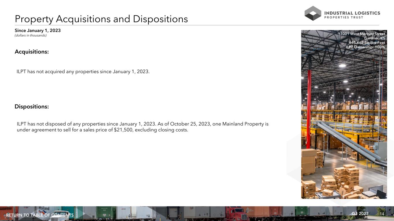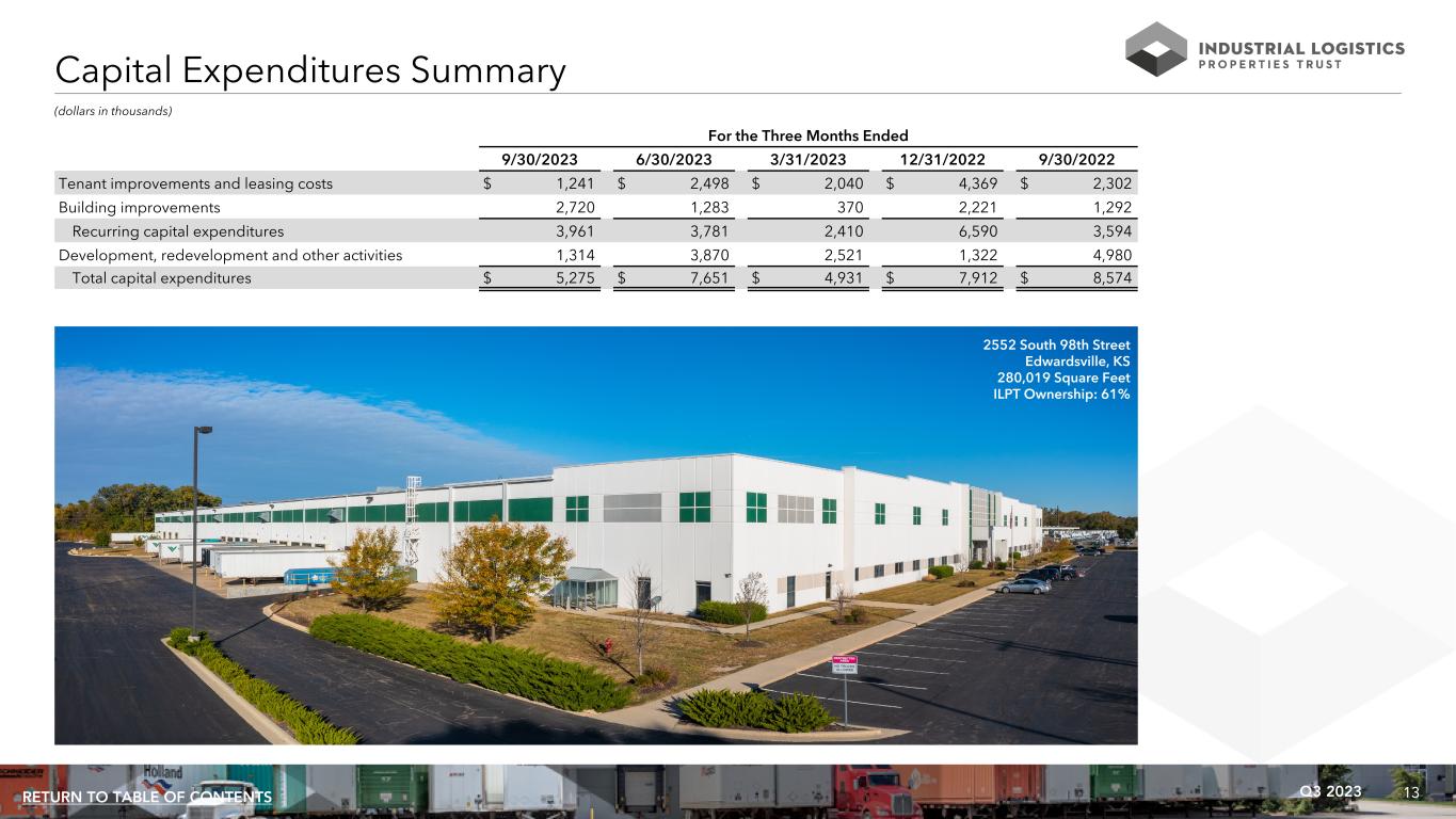 13Q3 2023RETURN TO TABLE OF CONTENTS (dollars in thousands) For the Three Months Ended 9/30/2023 6/30/2023 3/31/2023 12/31/2022 9/30/2022 Tenant improvements and leasing costs $ 1,241 $ 2,498 $ 2,040 $ 4,369 $ 2,302 Building improvements 2,720 1,283 370 2,221 1,292 Recurring capital expenditures 3,961 3,781 2,410 6,590 3,594 Development, redevelopment and other activities 1,314 3,870 2,521 1,322 4,980 Total capital expenditures $ 5,275 $ 7,651 $ 4,931 $ 7,912 $ 8,574 Capital Expenditures Summary 2552 South 98th Street Edwardsville, KS 280,019 Square Feet ILPT Ownership: 61%