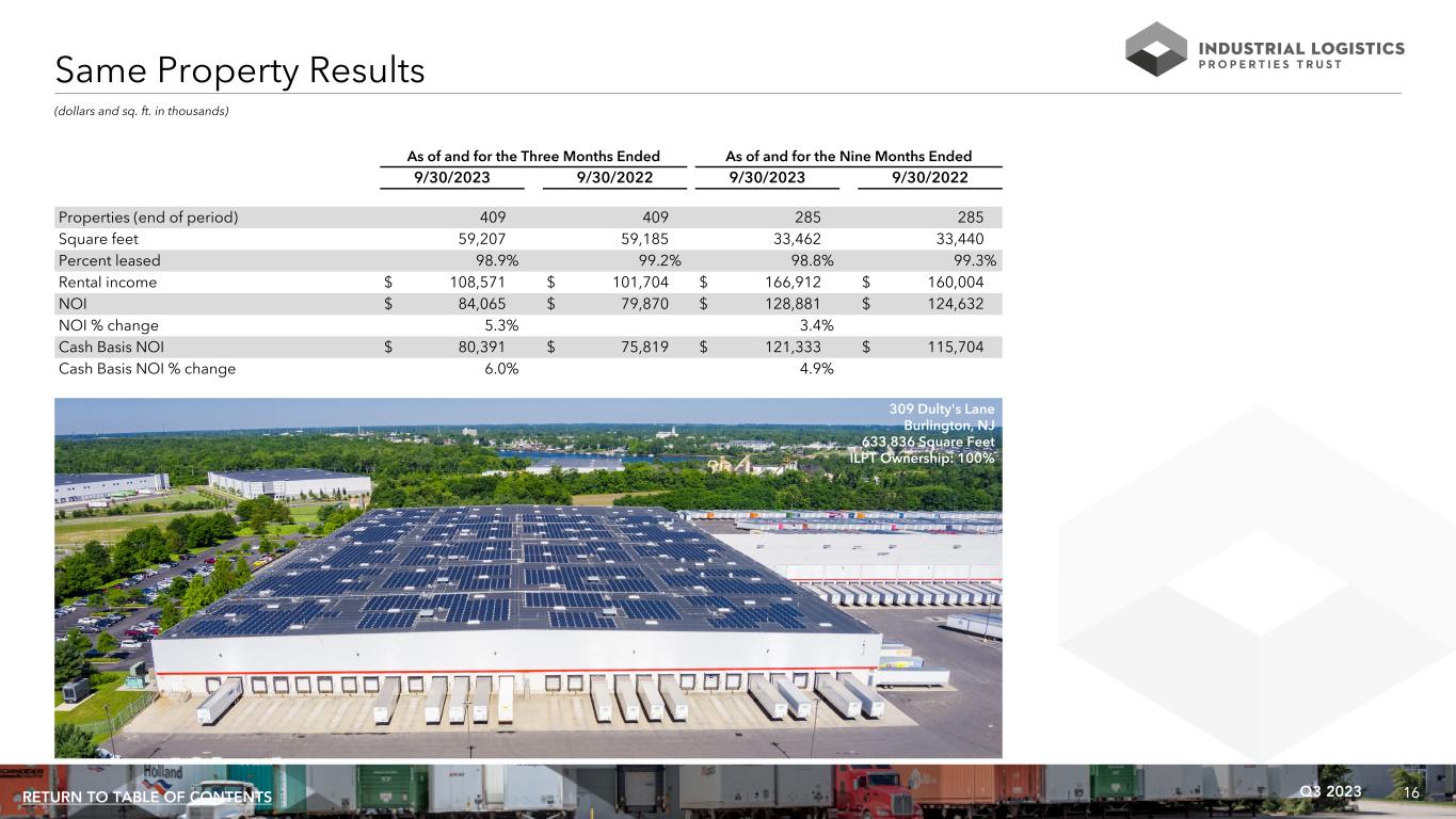 16Q3 2023RETURN TO TABLE OF CONTENTS (dollars and sq. ft. in thousands) As of and for the Three Months Ended As of and for the Nine Months Ended 9/30/2023 9/30/2022 9/30/2023 9/30/2022 Properties (end of period) 409 409 285 285 Square feet 59,207 59,185 33,462 33,440 Percent leased 98.9% 99.2% 98.8% 99.3% Rental income $ 108,571 $ 101,704 $ 166,912 $ 160,004 NOI $ 84,065 $ 79,870 $ 128,881 $ 124,632 NOI % change 5.3% 3.4% Cash Basis NOI $ 80,391 $ 75,819 $ 121,333 $ 115,704 Cash Basis NOI % change 6.0% 4.9% Same Property Results 309 Dulty's Lane Burlington, NJ 633,836 Square Feet ILPT Ownership: 100%