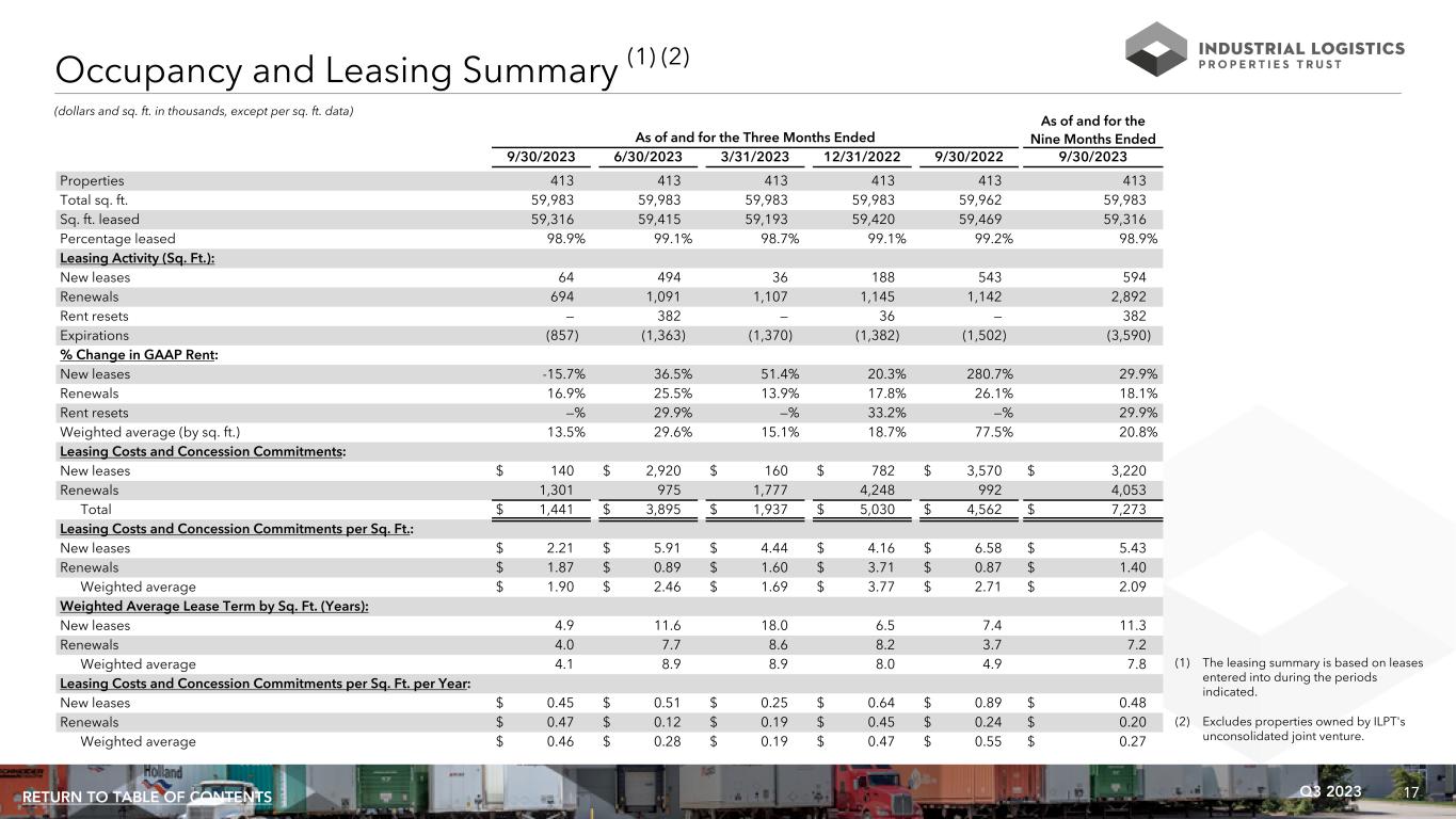17Q3 2023RETURN TO TABLE OF CONTENTS (dollars and sq. ft. in thousands, except per sq. ft. data) As of and for the As of and for the Three Months Ended Nine Months Ended 9/30/2023 6/30/2023 3/31/2023 12/31/2022 9/30/2022 9/30/2023 Properties 413 413 413 413 413 413 Total sq. ft. 59,983 59,983 59,983 59,983 59,962 59,983 Sq. ft. leased 59,316 59,415 59,193 59,420 59,469 59,316 Percentage leased 98.9% 99.1% 98.7% 99.1% 99.2% 98.9% Leasing Activity (Sq. Ft.): New leases 64 494 36 188 543 594 Renewals 694 1,091 1,107 1,145 1,142 2,892 Rent resets — 382 — 36 — 382 Expirations (857) (1,363) (1,370) (1,382) (1,502) (3,590) % Change in GAAP Rent: New leases -15.7% 36.5% 51.4% 20.3% 280.7% 29.9% Renewals 16.9% 25.5% 13.9% 17.8% 26.1% 18.1% Rent resets —% 29.9% —% 33.2% —% 29.9% Weighted average (by sq. ft.) 13.5% 29.6% 15.1% 18.7% 77.5% 20.8% Leasing Costs and Concession Commitments: New leases $ 140 $ 2,920 $ 160 $ 782 $ 3,570 $ 3,220 Renewals 1,301 975 1,777 4,248 992 4,053 Total $ 1,441 $ 3,895 $ 1,937 $ 5,030 $ 4,562 $ 7,273 Leasing Costs and Concession Commitments per Sq. Ft.: New leases $ 2.21 $ 5.91 $ 4.44 $ 4.16 $ 6.58 $ 5.43 Renewals $ 1.87 $ 0.89 $ 1.60 $ 3.71 $ 0.87 $ 1.40 Weighted average $ 1.90 $ 2.46 $ 1.69 $ 3.77 $ 2.71 $ 2.09 Weighted Average Lease Term by Sq. Ft. (Years): New leases 4.9 11.6 18.0 6.5 7.4 11.3 Renewals 4.0 7.7 8.6 8.2 3.7 7.2 Weighted average 4.1 8.9 8.9 8.0 4.9 7.8 Leasing Costs and Concession Commitments per Sq. Ft. per Year: New leases $ 0.45 $ 0.51 $ 0.25 $ 0.64 $ 0.89 $ 0.48 Renewals $ 0.47 $ 0.12 $ 0.19 $ 0.45 $ 0.24 $ 0.20 Weighted average $ 0.46 $ 0.28 $ 0.19 $ 0.47 $ 0.55 $ 0.27 (1) The leasing summary is based on leases entered into during the periods indicated. (2) Excludes properties owned by ILPT's unconsolidated joint venture. Occupancy and Leasing Summary (1) (2)