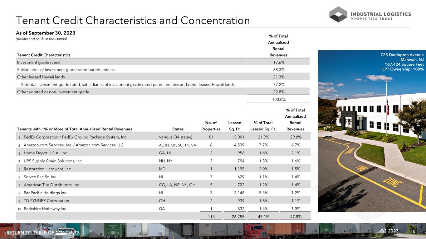 18Q3 2023RETURN TO TABLE OF CONTENTS As of September 30, 2023 % of Total Annualized Rental Tenant Credit Characteristics Revenues Investment grade rated 17.6% Subsidiaries of investment grade rated parent entities 38.3% Other leased Hawaii lands 21.3% Subtotal investment grade rated, subsidiaries of investment grade rated parent entities and other leased Hawaii lands 77.2% Other unrated or non-investment grade 22.8% 100.0% Tenant Credit Characteristics and Concentration 725 Darlington Avenue Mahwah, NJ 167,424 Square Feet ILPT Ownership: 100% % of Total Annualized No. of Leased % of Total Rental Tenants with 1% or More of Total Annualized Rental Revenues States Properties Sq. Ft. Leased Sq. Ft. Revenues 1 FedEx Corporation / FedEx Ground Package System, Inc. Various (34 states) 81 13,001 21.9% 29.8% 2 Amazon.com Services, Inc. / Amazon.com Services LLC AL, IN, OK, SC, TN, VA 8 4,539 7.7% 6.7% 3 Home Depot U.S.A., Inc. GA, HI 2 956 1.6% 2.1% 4 UPS Supply Chain Solutions, Inc. NH, NY 3 794 1.3% 1.6% 5 Restoration Hardware, Inc. MD 1 1,195 2.0% 1.5% 6 Servco Pacific, Inc. HI 7 629 1.1% 1.4% 7 American Tire Distributors, Inc. CO, LA, NE, NY, OH 5 722 1.2% 1.4% 8 Par Pacific Holdings Inc. HI 3 3,148 5.3% 1.2% 9 TD SYNNEX Corporation OH 2 939 1.6% 1.1% 10 Berkshire Hathaway Inc. GA 1 832 1.4% 1.0% 113 26,755 45.1% 47.8% (dollars and sq. ft. in thousands)