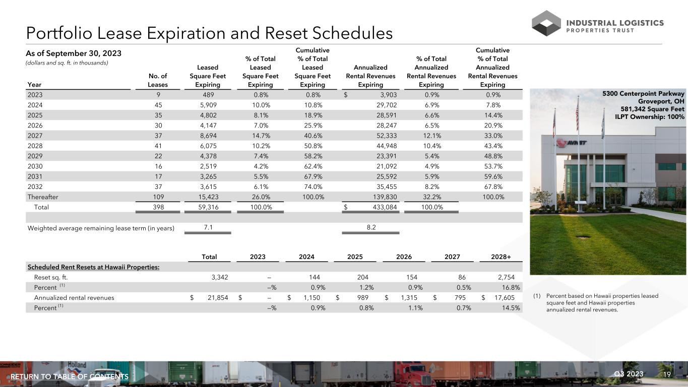 19Q3 2023RETURN TO TABLE OF CONTENTS Cumulative Cumulative % of Total % of Total % of Total % of Total Leased Leased Leased Annualized Annualized Annualized No. of Square Feet Square Feet Square Feet Rental Revenues Rental Revenues Rental Revenues Year Leases Expiring Expiring Expiring Expiring Expiring Expiring 2023 9 489 0.8% 0.8% $ 3,903 0.9% 0.9% 2024 45 5,909 10.0% 10.8% 29,702 6.9% 7.8% 2025 35 4,802 8.1% 18.9% 28,591 6.6% 14.4% 2026 30 4,147 7.0% 25.9% 28,247 6.5% 20.9% 2027 37 8,694 14.7% 40.6% 52,333 12.1% 33.0% 2028 41 6,075 10.2% 50.8% 44,948 10.4% 43.4% 2029 22 4,378 7.4% 58.2% 23,391 5.4% 48.8% 2030 16 2,519 4.2% 62.4% 21,092 4.9% 53.7% 2031 17 3,265 5.5% 67.9% 25,592 5.9% 59.6% 2032 37 3,615 6.1% 74.0% 35,455 8.2% 67.8% Thereafter 109 15,423 26.0% 100.0% 139,830 32.2% 100.0% Total 398 59,316 100.0% $ 433,084 100.0% Weighted average remaining lease term (in years) 7.1 8.2 Portfolio Lease Expiration and Reset Schedules (dollars and sq. ft. in thousands) As of September 30, 2023 5300 Centerpoint Parkway Groveport, OH 581,342 Square Feet ILPT Ownership: 100% Total 2023 2024 2025 2026 2027 2028+ Scheduled Rent Resets at Hawaii Properties: Reset sq. ft. 3,342 — 144 204 154 86 2,754 Percent (1) —% 0.9% 1.2% 0.9% 0.5% 16.8% Annualized rental revenues $ 21,854 $ — $ 1,150 $ 989 $ 1,315 $ 795 $ 17,605 Percent (1) —% 0.9% 0.8% 1.1% 0.7% 14.5% (1) Percent based on Hawaii properties leased square feet and Hawaii properties annualized rental revenues.