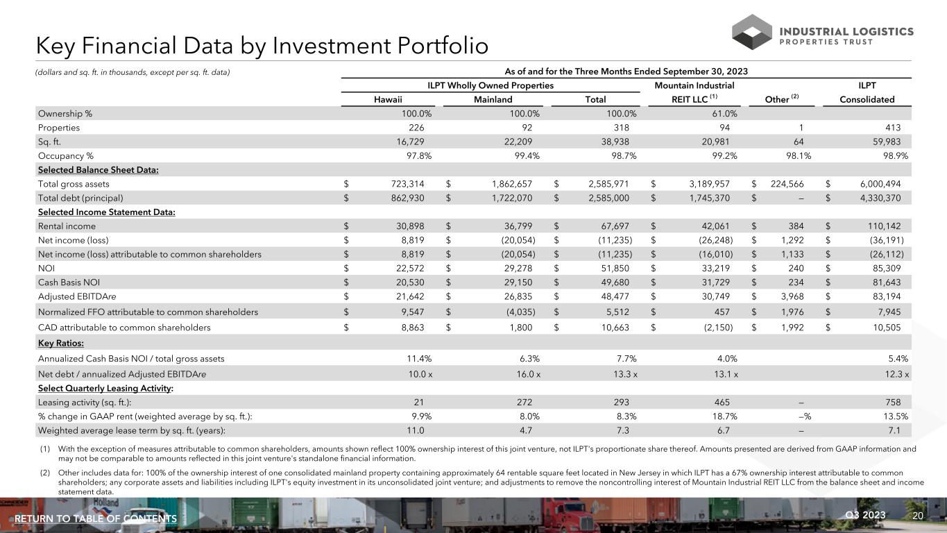 20Q3 2023RETURN TO TABLE OF CONTENTS (dollars and sq. ft. in thousands, except per sq. ft. data) Key Financial Data by Investment Portfolio As of and for the Three Months Ended September 30, 2023 ILPT Wholly Owned Properties Mountain Industrial ILPT Hawaii Mainland Total REIT LLC (1) Other (2) Consolidated Ownership % 100.0% 100.0% 100.0% 61.0% Properties 226 92 318 94 1 413 Sq. ft. 16,729 22,209 38,938 20,981 64 59,983 Occupancy % 97.8% 99.4% 98.7% 99.2% 98.1% 98.9% Selected Balance Sheet Data: Total gross assets $ 723,314 $ 1,862,657 $ 2,585,971 $ 3,189,957 $ 224,566 $ 6,000,494 Total debt (principal) $ 862,930 $ 1,722,070 $ 2,585,000 $ 1,745,370 $ — $ 4,330,370 Selected Income Statement Data: Rental income $ 30,898 $ 36,799 $ 67,697 $ 42,061 $ 384 $ 110,142 Net income (loss) $ 8,819 $ (20,054) $ (11,235) $ (26,248) $ 1,292 $ (36,191) Net income (loss) attributable to common shareholders $ 8,819 $ (20,054) $ (11,235) $ (16,010) $ 1,133 $ (26,112) NOI $ 22,572 $ 29,278 $ 51,850 $ 33,219 $ 240 $ 85,309 Cash Basis NOI $ 20,530 $ 29,150 $ 49,680 $ 31,729 $ 234 $ 81,643 Adjusted EBITDAre $ 21,642 $ 26,835 $ 48,477 $ 30,749 $ 3,968 $ 83,194 Normalized FFO attributable to common shareholders $ 9,547 $ (4,035) $ 5,512 $ 457 $ 1,976 $ 7,945 CAD attributable to common shareholders $ 8,863 $ 1,800 $ 10,663 $ (2,150) $ 1,992 $ 10,505 Key Ratios: Annualized Cash Basis NOI / total gross assets 11.4% 6.3% 7.7% 4.0% 5.4% Net debt / annualized Adjusted EBITDAre 10.0 x 16.0 x 13.3 x 13.1 x 12.3 x Select Quarterly Leasing Activity: Leasing activity (sq. ft.): 21 272 293 465 — 758 % change in GAAP rent (weighted average by sq. ft.): 9.9% 8.0% 8.3% 18.7% —% 13.5% Weighted average lease term by sq. ft. (years): 11.0 4.7 7.3 6.7 — 7.1 (1) With the exception of measures attributable to common shareholders, amounts shown reflect 100% ownership interest of this joint venture, not ILPT's proportionate share thereof. Amounts presented are derived from GAAP information and may not be comparable to amounts reflected in this joint venture's standalone financial information. (2) Other includes data for: 100% of the ownership interest of one consolidated mainland property containing approximately 64 rentable square feet located in New Jersey in which ILPT has a 67% ownership interest attributable to common shareholders; any corporate assets and liabilities including ILPT's equity investment in its unconsolidated joint venture; and adjustments to remove the noncontrolling interest of Mountain Industrial REIT LLC from the balance sheet and income statement data.