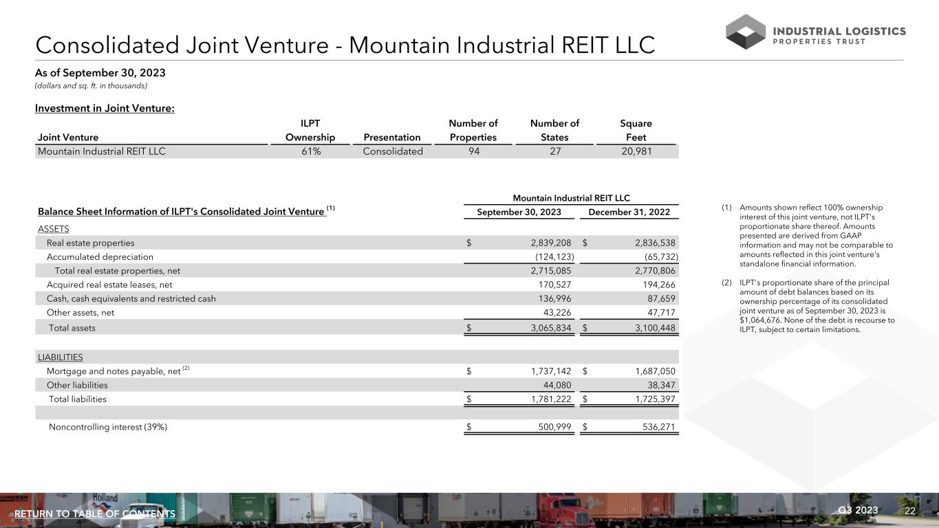 22Q3 2023RETURN TO TABLE OF CONTENTS Consolidated Joint Venture - Mountain Industrial REIT LLC (dollars and sq. ft. in thousands) Investment in Joint Venture: ILPT Number of Number of Square Joint Venture Ownership Presentation Properties States Feet Mountain Industrial REIT LLC 61% Consolidated 94 27 20,981 (1) Amounts shown reflect 100% ownership interest of this joint venture, not ILPT's proportionate share thereof. Amounts presented are derived from GAAP information and may not be comparable to amounts reflected in this joint venture's standalone financial information. (2) ILPT's proportionate share of the principal amount of debt balances based on its ownership percentage of its consolidated joint venture as of September 30, 2023 is $1,064,676. None of the debt is recourse to ILPT, subject to certain limitations. As of September 30, 2023 Mountain Industrial REIT LLC Balance Sheet Information of ILPT's Consolidated Joint Venture (1) September 30, 2023 December 31, 2022 ASSETS Real estate properties $ 2,839,208 $ 2,836,538 Accumulated depreciation (124,123) (65,732) Total real estate properties, net 2,715,085 2,770,806 Acquired real estate leases, net 170,527 194,266 Cash, cash equivalents and restricted cash 136,996 87,659 Other assets, net 43,226 47,717 Total assets $ 3,065,834 $ 3,100,448 LIABILITIES Mortgage and notes payable, net (2) $ 1,737,142 $ 1,687,050 Other liabilities 44,080 38,347 Total liabilities $ 1,781,222 $ 1,725,397 Noncontrolling interest (39%) $ 500,999 $ 536,271