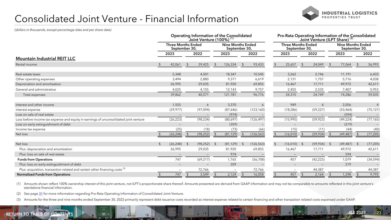 23Q3 2023RETURN TO TABLE OF CONTENTS Consolidated Joint Venture - Financial Information Operating Information of the Consolidated Joint Venture (100%) (1) Pro-Rata Operating Information of the Consolidated Joint Venture (ILPT Share) (2) Three Months Ended September 30, Nine Months Ended September 30, Three Months Ended September 30, Nine Months Ended September 30, 2023 2022 2023 2022 2023 2022 2023 2022 Mountain Industrial REIT LLC Rental income $ 42,061 $ 39,425 $ 126,334 $ 93,433 $ 25,657 $ 24,049 $ 77,064 $ 56,993 Real estate taxes 5,348 4,501 18,347 10,545 3,262 2,746 11,191 6,433 Other operating expenses 3,494 2,880 9,371 6,619 2,131 1,757 5,716 4,038 Depreciation and amortization 26,995 29,035 81,920 69,855 16,467 17,711 49,972 42,611 General and administrative 4,025 4,155 12,143 9,757 2,455 2,535 7,407 5,953 Total expenses 39,862 40,571 121,781 96,776 24,315 24,749 74,286 59,035 Interest and other income 1,555 6 3,370 6 949 4 2,056 4 Interest expense (29,977) (97,094) (87,646) (123,160) (18,286) (59,227) (53,464) (75,127) Loss on sale of real estate — — (974) — — — (594) — Loss before income tax expense and equity in earnings of unconsolidated joint venture (26,223) (98,234) (80,697) (126,497) (15,995) (59,923) (49,224) (77,165) Loss on early extinguishment of debt — — (359) — — — (219) — Income tax expense (25) (18) (73) (66) (15) (11) (44) (40) Net loss $ (26,248) $ (98,252) $ (81,129) $ (126,563) $ (16,010) $ (59,934) $ (49,487) $ (77,205) Net loss $ (26,248) $ (98,252) $ (81,129) $ (126,563) $ (16,010) $ (59,934) $ (49,487) $ (77,205) Plus: depreciation and amortization 26,995 29,035 81,920 69,855 16,467 17,711 49,972 42,611 Plus: loss on sale of real estate — — 974 — — — 594 — Funds from Operations 747 (69,217) 1,765 (56,708) 457 (42,223) 1,079 (34,594) Plus: loss on early extinguishment of debt — — 359 — — — 219 — Plus: acquisition, transaction related and certain other financing costs (3) — 72,766 — 72,766 — 44,387 — 44,387 Normalized Funds from Operations $ 747 $ 3,549 $ 2,124 $ 16,058 $ 457 $ 2,164 $ 1,298 $ 9,793 (dollars in thousands, except percentage data and per share data) (1) Amounts shown reflect 100% ownership interest of this joint venture, not ILPT's proportionate share thereof. Amounts presented are derived from GAAP information and may not be comparable to amounts reflected in this joint venture's standalone financial information. (2) See page 31 for more information regarding Pro-Rata Operating Information of Consolidated Joint Venture. (3) Amounts for the three and nine months ended September 30, 2022 primarily represent debt issuance costs recorded as interest expense related to certain financing and other transaction related costs expensed under GAAP.