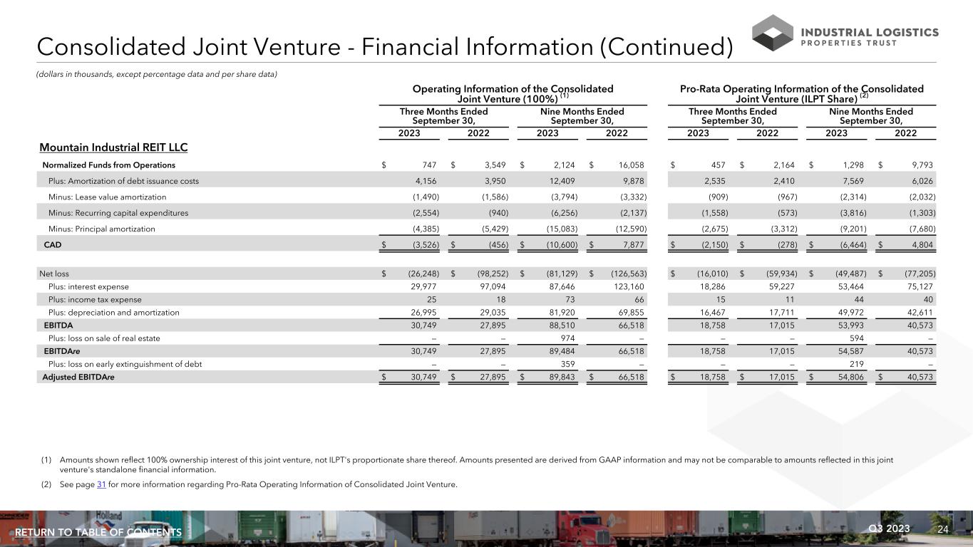 24Q3 2023RETURN TO TABLE OF CONTENTS Consolidated Joint Venture - Financial Information (Continued) Operating Information of the Consolidated Joint Venture (100%) (1) Pro-Rata Operating Information of the Consolidated Joint Venture (ILPT Share) (2) Three Months Ended September 30, Nine Months Ended September 30, Three Months Ended September 30, Nine Months Ended September 30, 2023 2022 2023 2022 2023 2022 2023 2022 Mountain Industrial REIT LLC Normalized Funds from Operations $ 747 $ 3,549 $ 2,124 $ 16,058 $ 457 $ 2,164 $ 1,298 $ 9,793 Plus: Amortization of debt issuance costs 4,156 3,950 12,409 9,878 2,535 2,410 7,569 6,026 Minus: Lease value amortization (1,490) (1,586) (3,794) (3,332) (909) (967) (2,314) (2,032) Minus: Recurring capital expenditures (2,554) (940) (6,256) (2,137) (1,558) (573) (3,816) (1,303) Minus: Principal amortization (4,385) (5,429) (15,083) (12,590) (2,675) (3,312) (9,201) (7,680) CAD $ (3,526) $ (456) $ (10,600) $ 7,877 $ (2,150) $ (278) $ (6,464) $ 4,804 Net loss $ (26,248) $ (98,252) $ (81,129) $ (126,563) $ (16,010) $ (59,934) $ (49,487) $ (77,205) Plus: interest expense 29,977 97,094 87,646 123,160 18,286 59,227 53,464 75,127 Plus: income tax expense 25 18 73 66 15 11 44 40 Plus: depreciation and amortization 26,995 29,035 81,920 69,855 16,467 17,711 49,972 42,611 EBITDA 30,749 27,895 88,510 66,518 18,758 17,015 53,993 40,573 Plus: loss on sale of real estate — — 974 — — — 594 — EBITDAre 30,749 27,895 89,484 66,518 18,758 17,015 54,587 40,573 Plus: loss on early extinguishment of debt — — 359 — — — 219 — Adjusted EBITDAre $ 30,749 $ 27,895 $ 89,843 $ 66,518 $ 18,758 $ 17,015 $ 54,806 $ 40,573 (dollars in thousands, except percentage data and per share data) (1) Amounts shown reflect 100% ownership interest of this joint venture, not ILPT's proportionate share thereof. Amounts presented are derived from GAAP information and may not be comparable to amounts reflected in this joint venture's standalone financial information. (2) See page 31 for more information regarding Pro-Rata Operating Information of Consolidated Joint Venture.