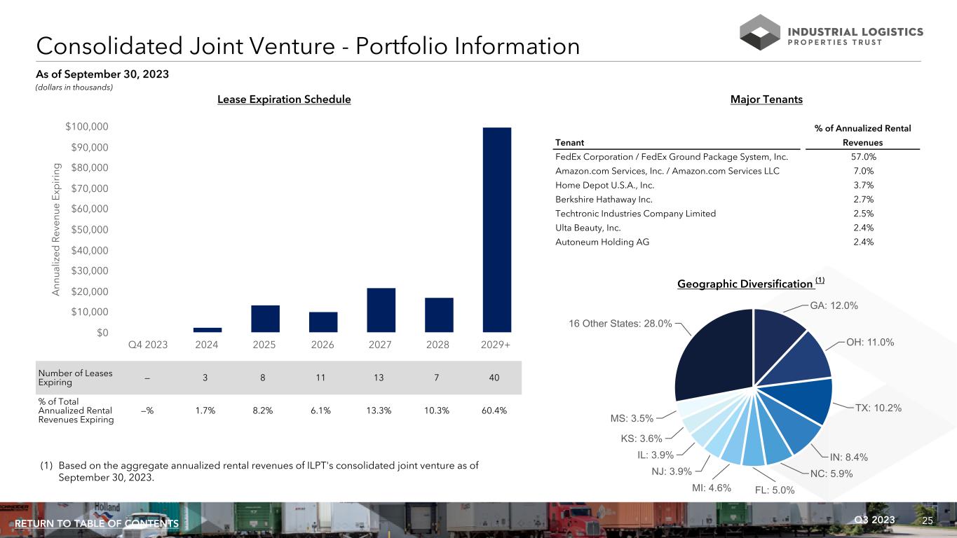 25Q3 2023RETURN TO TABLE OF CONTENTS GA: 12.0% OH: 11.0% TX: 10.2% IN: 8.4% NC: 5.9% FL: 5.0%MI: 4.6% NJ: 3.9% IL: 3.9% KS: 3.6% MS: 3.5% 16 Other States: 28.0% Consolidated Joint Venture - Portfolio Information (dollars in thousands) Number of Leases Expiring — 3 8 11 13 7 40 % of Total Annualized Rental Revenues Expiring —% 1.7% 8.2% 6.1% 13.3% 10.3% 60.4% A nn ua liz ed R ev en ue E xp ir in g Q4 2023 2024 2025 2026 2027 2028 2029+ $0 $10,000 $20,000 $30,000 $40,000 $50,000 $60,000 $70,000 $80,000 $90,000 $100,000 Lease Expiration Schedule As of September 30, 2023 Major Tenants % of Annualized Rental Tenant Revenues FedEx Corporation / FedEx Ground Package System, Inc. 57.0% Amazon.com Services, Inc. / Amazon.com Services LLC 7.0% Home Depot U.S.A., Inc. 3.7% Berkshire Hathaway Inc. 2.7% Techtronic Industries Company Limited 2.5% Ulta Beauty, Inc. 2.4% Autoneum Holding AG 2.4% Geographic Diversification (1) (1) Based on the aggregate annualized rental revenues of ILPT's consolidated joint venture as of September 30, 2023.