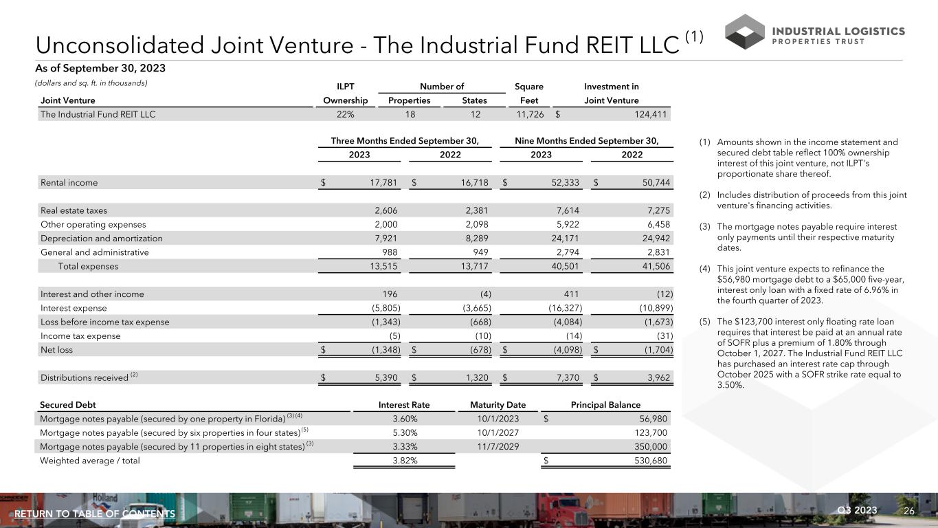 26Q3 2023RETURN TO TABLE OF CONTENTS Unconsolidated Joint Venture - The Industrial Fund REIT LLC (1) As of September 30, 2023 ILPT Number of Square Investment in Joint Venture Ownership Properties States Feet Joint Venture The Industrial Fund REIT LLC 22% 18 12 11,726 $ 124,411 Three Months Ended September 30, Nine Months Ended September 30, 2023 2022 2023 2022 Rental income $ 17,781 $ 16,718 $ 52,333 $ 50,744 Real estate taxes 2,606 2,381 7,614 7,275 Other operating expenses 2,000 2,098 5,922 6,458 Depreciation and amortization 7,921 8,289 24,171 24,942 General and administrative 988 949 2,794 2,831 Total expenses 13,515 13,717 40,501 41,506 Interest and other income 196 (4) 411 (12) Interest expense (5,805) (3,665) (16,327) (10,899) Loss before income tax expense (1,343) (668) (4,084) (1,673) Income tax expense (5) (10) (14) (31) Net loss $ (1,348) $ (678) $ (4,098) $ (1,704) Distributions received (2) $ 5,390 $ 1,320 $ 7,370 $ 3,962 Secured Debt Interest Rate Maturity Date Principal Balance Mortgage notes payable (secured by one property in Florida) (3) (4) 3.60% 10/1/2023 $ 56,980 Mortgage notes payable (secured by six properties in four states) (5) 5.30% 10/1/2027 123,700 Mortgage notes payable (secured by 11 properties in eight states) (3) 3.33% 11/7/2029 350,000 Weighted average / total 3.82% $ 530,680 (1) Amounts shown in the income statement and secured debt table reflect 100% ownership interest of this joint venture, not ILPT's proportionate share thereof. (2) Includes distribution of proceeds from this joint venture's financing activities. (3) The mortgage notes payable require interest only payments until their respective maturity dates. (4) This joint venture expects to refinance the $56,980 mortgage debt to a $65,000 five-year, interest only loan with a fixed rate of 6.96% in the fourth quarter of 2023. (5) The $123,700 interest only floating rate loan requires that interest be paid at an annual rate of SOFR plus a premium of 1.80% through October 1, 2027. The Industrial Fund REIT LLC has purchased an interest rate cap through October 2025 with a SOFR strike rate equal to 3.50%. (dollars and sq. ft. in thousands)