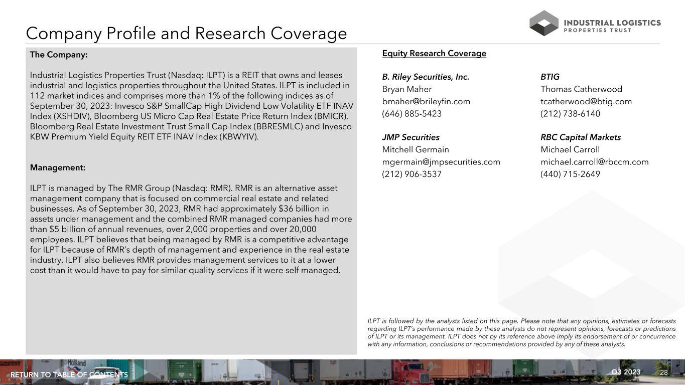 28Q3 2023RETURN TO TABLE OF CONTENTS Company Profile and Research Coverage The Company: Industrial Logistics Properties Trust (Nasdaq: ILPT) is a REIT that owns and leases industrial and logistics properties throughout the United States. ILPT is included in 112 market indices and comprises more than 1% of the following indices as of September 30, 2023: Invesco S&P SmallCap High Dividend Low Volatility ETF INAV Index (XSHDIV), Bloomberg US Micro Cap Real Estate Price Return Index (BMICR), Bloomberg Real Estate Investment Trust Small Cap Index (BBRESMLC) and Invesco KBW Premium Yield Equity REIT ETF INAV Index (KBWYIV). Management: ILPT is managed by The RMR Group (Nasdaq: RMR). RMR is an alternative asset management company that is focused on commercial real estate and related businesses. As of September 30, 2023, RMR had approximately $36 billion in assets under management and the combined RMR managed companies had more than $5 billion of annual revenues, over 2,000 properties and over 20,000 employees. ILPT believes that being managed by RMR is a competitive advantage for ILPT because of RMR’s depth of management and experience in the real estate industry. ILPT also believes RMR provides management services to it at a lower cost than it would have to pay for similar quality services if it were self managed. Equity Research Coverage B. Riley Securities, Inc. BTIG Bryan Maher Thomas Catherwood bmaher@brileyfin.com tcatherwood@btig.com (646) 885-5423 (212) 738-6140 JMP Securities RBC Capital Markets Mitchell Germain Michael Carroll mgermain@jmpsecurities.com michael.carroll@rbccm.com (212) 906-3537 (440) 715-2649 ILPT is followed by the analysts listed on this page. Please note that any opinions, estimates or forecasts regarding ILPT’s performance made by these analysts do not represent opinions, forecasts or predictions of ILPT or its management. ILPT does not by its reference above imply its endorsement of or concurrence with any information, conclusions or recommendations provided by any of these analysts.