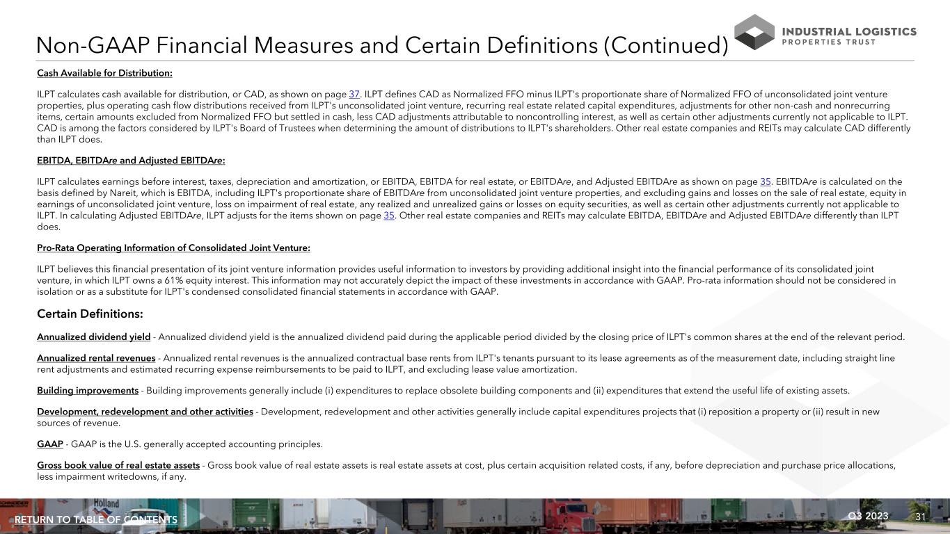 31Q3 2023RETURN TO TABLE OF CONTENTS Non-GAAP Financial Measures and Certain Definitions (Continued) Cash Available for Distribution: ILPT calculates cash available for distribution, or CAD, as shown on page 37. ILPT defines CAD as Normalized FFO minus ILPT's proportionate share of Normalized FFO of unconsolidated joint venture properties, plus operating cash flow distributions received from ILPT's unconsolidated joint venture, recurring real estate related capital expenditures, adjustments for other non-cash and nonrecurring items, certain amounts excluded from Normalized FFO but settled in cash, less CAD adjustments attributable to noncontrolling interest, as well as certain other adjustments currently not applicable to ILPT. CAD is among the factors considered by ILPT's Board of Trustees when determining the amount of distributions to ILPT's shareholders. Other real estate companies and REITs may calculate CAD differently than ILPT does. EBITDA, EBITDAre and Adjusted EBITDAre: ILPT calculates earnings before interest, taxes, depreciation and amortization, or EBITDA, EBITDA for real estate, or EBITDAre, and Adjusted EBITDAre as shown on page 35. EBITDAre is calculated on the basis defined by Nareit, which is EBITDA, including ILPT's proportionate share of EBITDAre from unconsolidated joint venture properties, and excluding gains and losses on the sale of real estate, equity in earnings of unconsolidated joint venture, loss on impairment of real estate, any realized and unrealized gains or losses on equity securities, as well as certain other adjustments currently not applicable to ILPT. In calculating Adjusted EBITDAre, ILPT adjusts for the items shown on page 35. Other real estate companies and REITs may calculate EBITDA, EBITDAre and Adjusted EBITDAre differently than ILPT does. Pro-Rata Operating Information of Consolidated Joint Venture: ILPT believes this financial presentation of its joint venture information provides useful information to investors by providing additional insight into the financial performance of its consolidated joint venture, in which ILPT owns a 61% equity interest. This information may not accurately depict the impact of these investments in accordance with GAAP. Pro-rata information should not be considered in isolation or as a substitute for ILPT's condensed consolidated financial statements in accordance with GAAP. Certain Definitions: Annualized dividend yield - Annualized dividend yield is the annualized dividend paid during the applicable period divided by the closing price of ILPT's common shares at the end of the relevant period. Annualized rental revenues - Annualized rental revenues is the annualized contractual base rents from ILPT's tenants pursuant to its lease agreements as of the measurement date, including straight line rent adjustments and estimated recurring expense reimbursements to be paid to ILPT, and excluding lease value amortization. Building improvements - Building improvements generally include (i) expenditures to replace obsolete building components and (ii) expenditures that extend the useful life of existing assets. Development, redevelopment and other activities - Development, redevelopment and other activities generally include capital expenditures projects that (i) reposition a property or (ii) result in new sources of revenue. GAAP - GAAP is the U.S. generally accepted accounting principles. Gross book value of real estate assets - Gross book value of real estate assets is real estate assets at cost, plus certain acquisition related costs, if any, before depreciation and purchase price allocations, less impairment writedowns, if any.